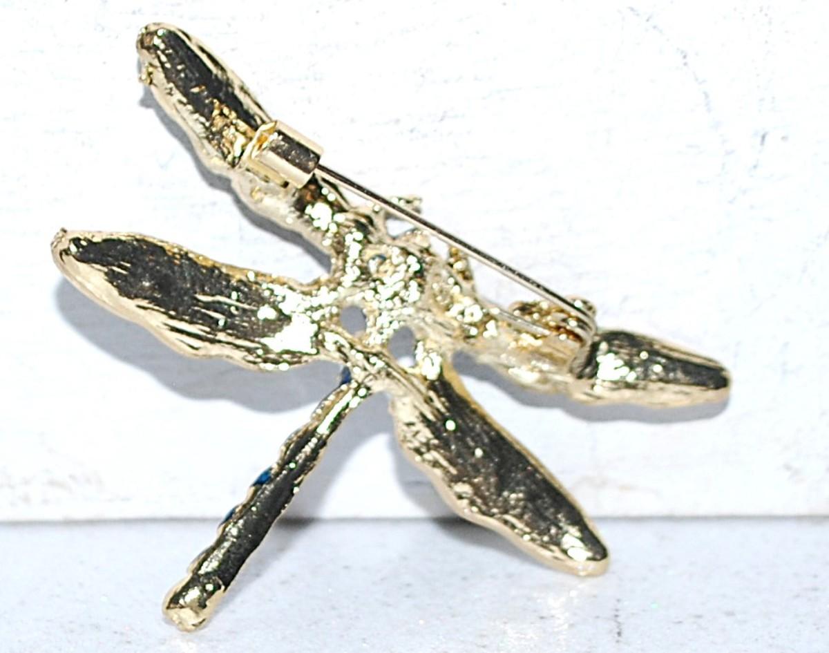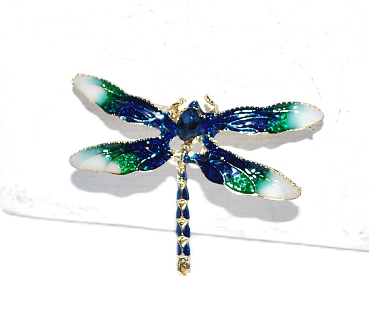 BLUE, GREEN & WHITE Enameled DRAGONFLY BROOCH (1¾" x 1½") on a Gold Tone Setting