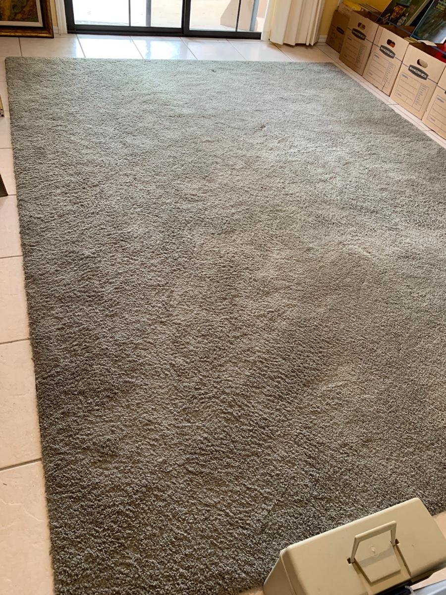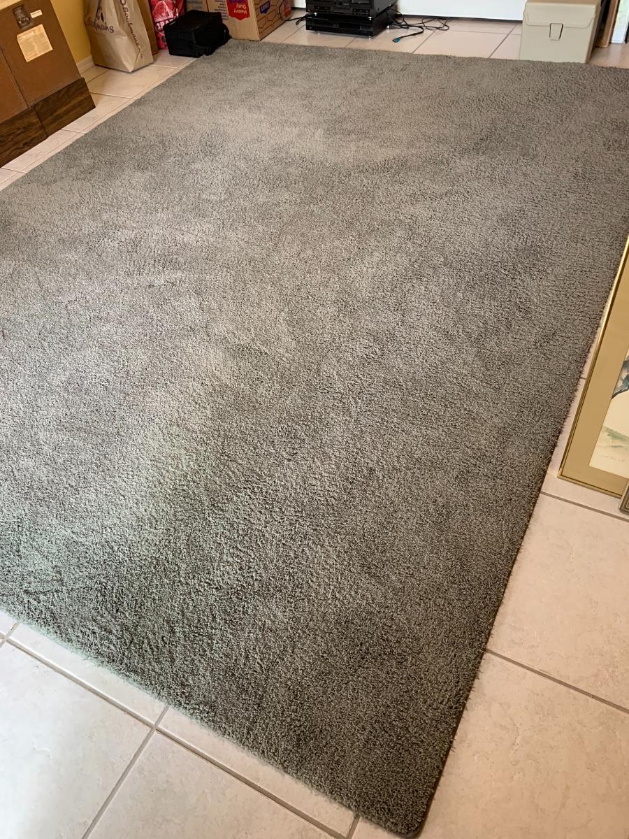 8 ft x 10 ft bluish grey carpet rug in good condition, no stains or discoloration visible.