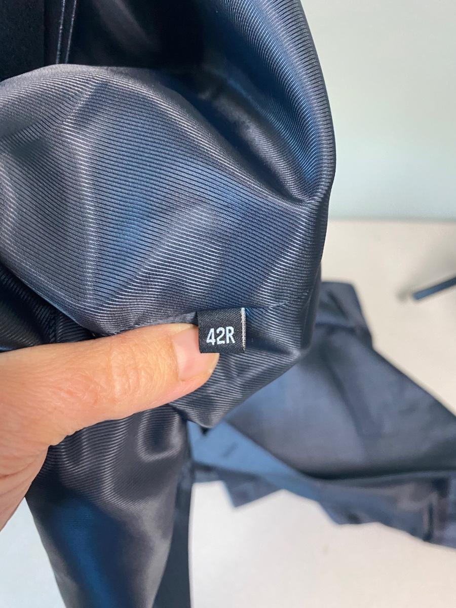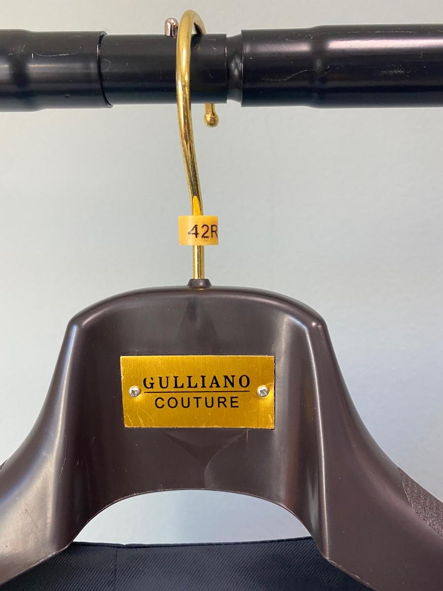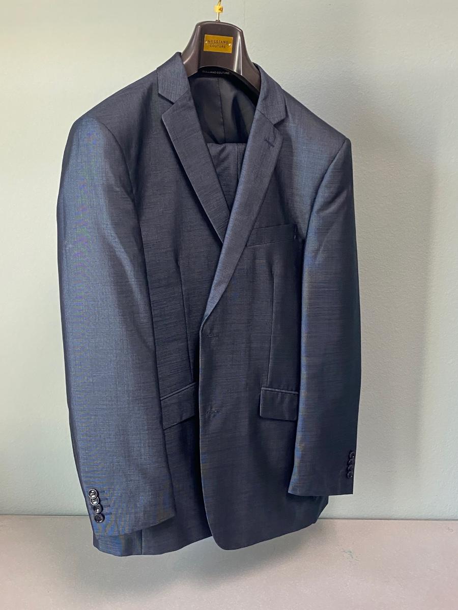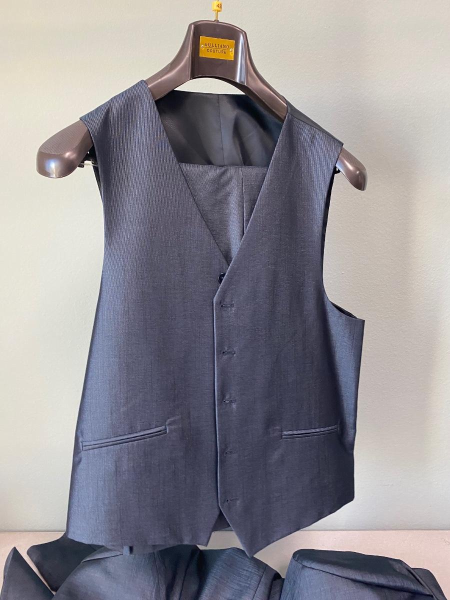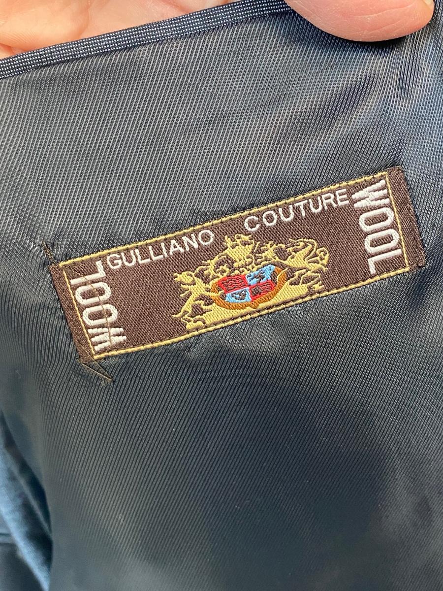 Blue Gulliano Couture 3 Piece Wool Suit 42R. No size tags on any of the pieces except inside the vest and on the hanger. In good condition, there is a spot on sleeve of coat, may just need to go to cleaners.