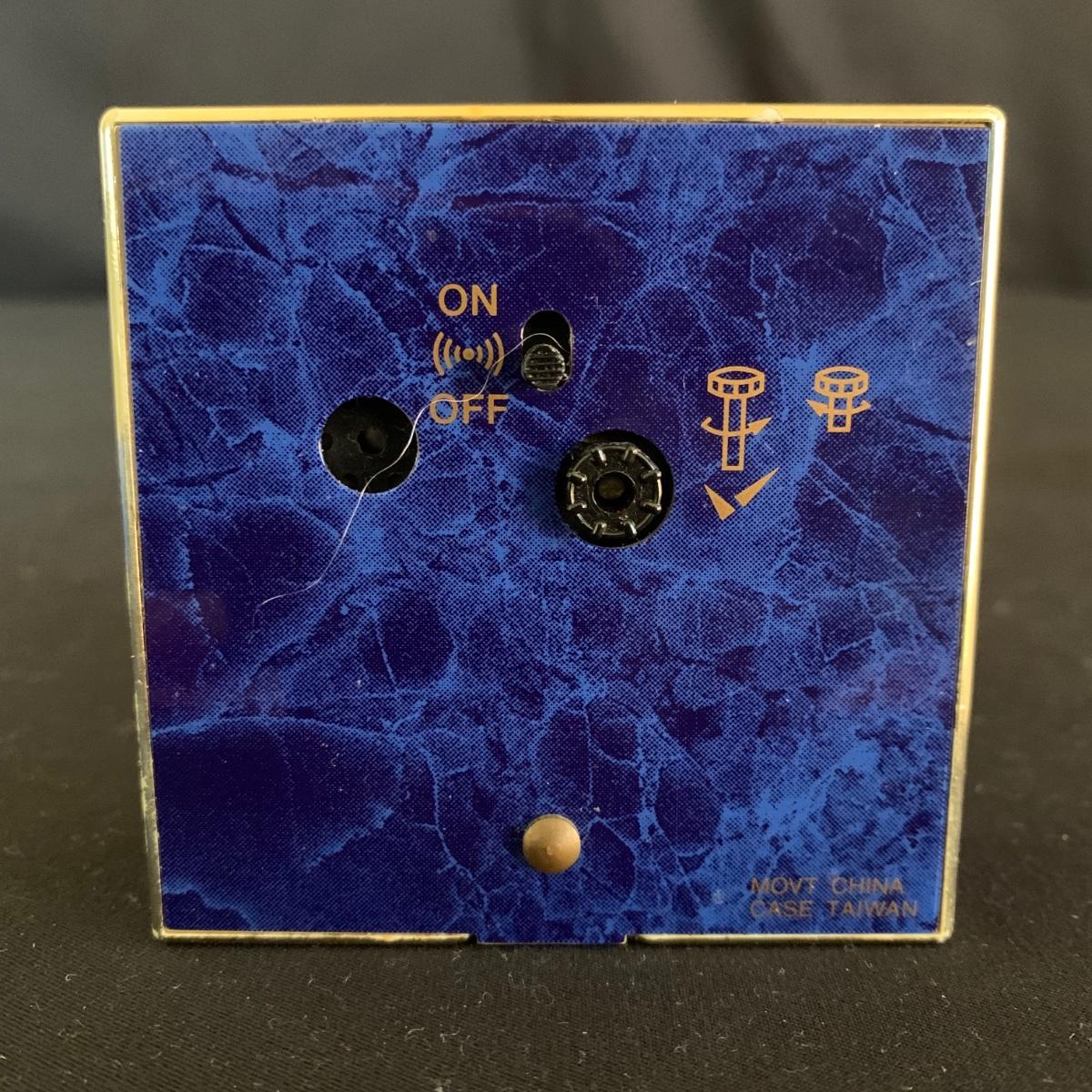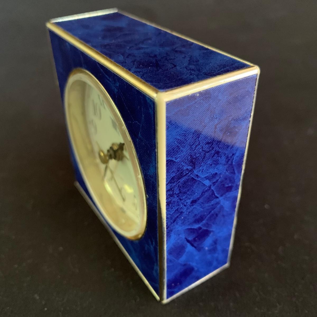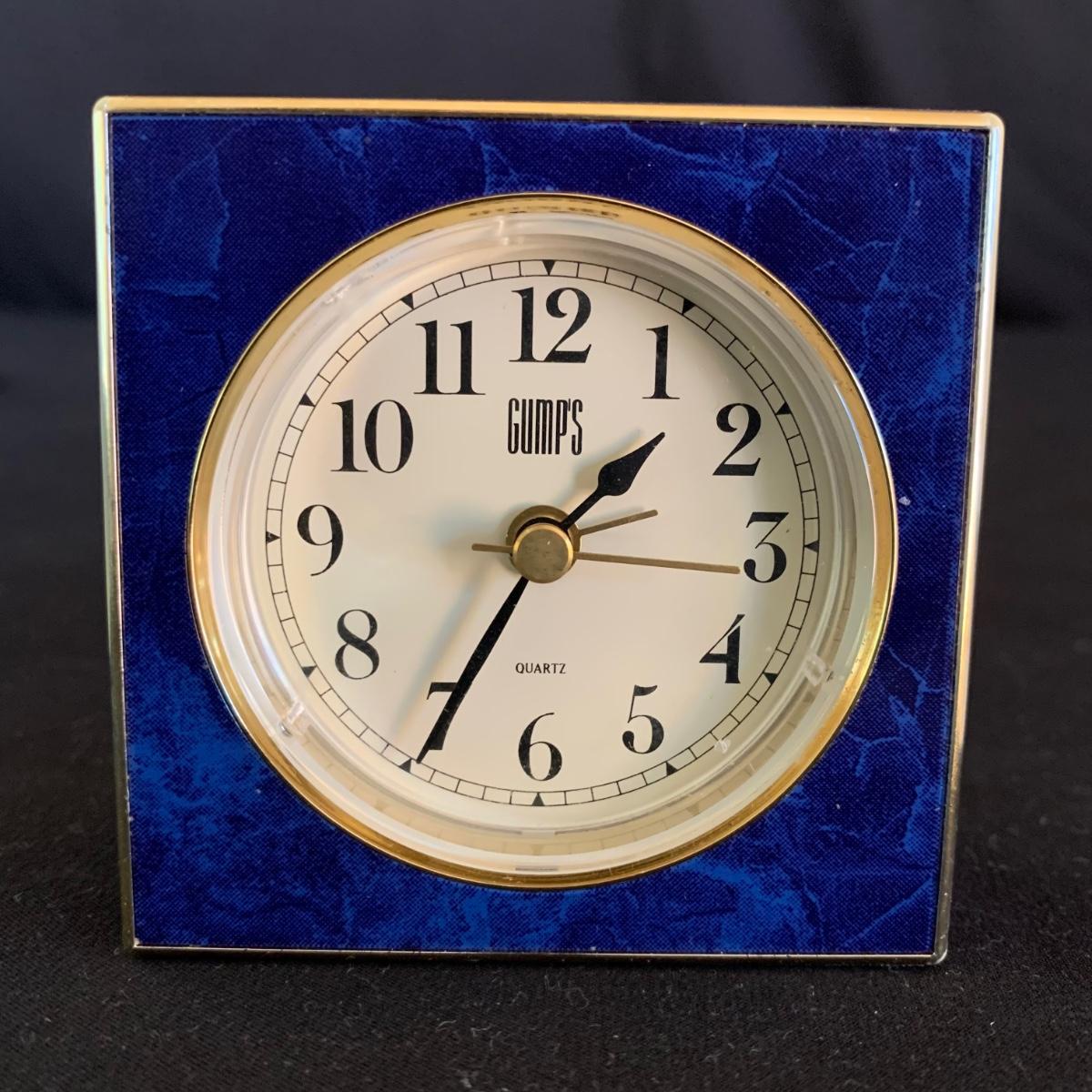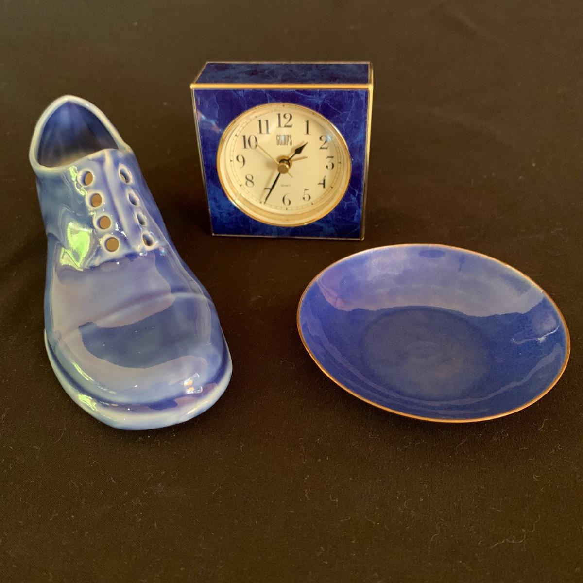 Lot includes two Gump’s Clocks and two unique blue decor items. A square Gump’s quartz alarm clock with a marbled cobalt blue design. Measures 3” x 1.5” x 3”. It functions and is currently ticking. The round brass clock is also currently working. A stunning Moissiadis Greece handmade, enameled, hammered copper trinket dish, 3.5”D. And a blue ceramic shoe. All items are in very good condition.