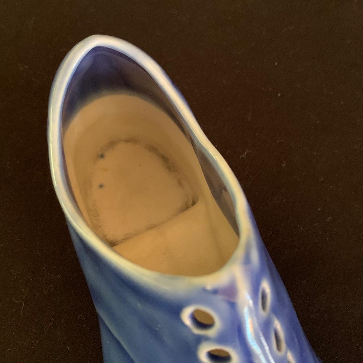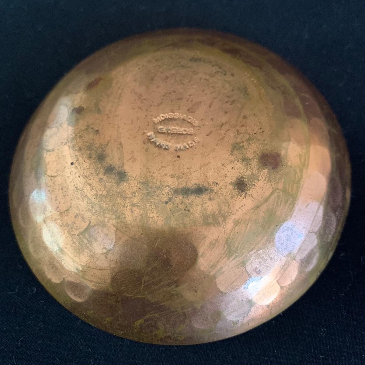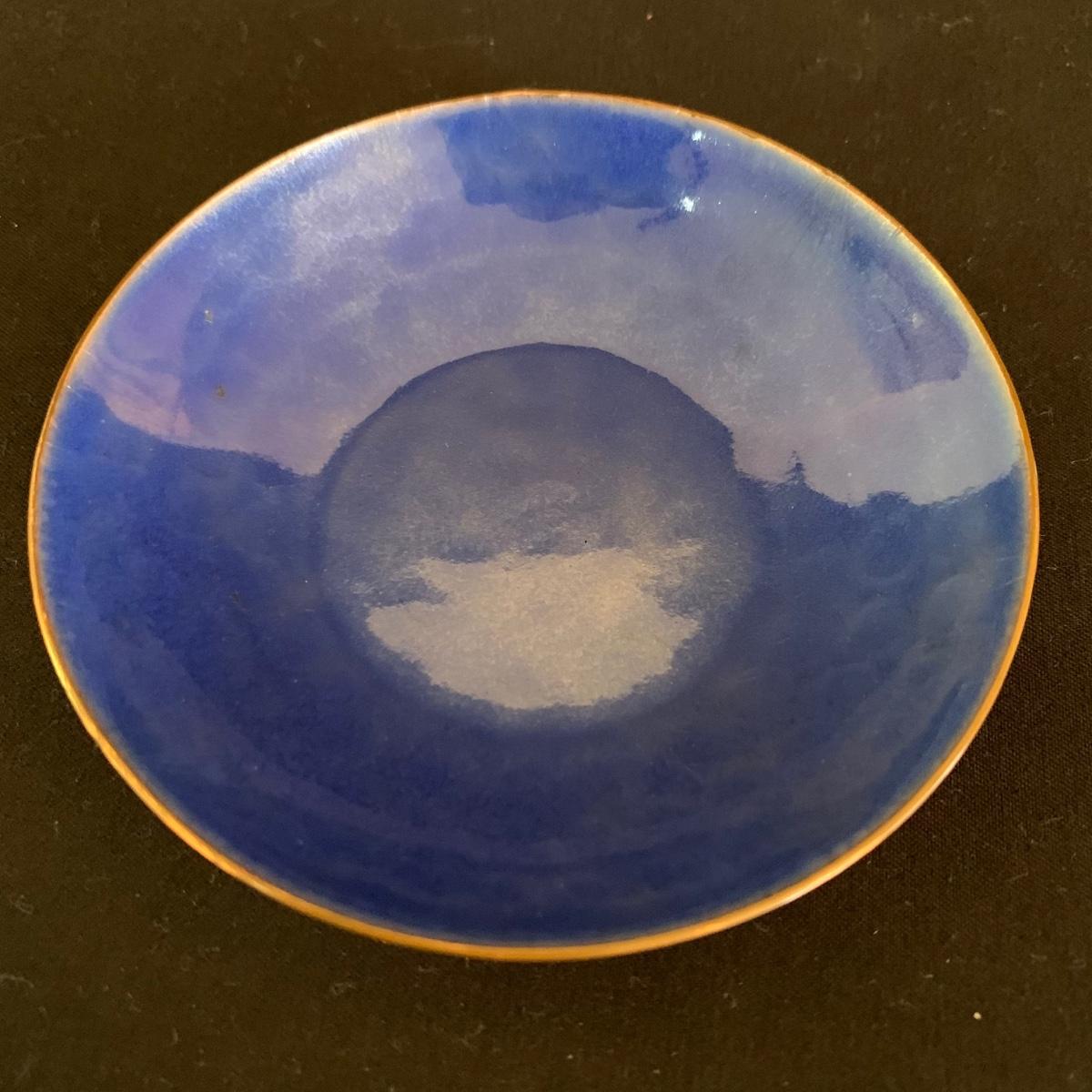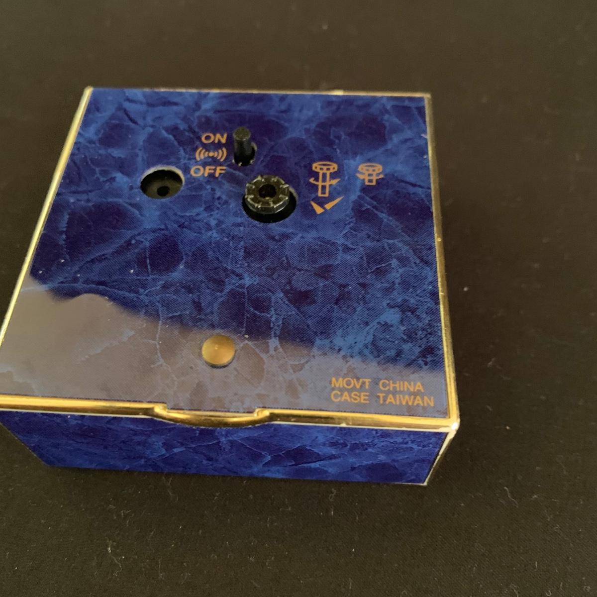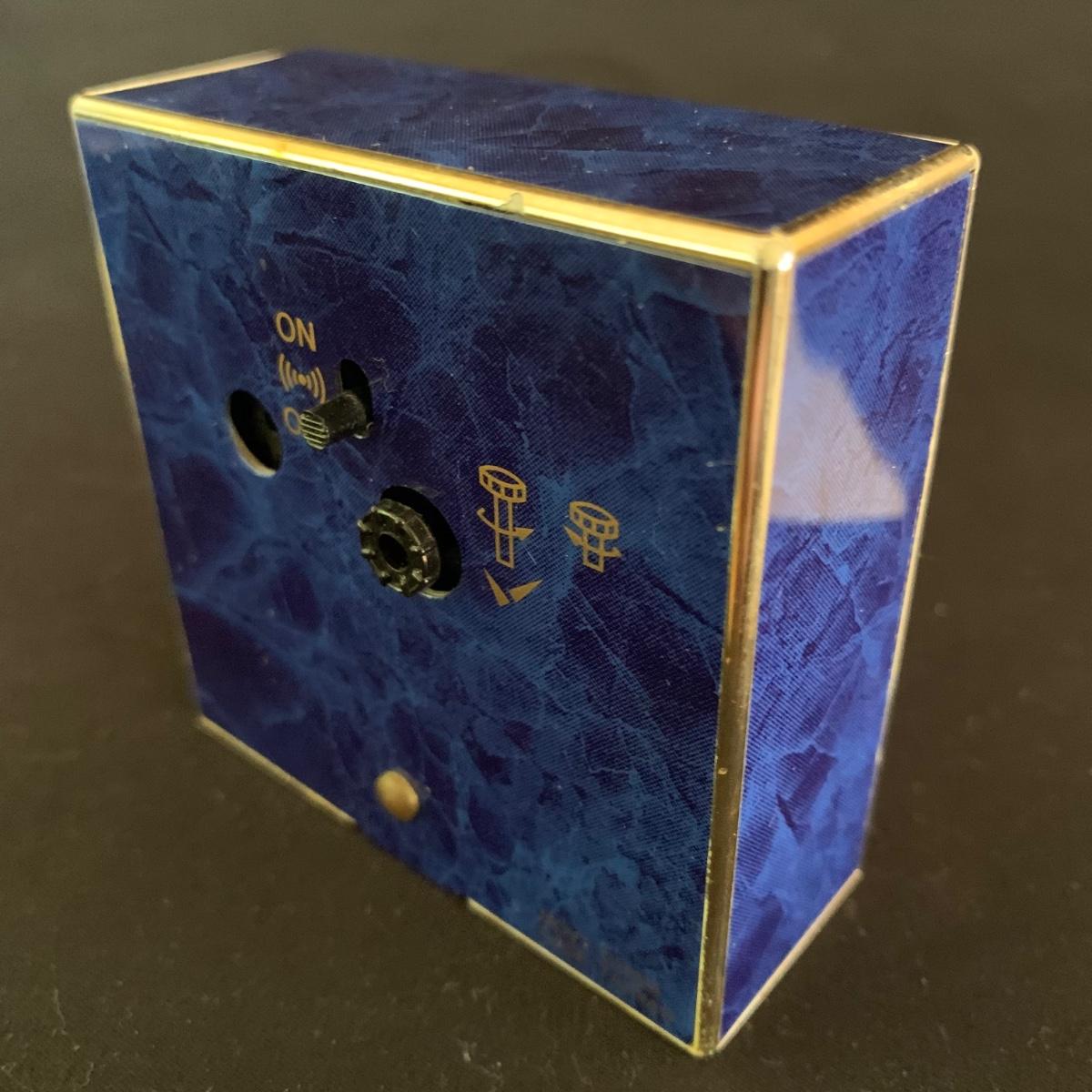 Lot includes two Gump’s Clocks and two unique blue decor items. A square Gump’s quartz alarm clock with a marbled cobalt blue design. Measures 3” x 1.5” x 3”. It functions and is currently ticking. The round brass clock is also currently working. A stunning Moissiadis Greece handmade, enameled, hammered copper trinket dish, 3.5”D. And a blue ceramic shoe. All items are in very good condition.