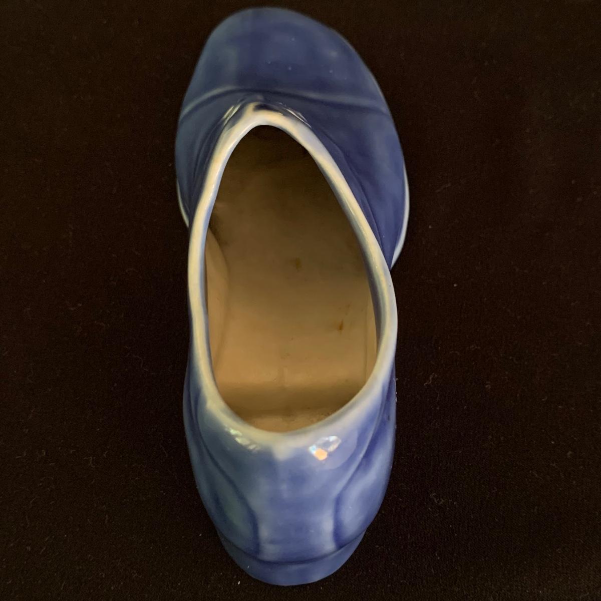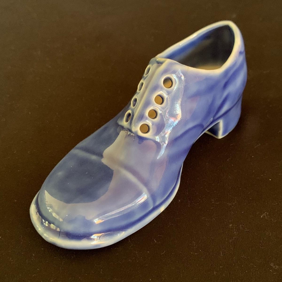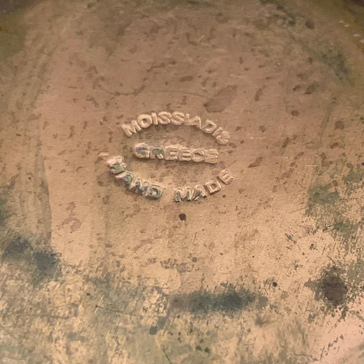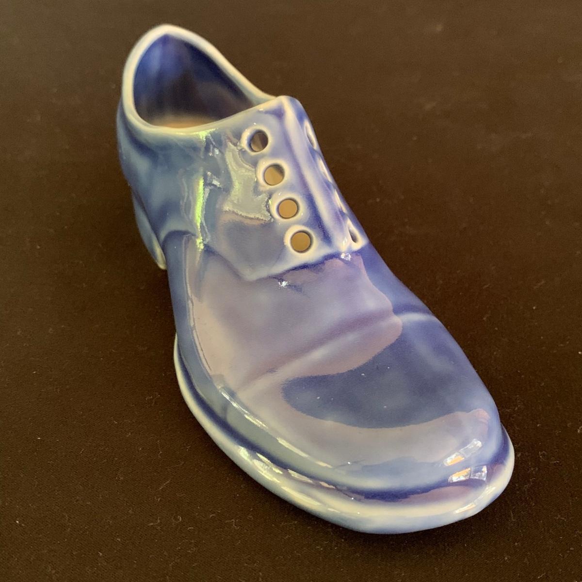 Lot includes two Gump’s Clocks and two unique blue decor items. A square Gump’s quartz alarm clock with a marbled cobalt blue design. Measures 3” x 1.5” x 3”. It functions and is currently ticking. The round brass clock is also currently working. A stunning Moissiadis Greece handmade, enameled, hammered copper trinket dish, 3.5”D. And a blue ceramic shoe. All items are in very good condition.