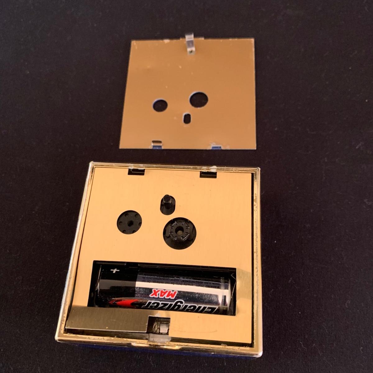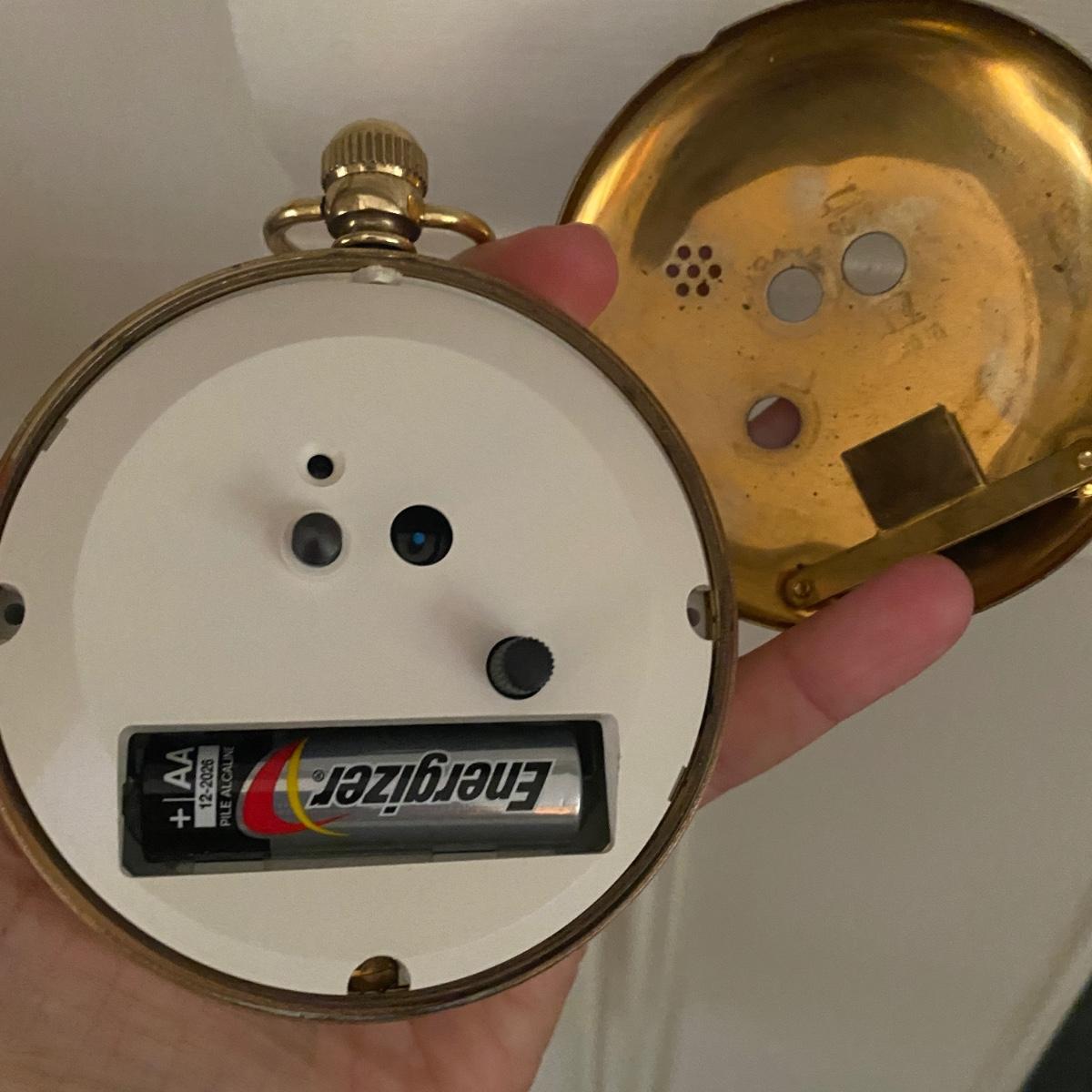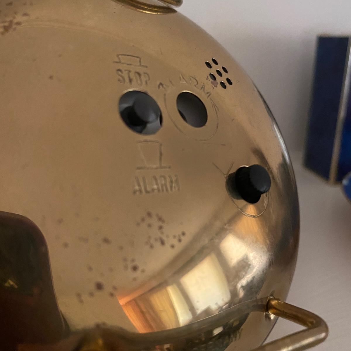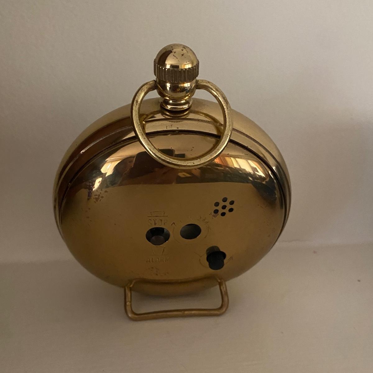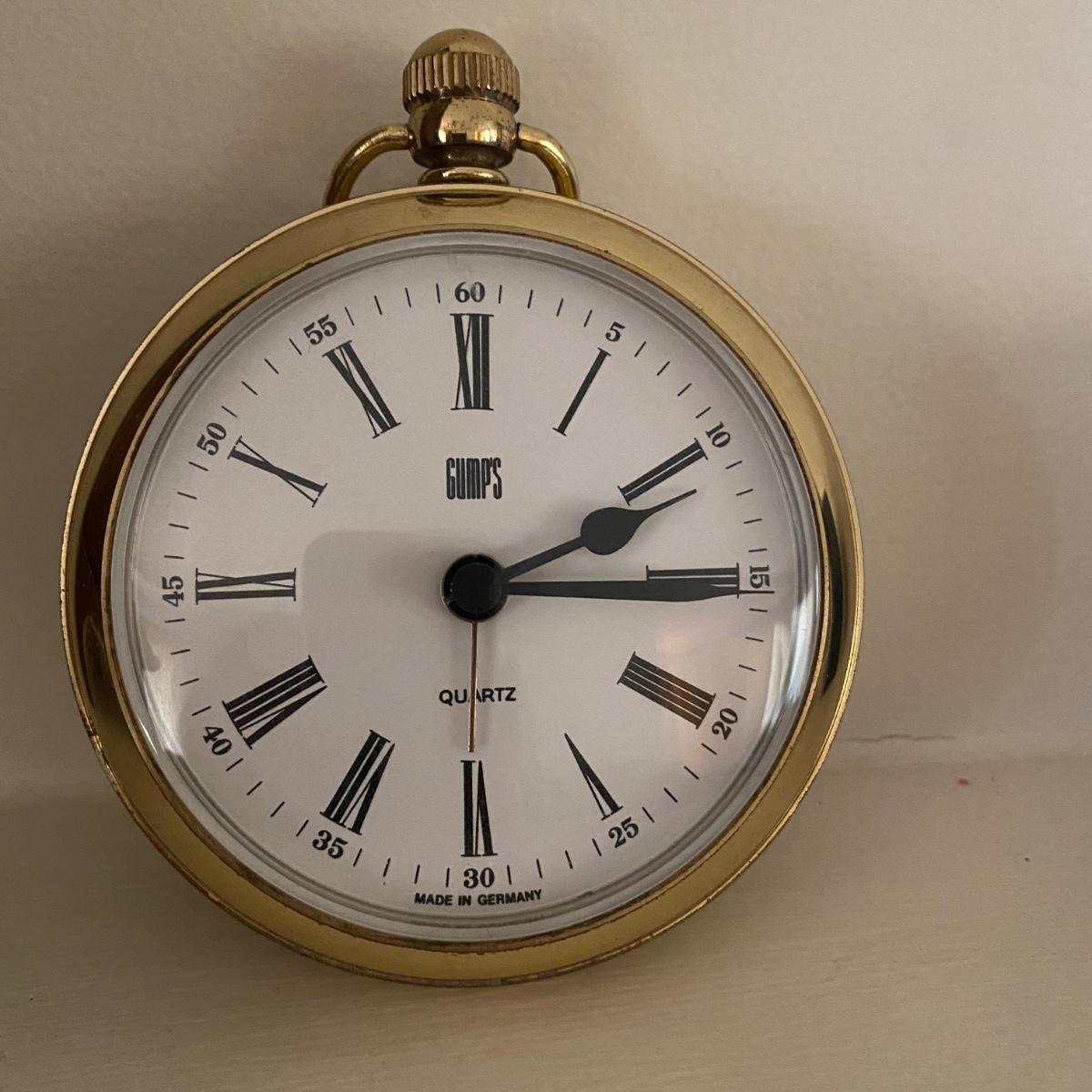Lot includes two Gump’s Clocks and two unique blue decor items. A square Gump’s quartz alarm clock with a marbled cobalt blue design. Measures 3” x 1.5” x 3”. It functions and is currently ticking. The round brass clock is also currently working. A stunning Moissiadis Greece handmade, enameled, hammered copper trinket dish, 3.5”D. And a blue ceramic shoe. All items are in very good condition.