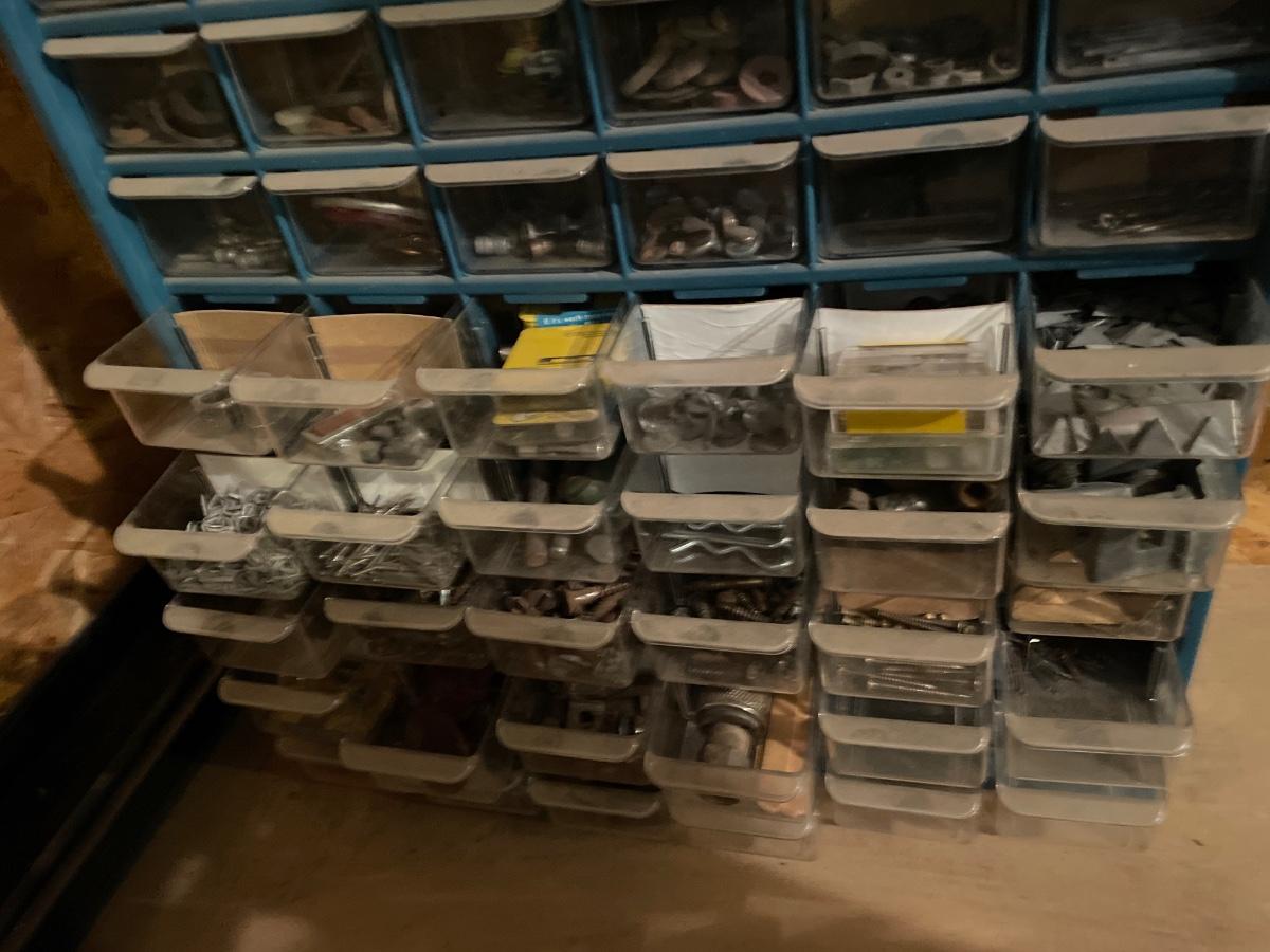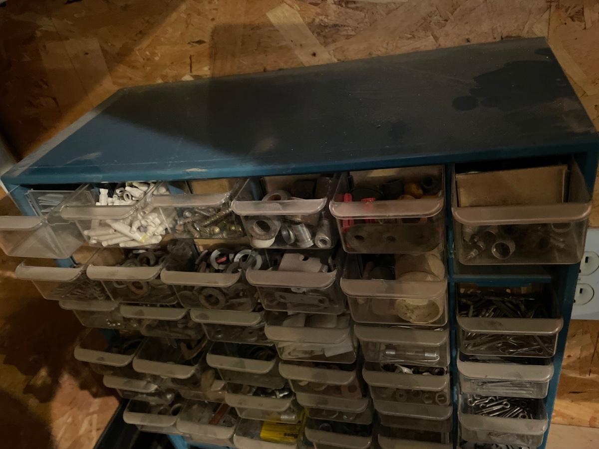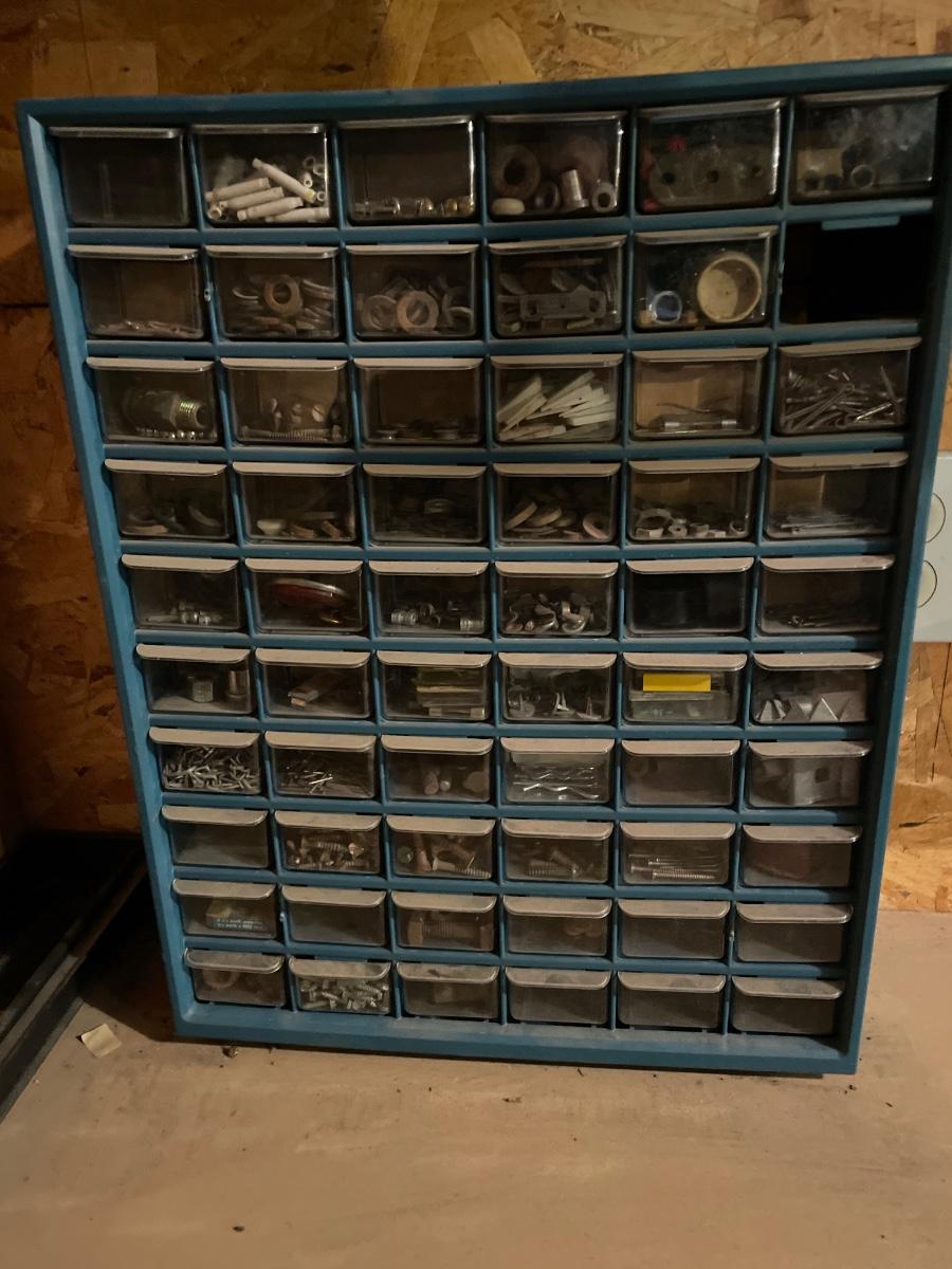 Includes all the hardware in the trays Currently mounted to the wall but easy to remove. Will need a Phillips screwdriver to remove from the wall. Dimensions are 18 1/2 inches tall by 14 1/2 inches wide by 6 1/2 inches deep