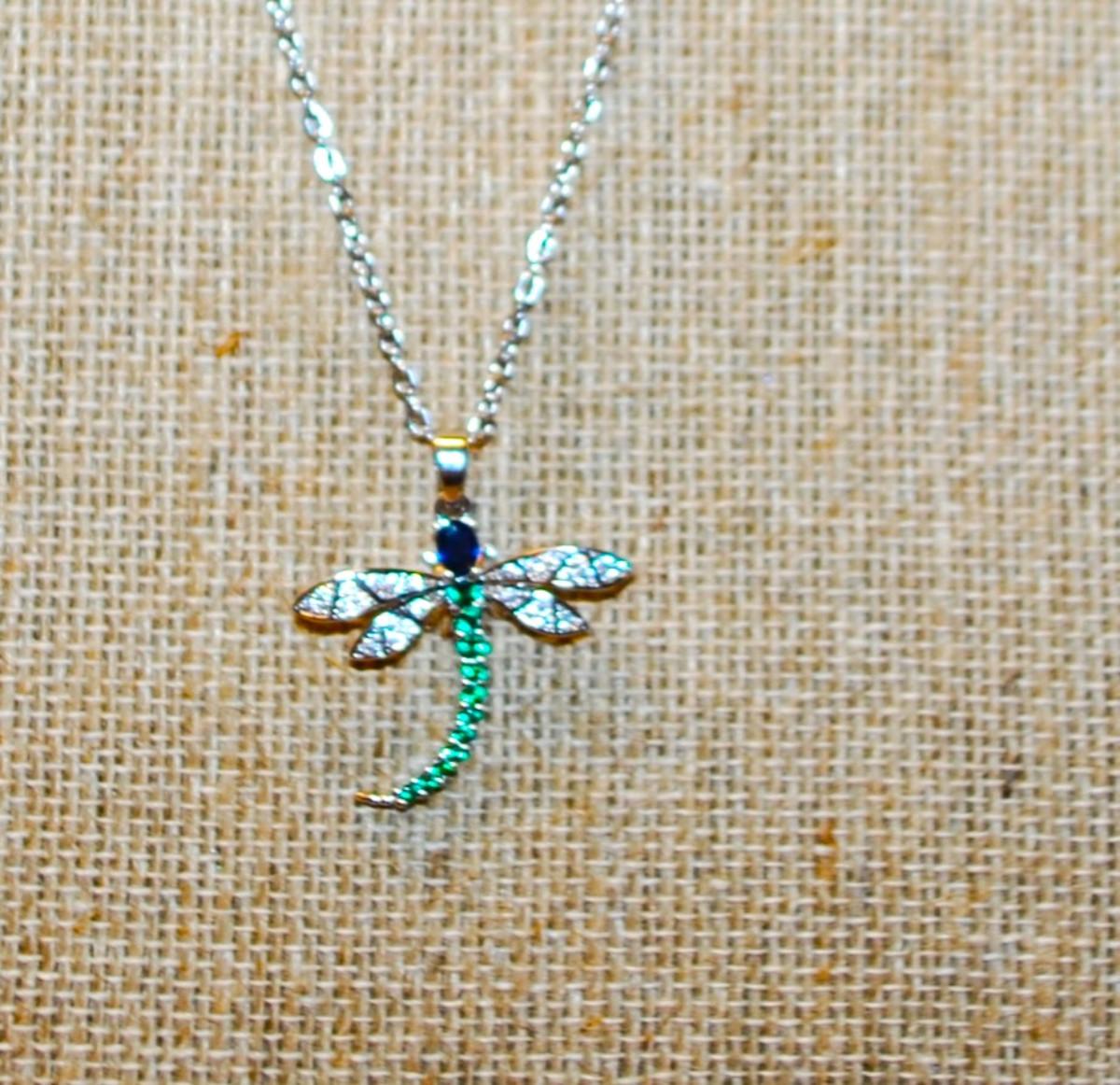 Blue Headed, Green Tailed & Silvery Wings Dragonfly PENDANT (1" x 1") on a Silver Tone Necklace Chain 18" L