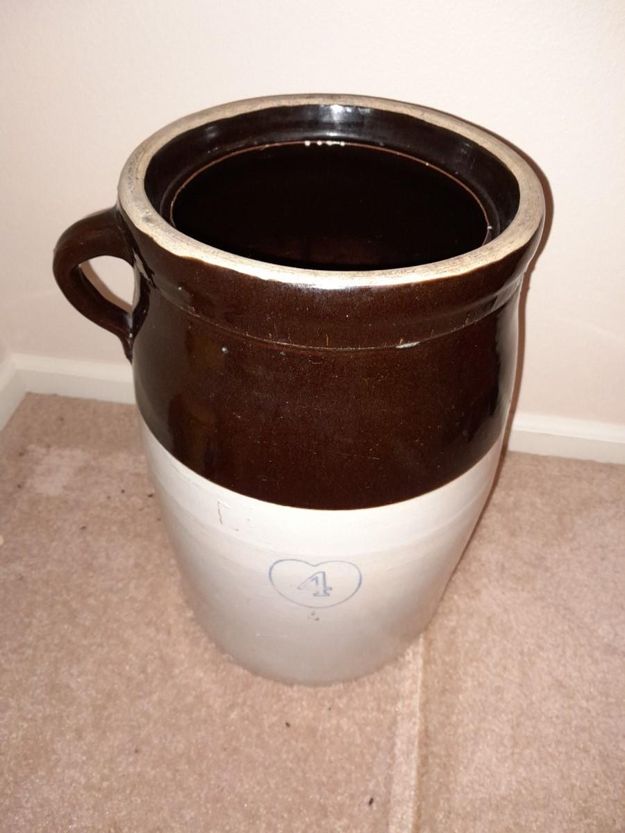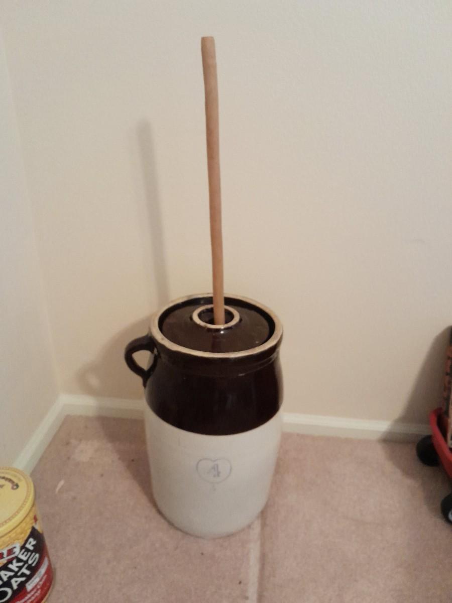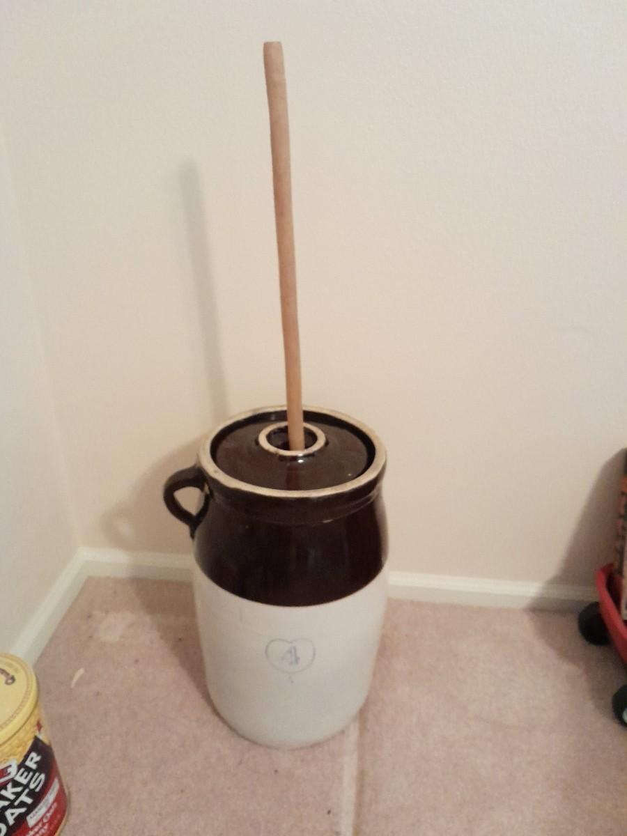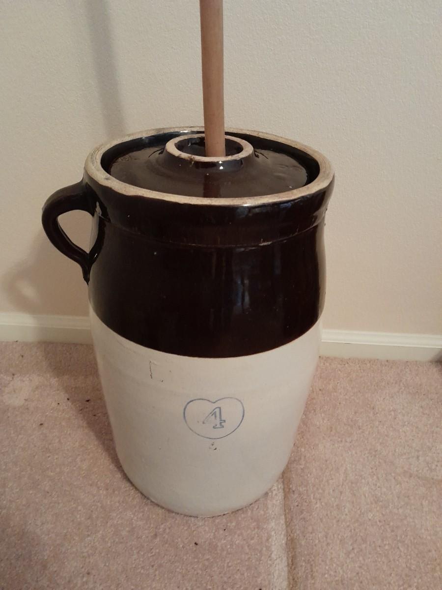 ANTIQUE BLUE HEART #4 ONE HANDLED GLAZED BUTTER / CREAM CHURN WITH PADDLE 16" TALL