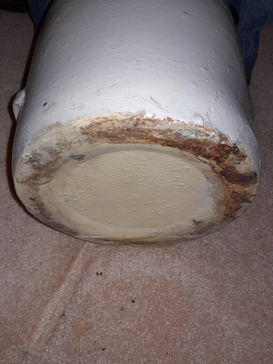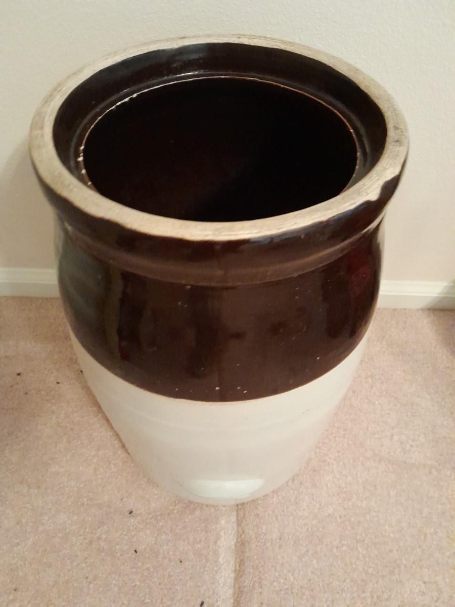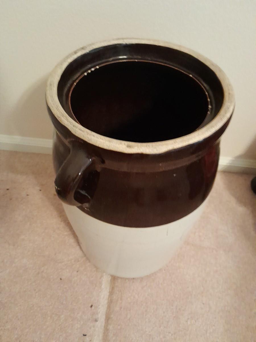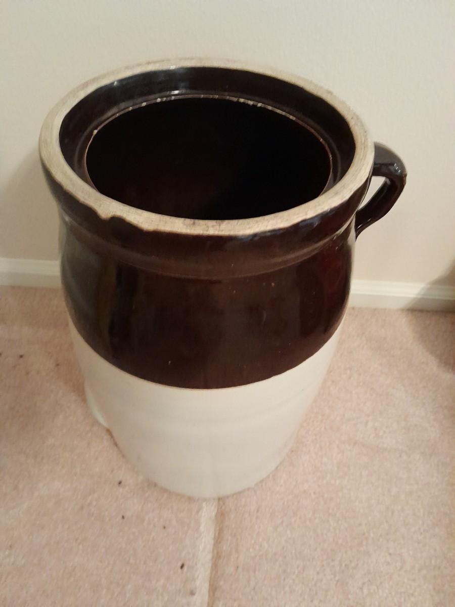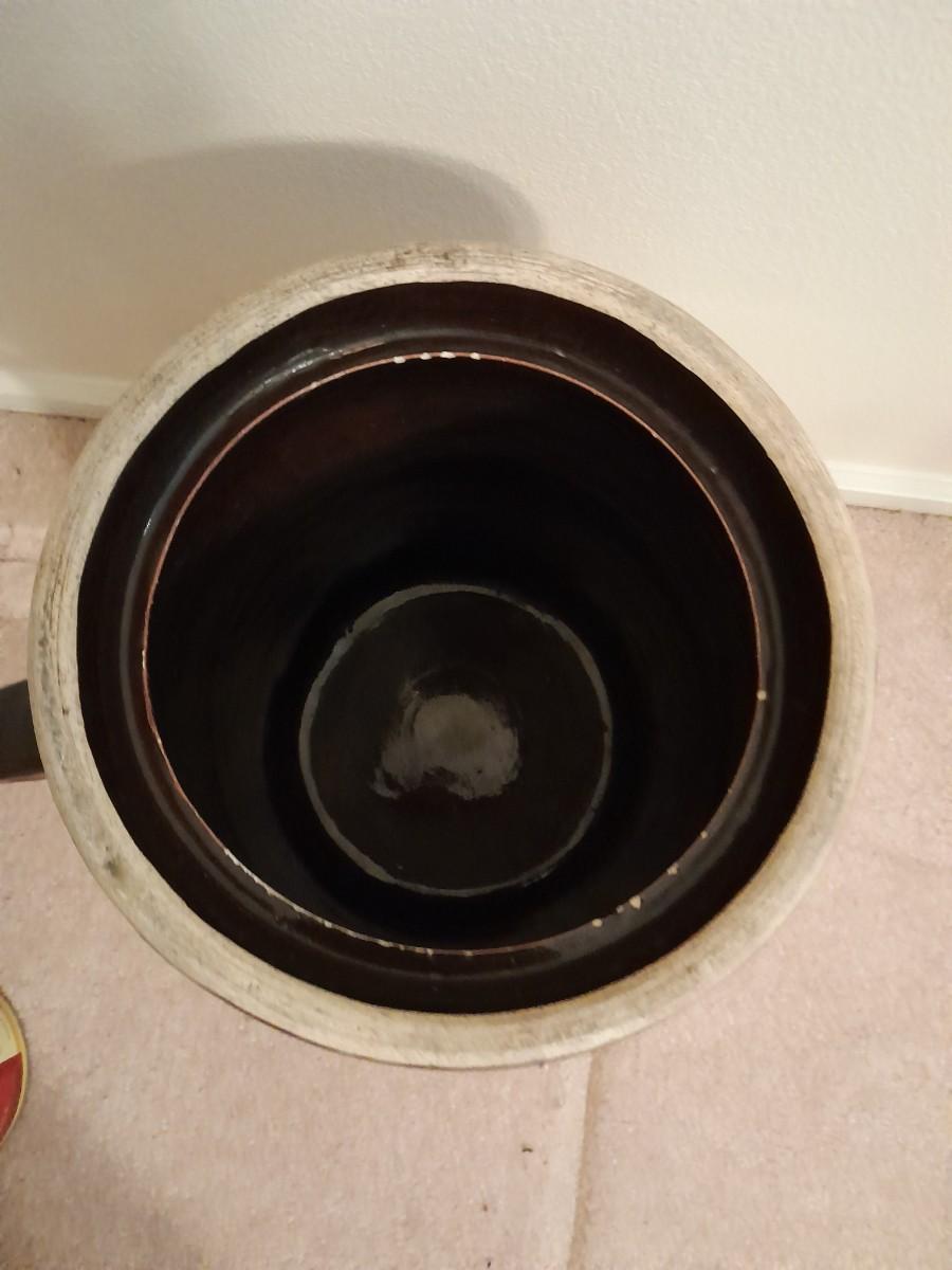 ANTIQUE BLUE HEART #4 ONE HANDLED GLAZED BUTTER / CREAM CHURN WITH PADDLE 16" TALL