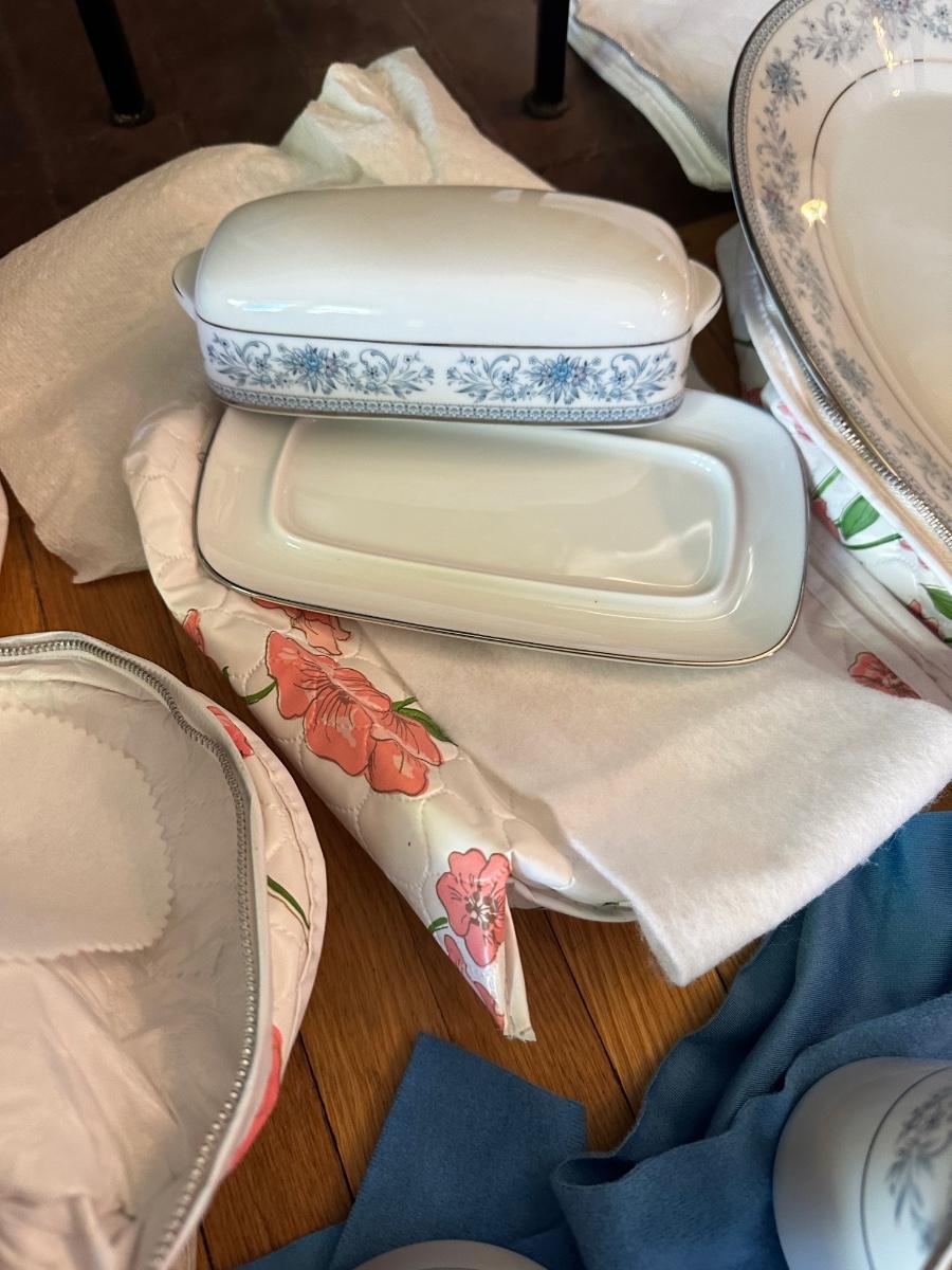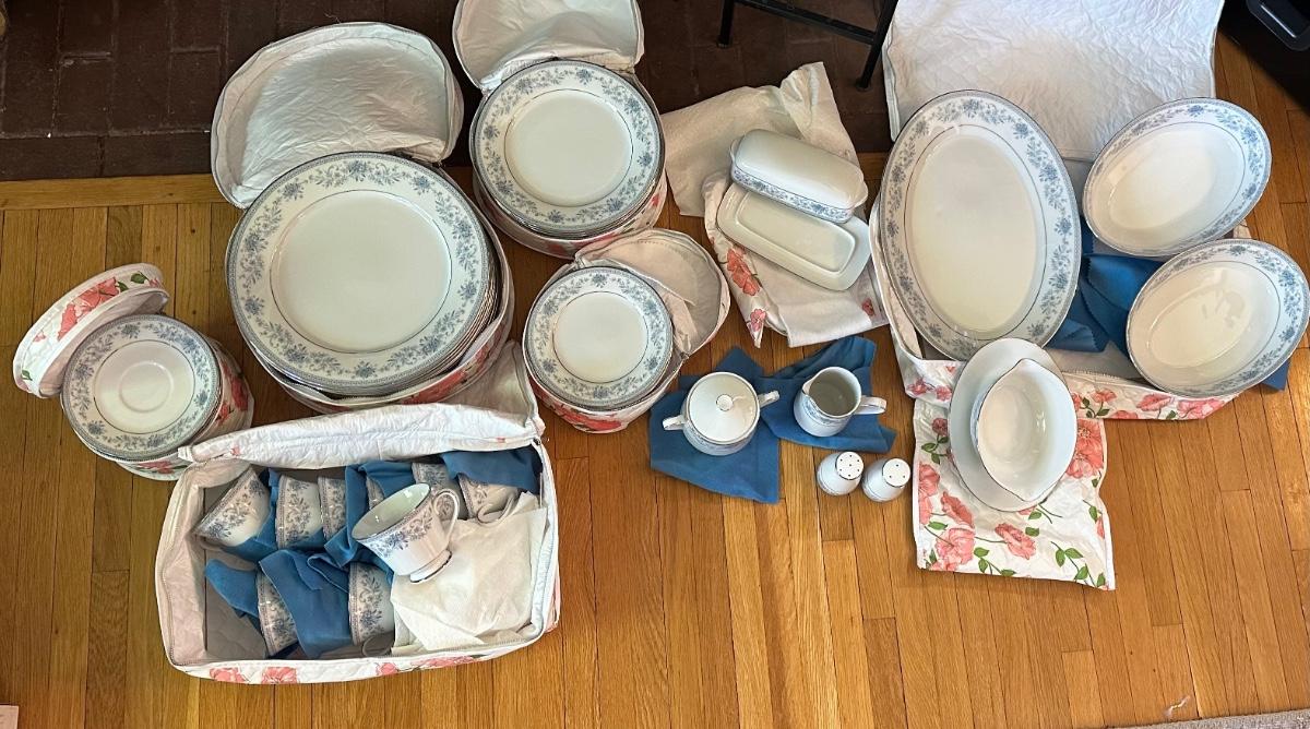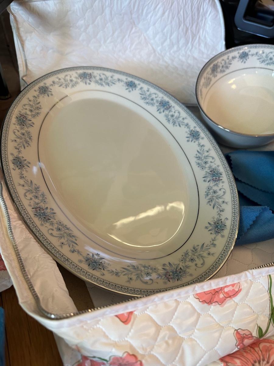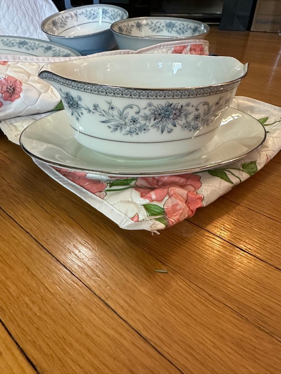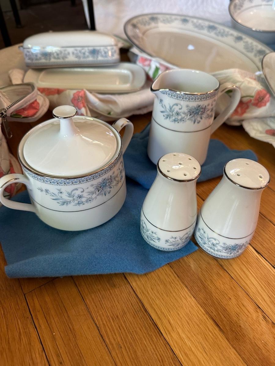 Gravy boat, cream and sugar, butter dish, salt and pepper, 2 large serving bowls, and large platter.