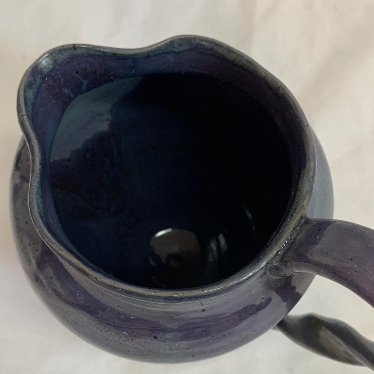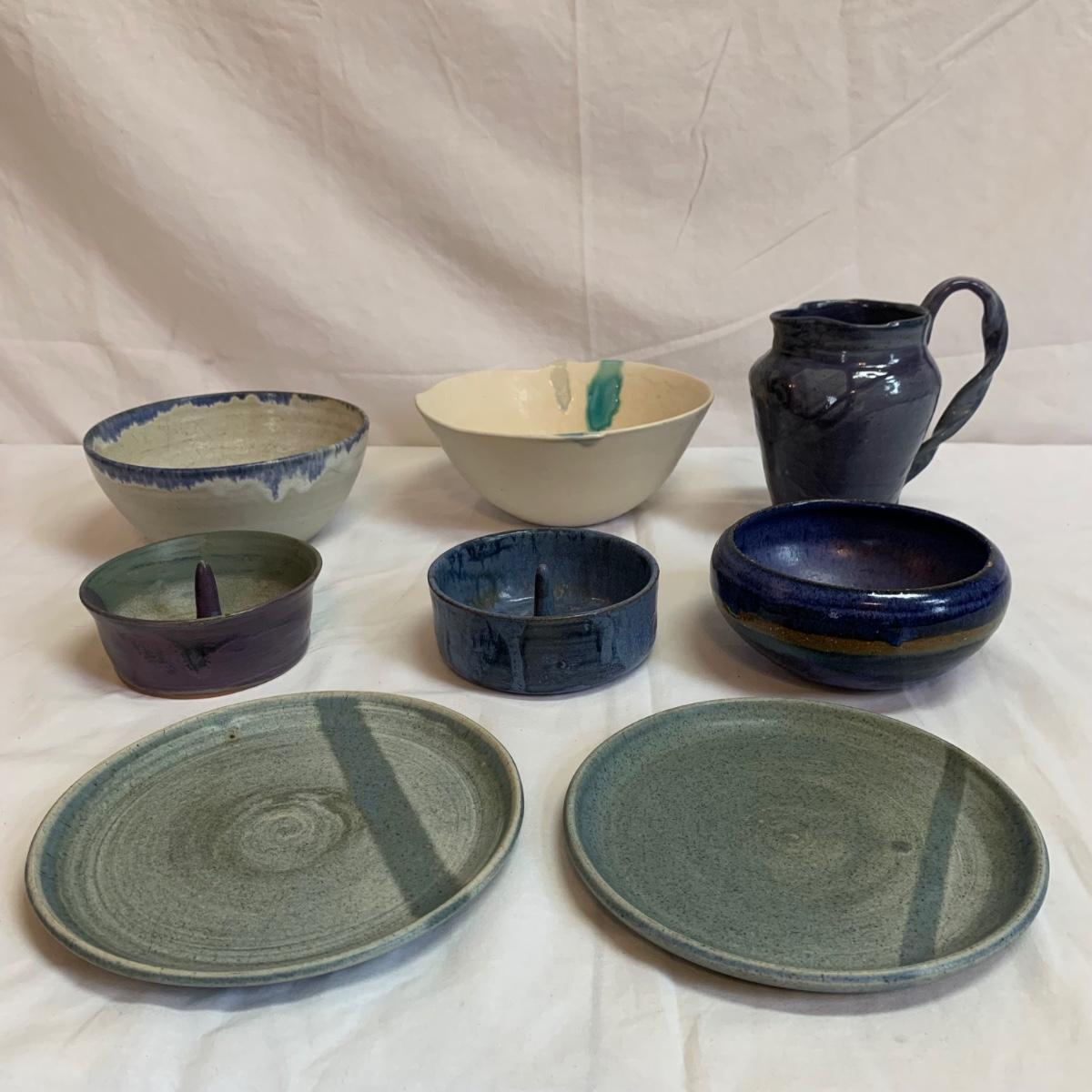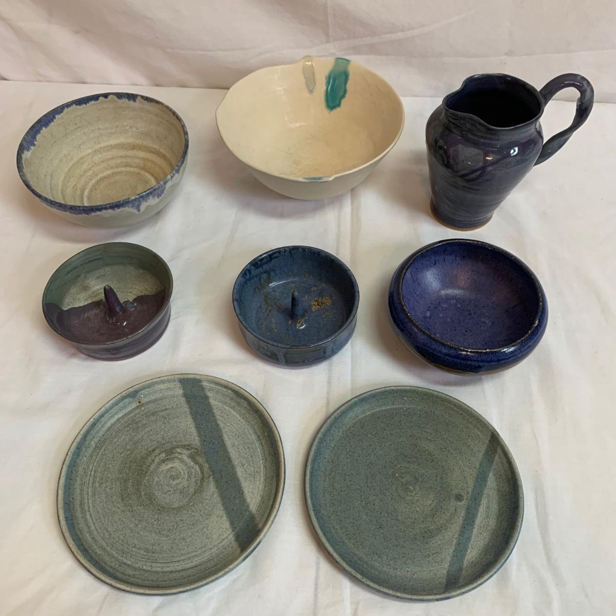 Eight pieces of handmade pottery with hues of blue. Six of the items are signed. Two items are apple bakers, and there are also three bowls, two matching plates, and a pitcher with a fun twisted handle. The largest white bowl with turquoise accents is 9”D x 3.75”H. The two largest bowls have some scratch marks on their interiors. There is a small crack on the rim of the darker blue bowls. The two plates are not signed.