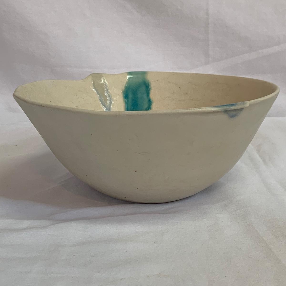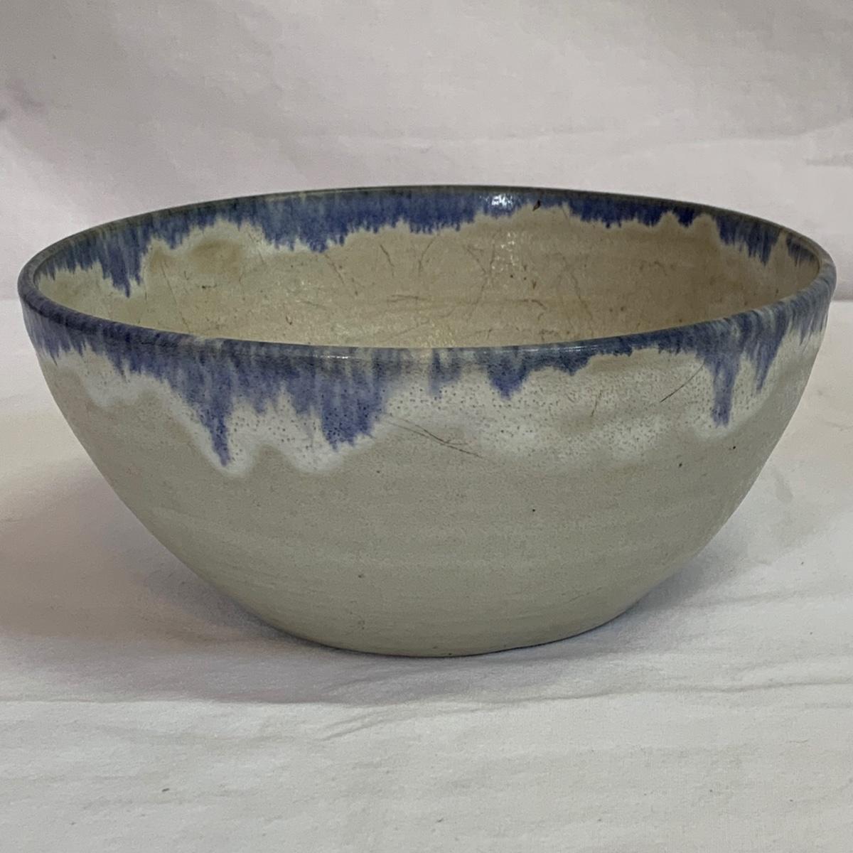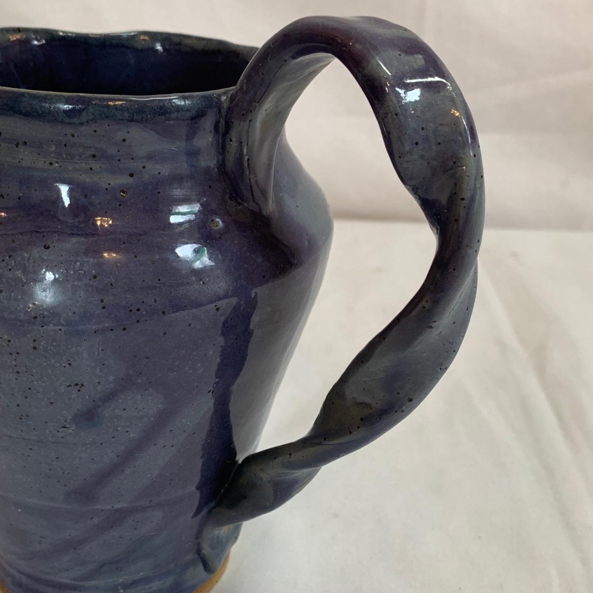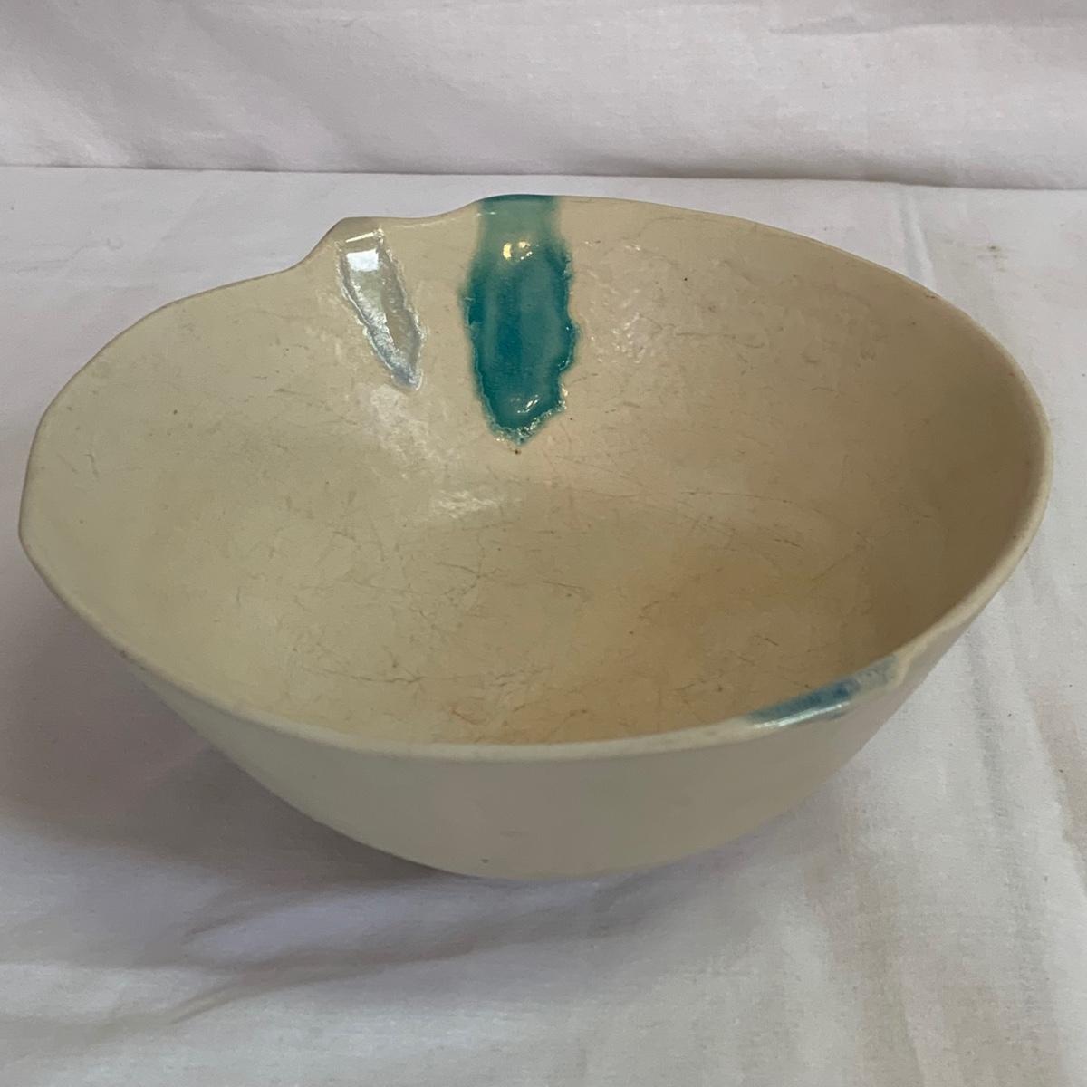 Eight pieces of handmade pottery with hues of blue. Six of the items are signed. Two items are apple bakers, and there are also three bowls, two matching plates, and a pitcher with a fun twisted handle. The largest white bowl with turquoise accents is 9”D x 3.75”H. The two largest bowls have some scratch marks on their interiors. There is a small crack on the rim of the darker blue bowls. The two plates are not signed.