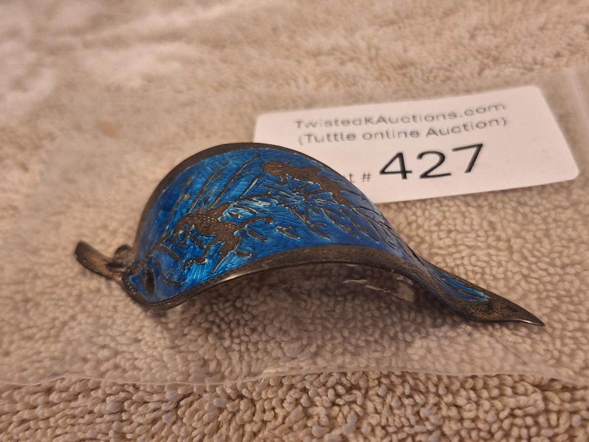 this is the kind of clip that goes over the hair with a stick that runs through the two holes in it to make a pony tail- we don't have the stick part. It is marked sterling.