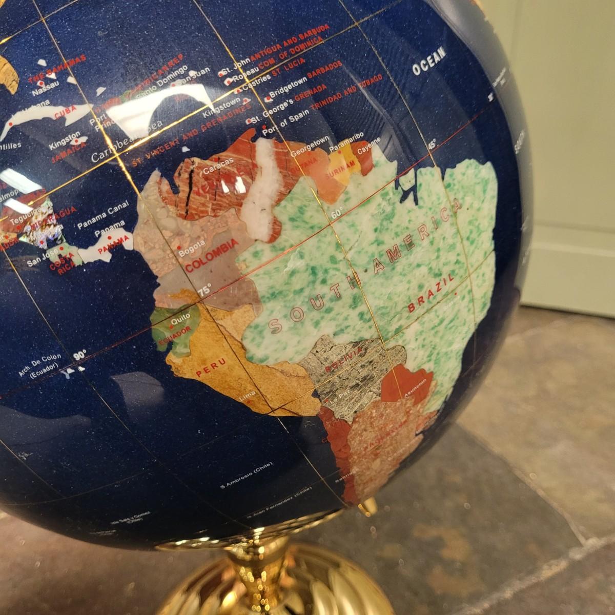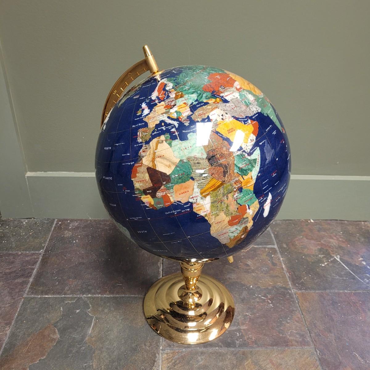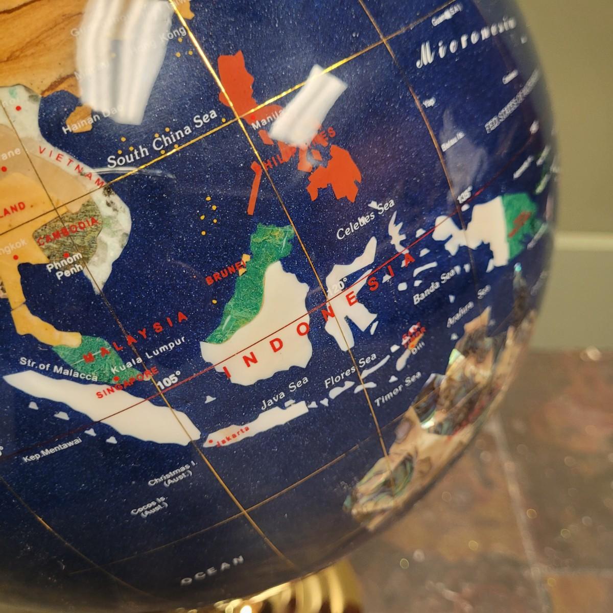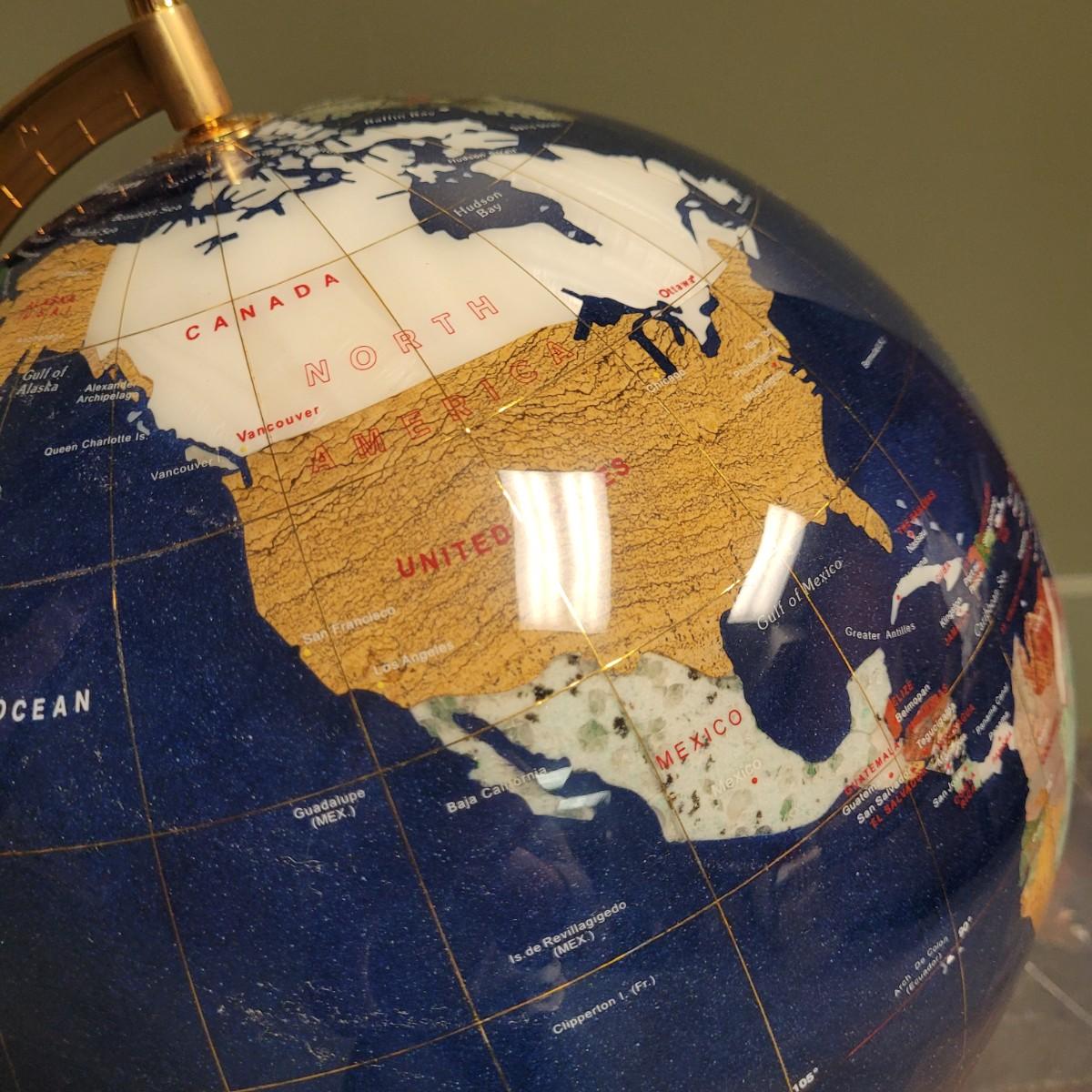 Beautiful blue lapis ocean globe with an array of gemstones making up each country. Measures approximately 22"H from base to top of needle. Shipping available. Shipping can be costly. We suggest contacting our preferred local shipping provider, Postage Express, with dimensions and getting an estimate before bidding: (828) 670-5501or postageexpress@yahoo.com.