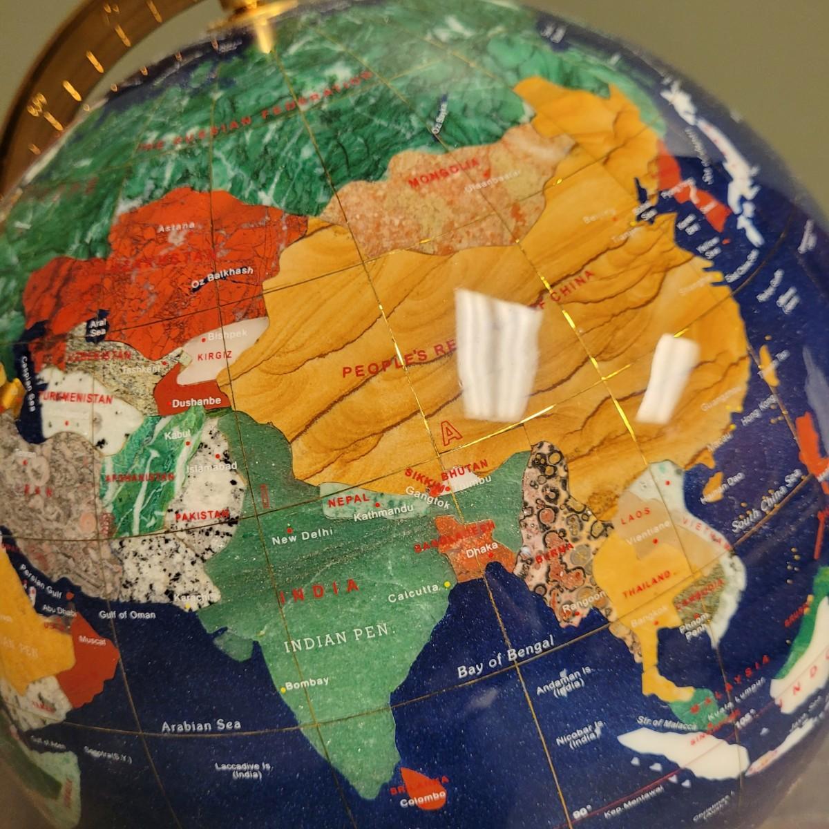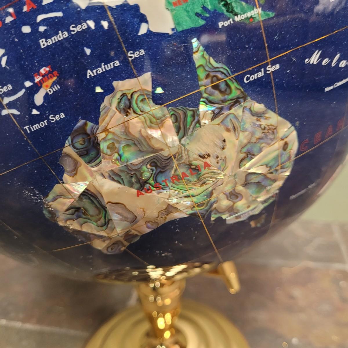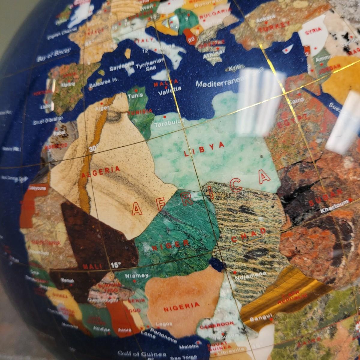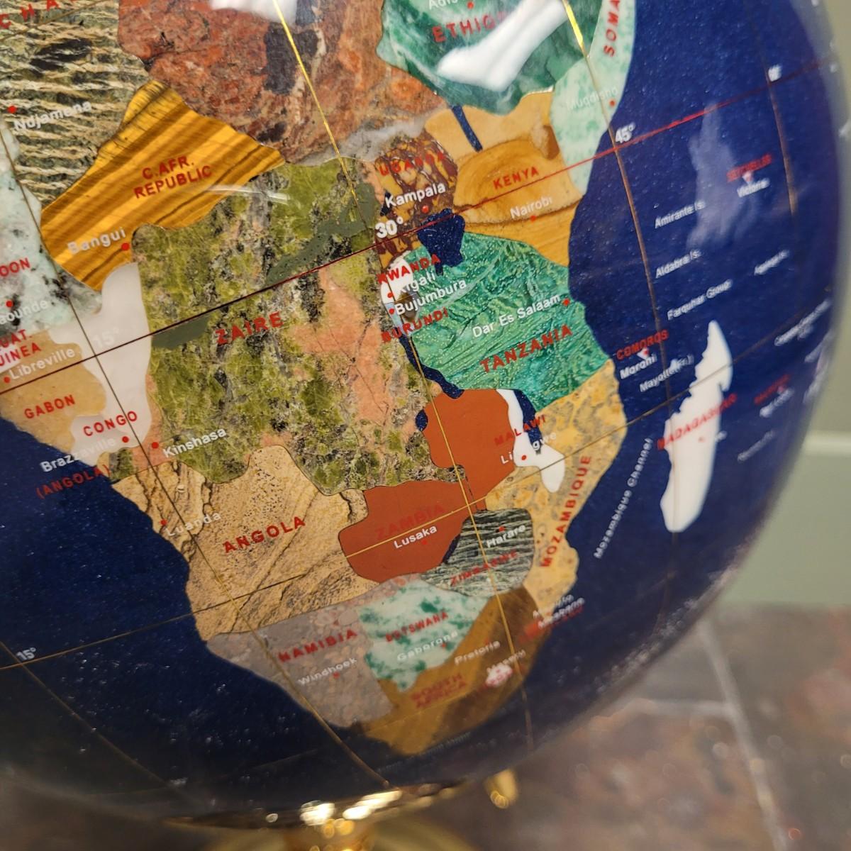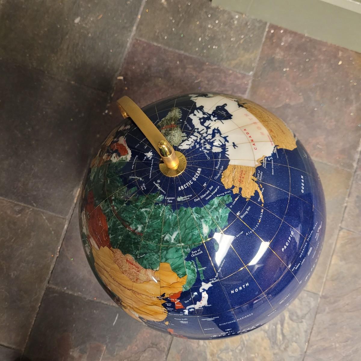 Beautiful blue lapis ocean globe with an array of gemstones making up each country. Measures approximately 22"H from base to top of needle. Shipping available. Shipping can be costly. We suggest contacting our preferred local shipping provider, Postage Express, with dimensions and getting an estimate before bidding: (828) 670-5501or postageexpress@yahoo.com.