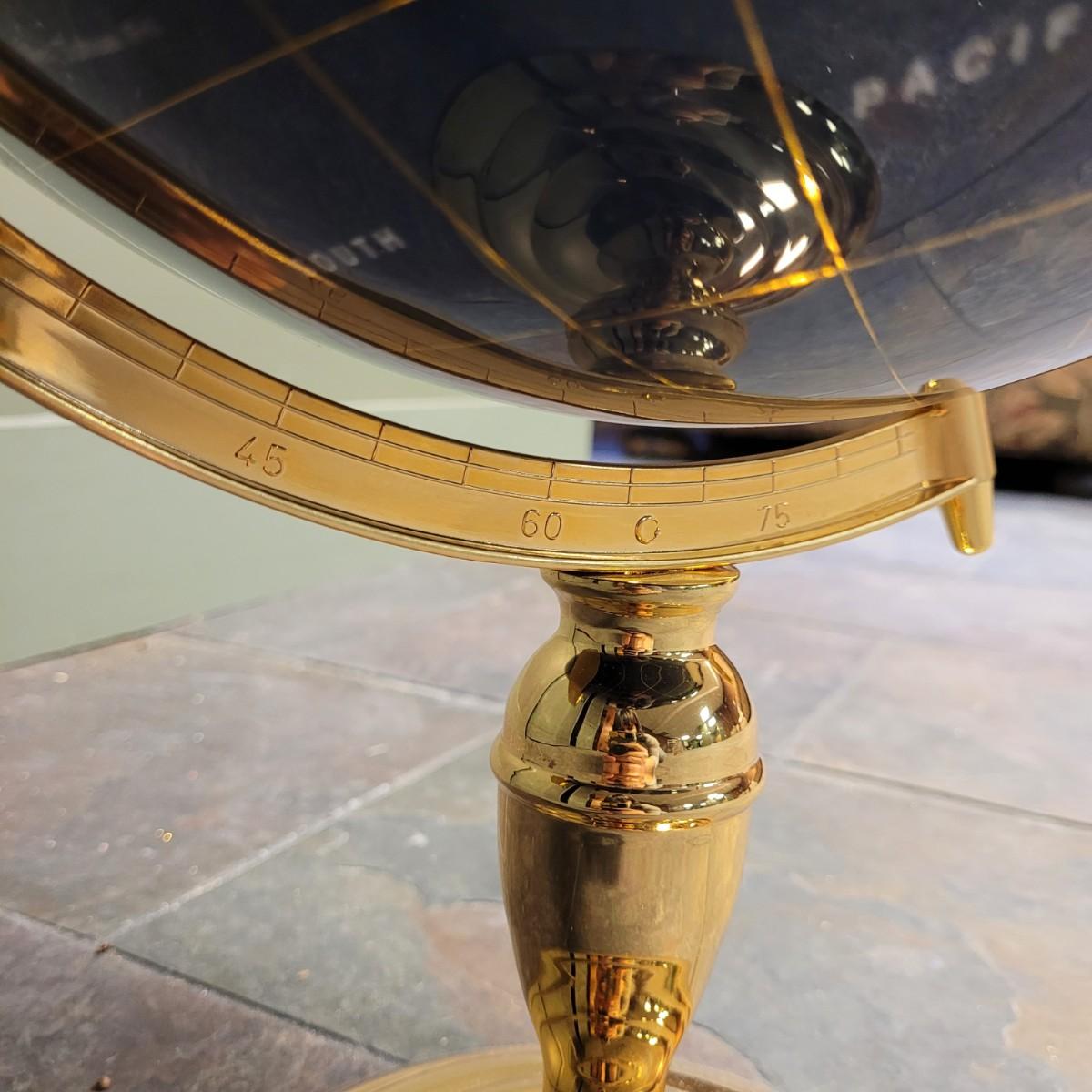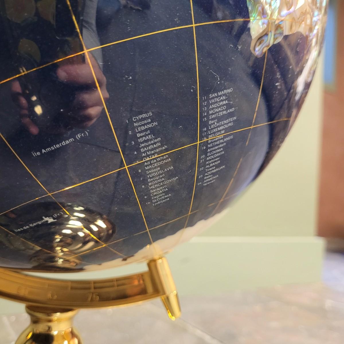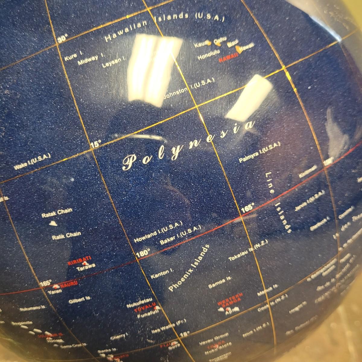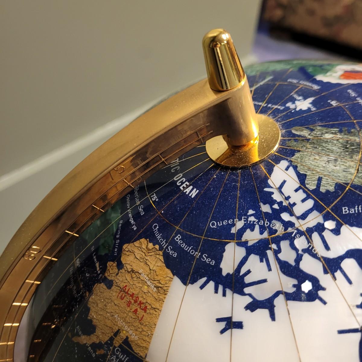 Beautiful blue lapis ocean globe with an array of gemstones making up each country. Measures approximately 22"H from base to top of needle. Shipping available. Shipping can be costly. We suggest contacting our preferred local shipping provider, Postage Express, with dimensions and getting an estimate before bidding: (828) 670-5501or postageexpress@yahoo.com.