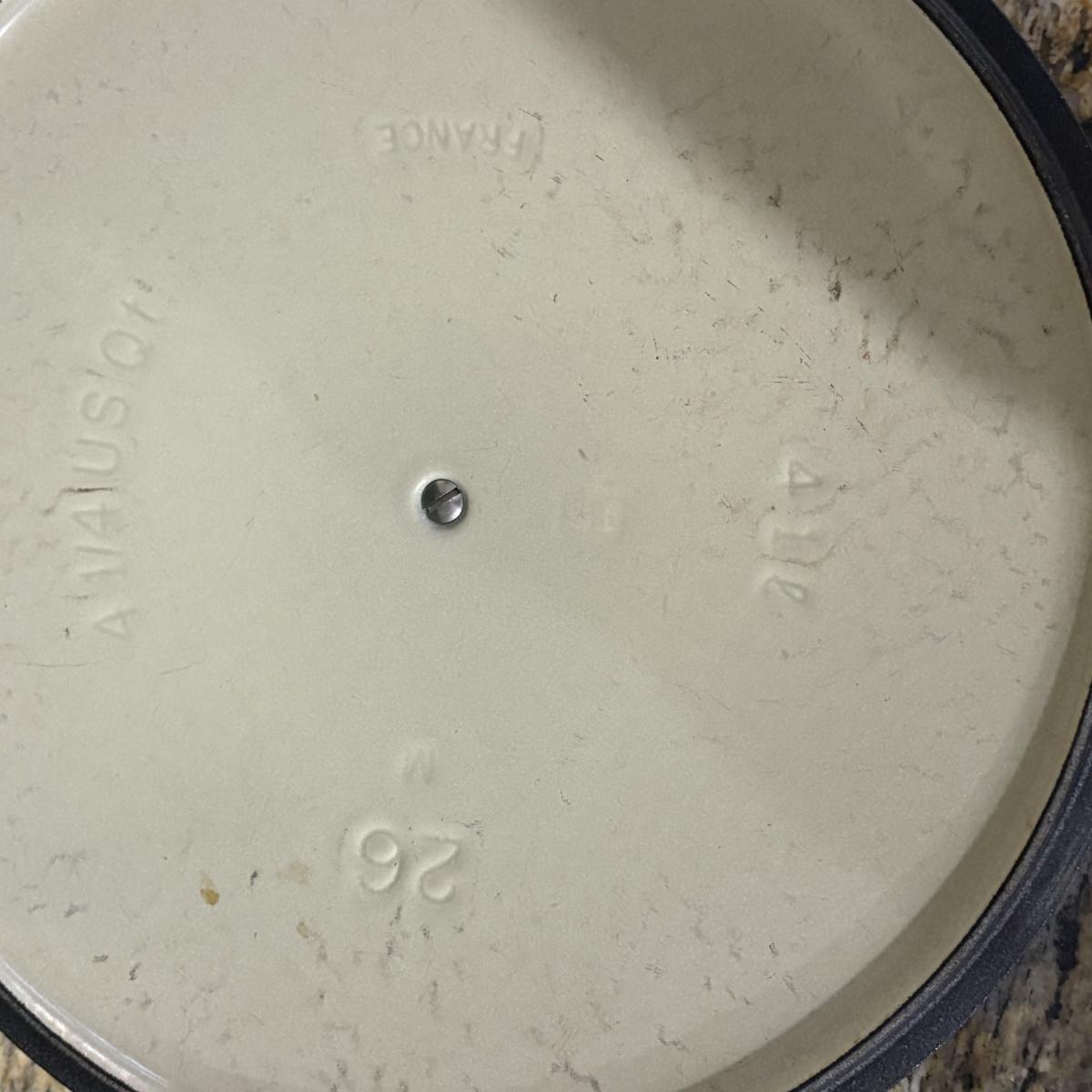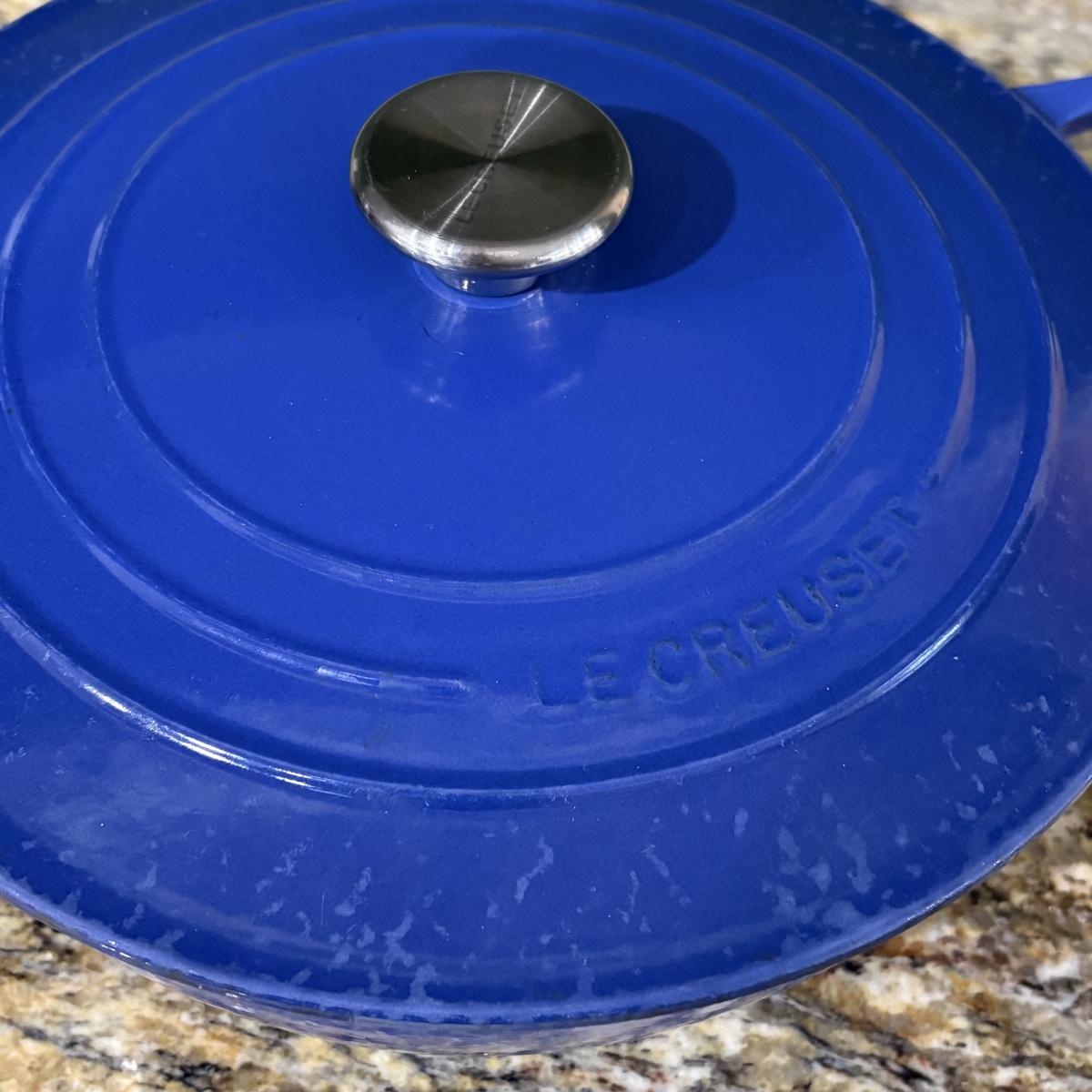 This Blue Le Creuset Casserole Dish is cast iron and measures at approximately 10.5" in diameter and 4.5" in depth. This dish appears to be in sturdy condition with wear on the inside and blemishes on the outer lid. See pictures.