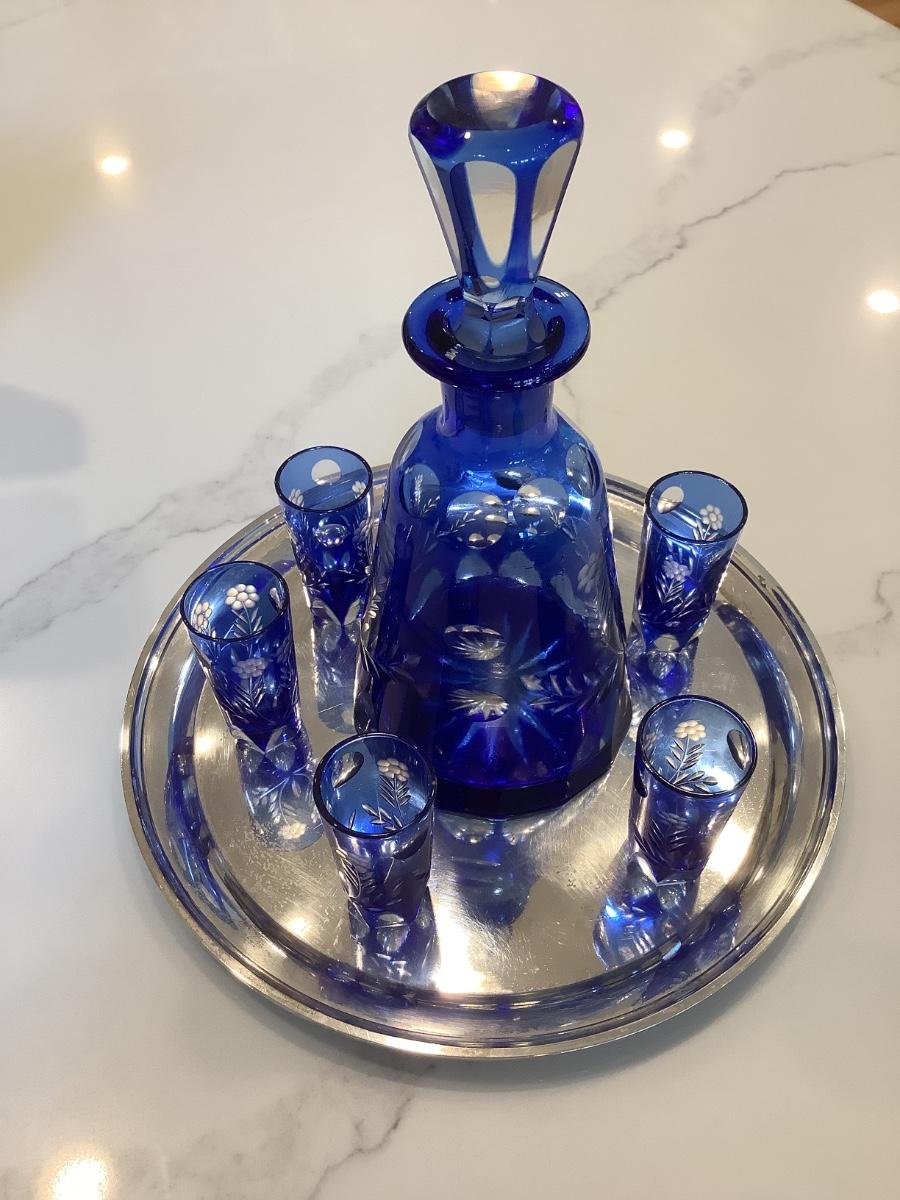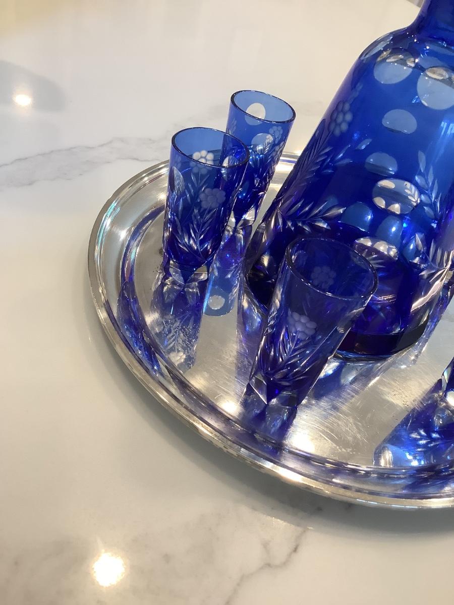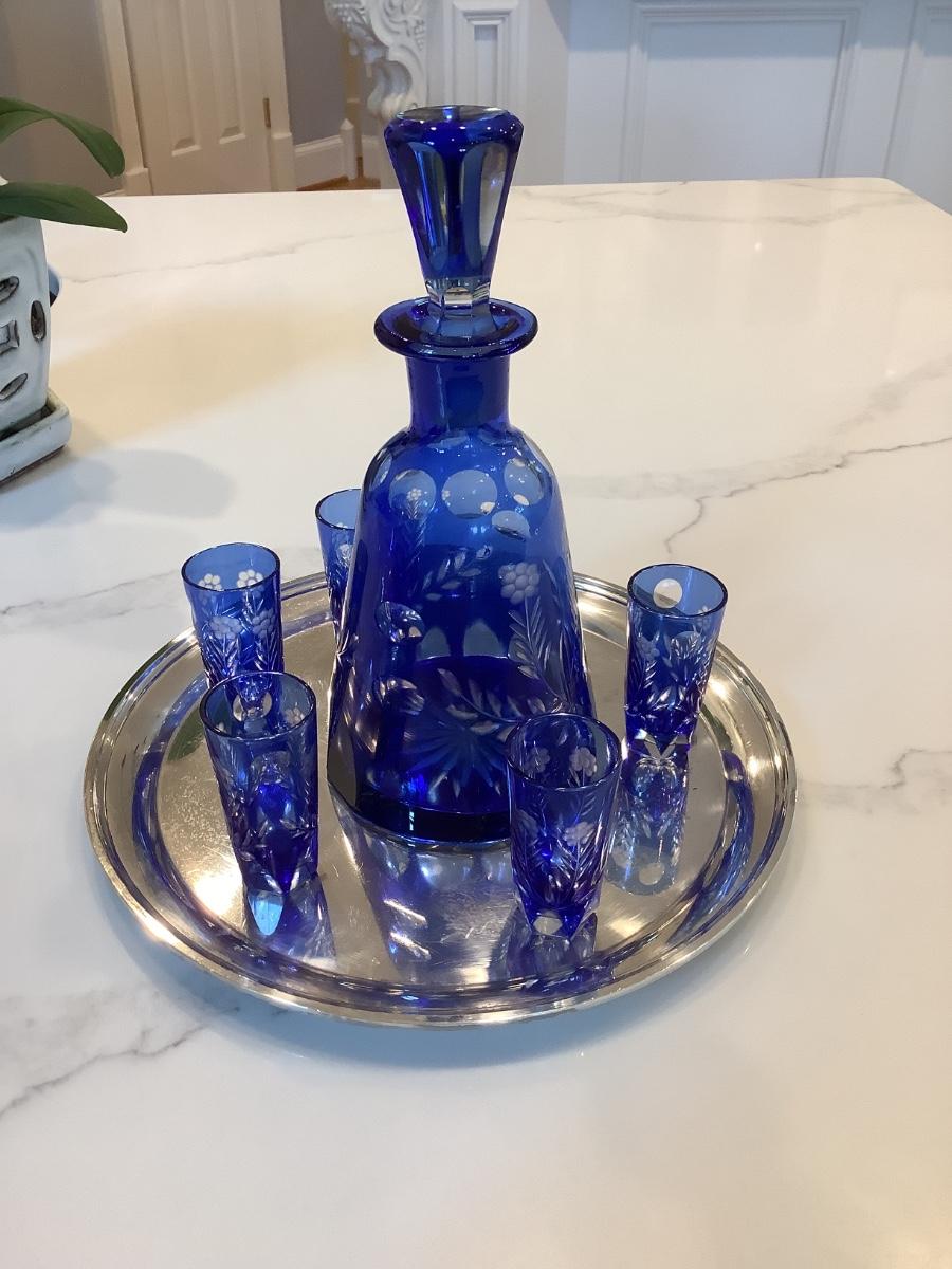 Blue Lead Crystal Decanter, cobalt blue with tray