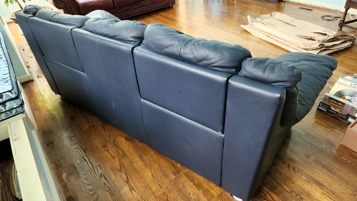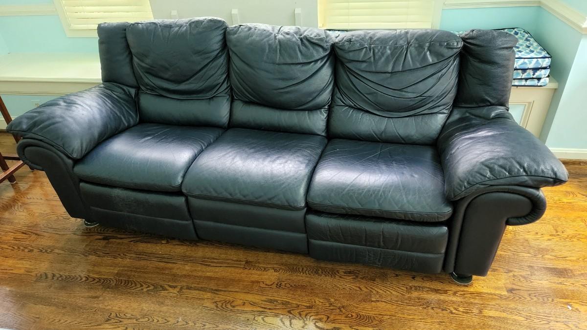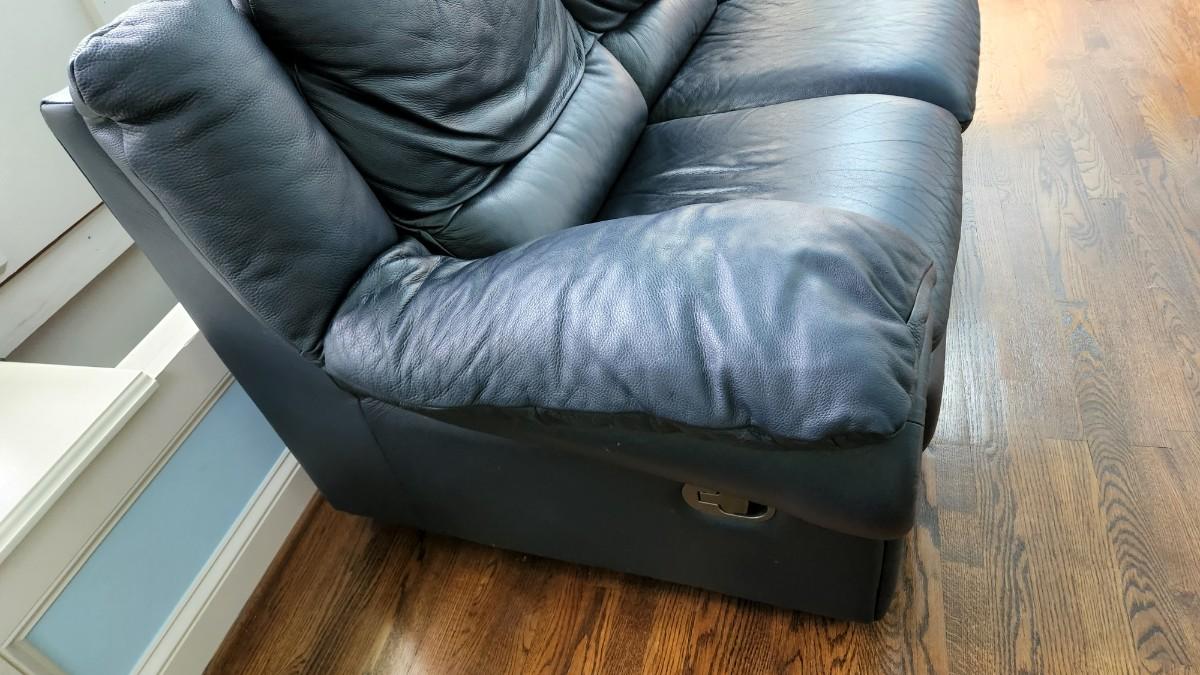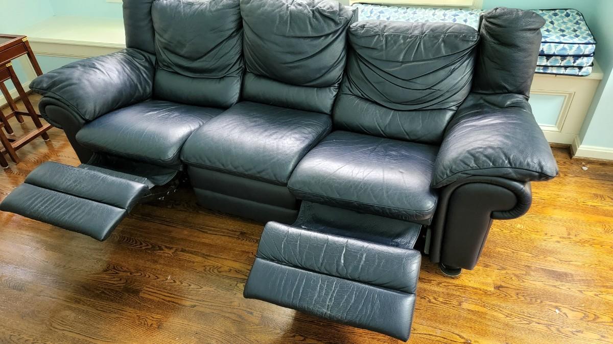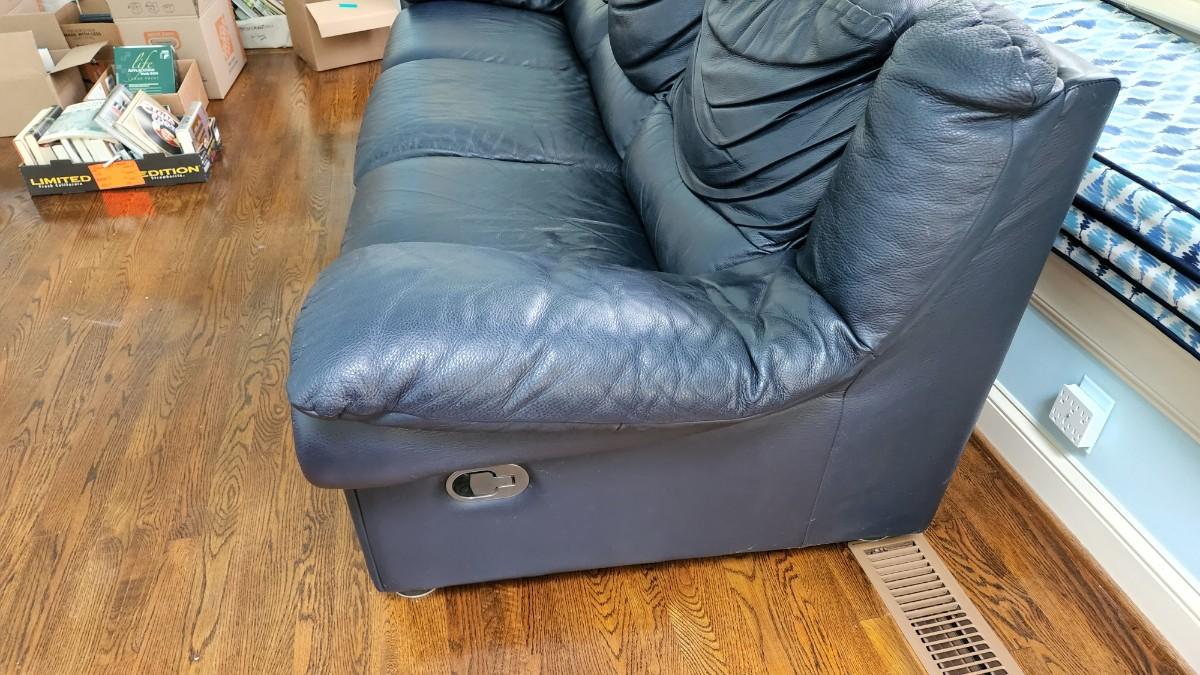 Blue Leather Sofa with Dual Recliner 93x36x32 seat 18"