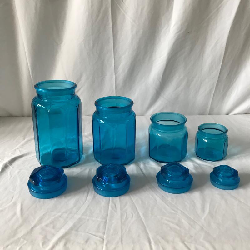 Set of four blue lidded jars. Tallest is approx. 12” tall. No shipping available. Local pickup only in Hendersonville, NC.