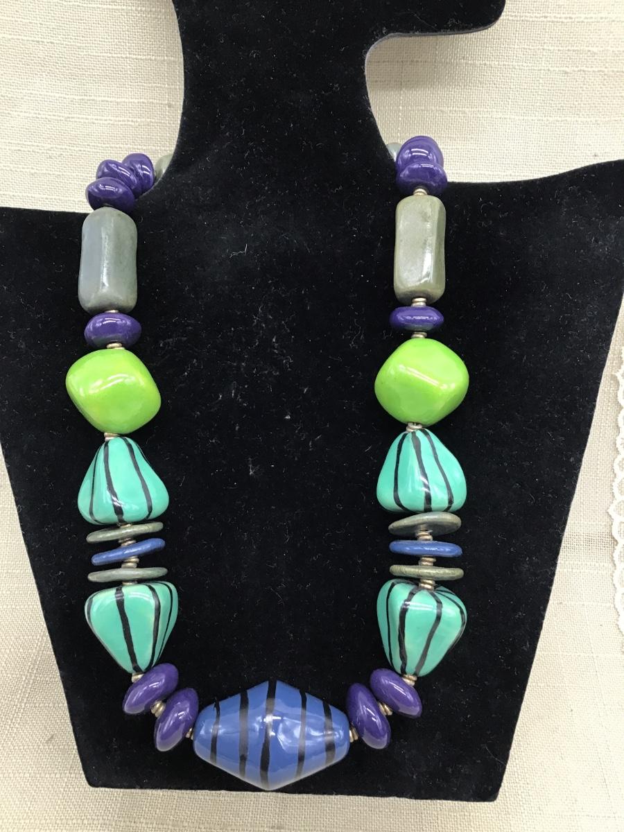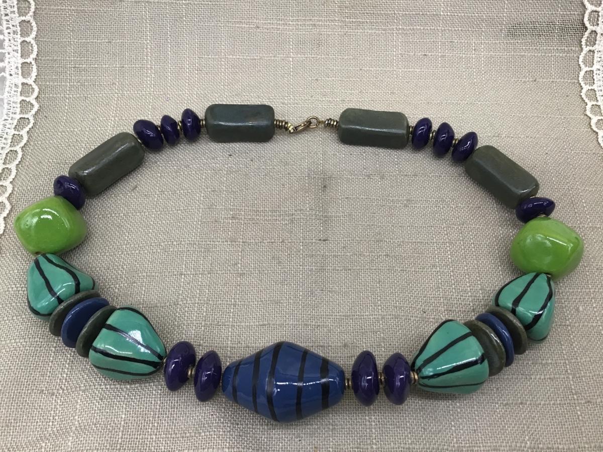 Blue Light Green Multicolor Glass Ceramic Cylinder and Beads Necklace