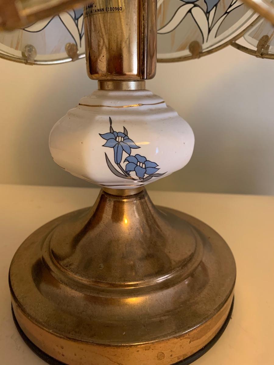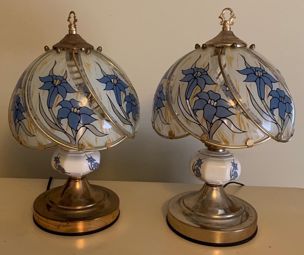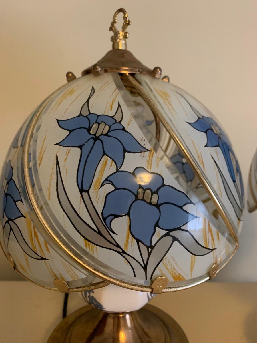 Pair of small Blue Lily lamps. Brass with glass shades and ceramic center sections.