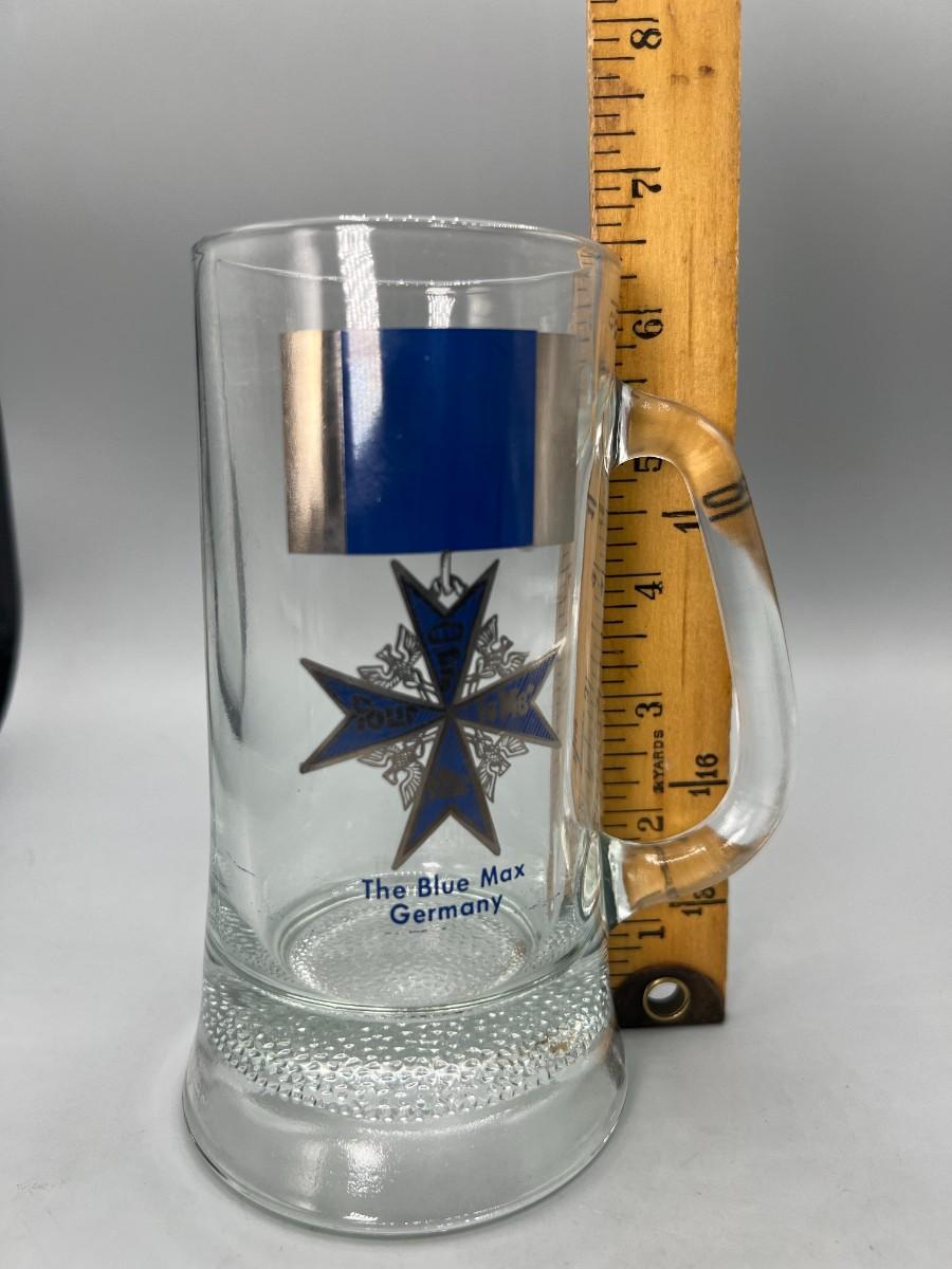 Blue Max German Commemorative Military Glass Beer Stein, there is no significant damage to the glass and is in good useable condition. Check pictures for more details and for sizing.