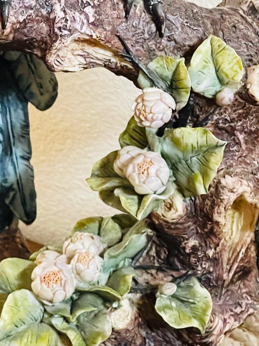 Made of a resin type material. Attached to the Black Stand. No name found. Black Stand has minor surface scratches from the figurine moving around. Figurine stands 16” H and the stand measures 12” x 9”