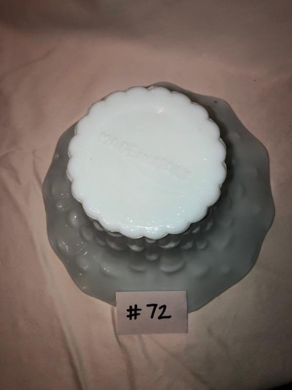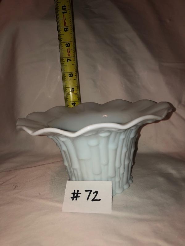 Blue colored milk glass made in Italy measures approx 4in tall and flowered edges.