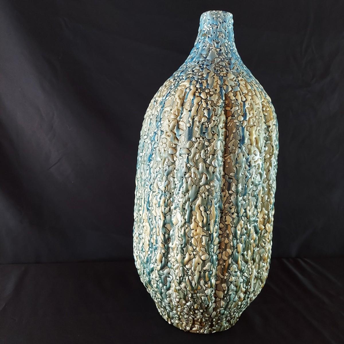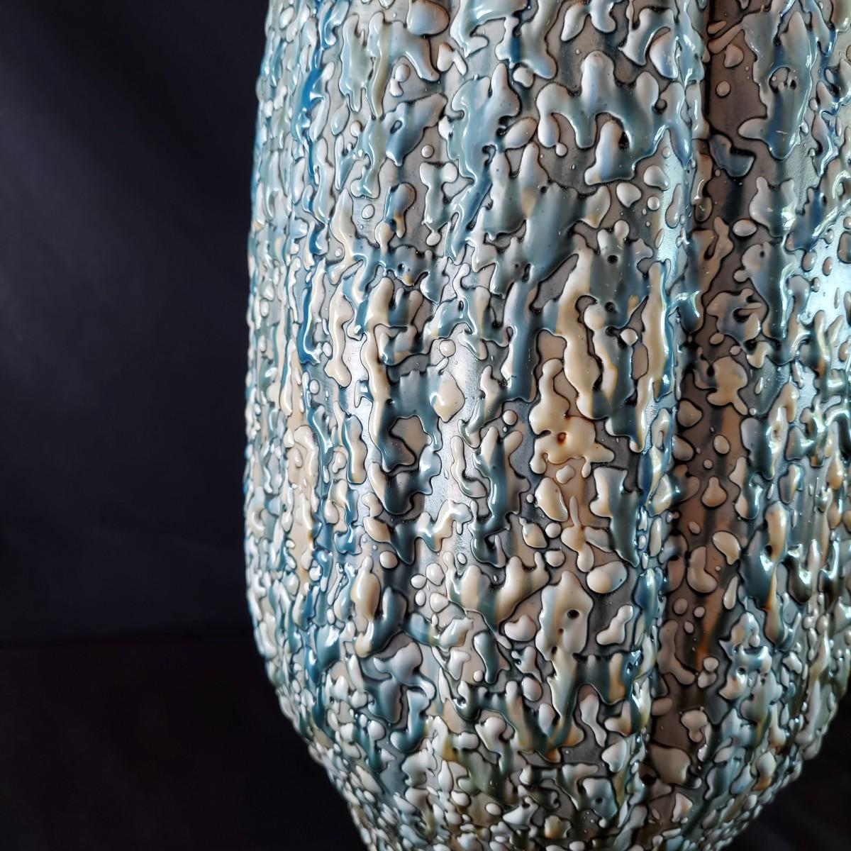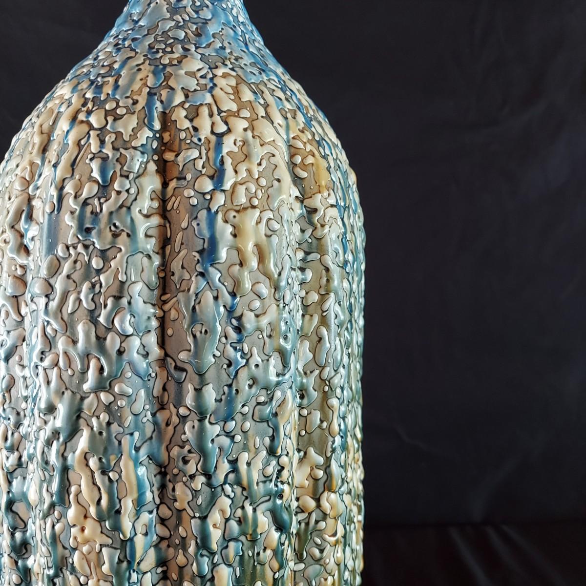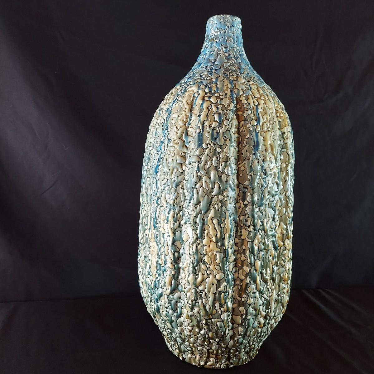 Signed handmade ceramic vase with intentionally lumpy glaze in blue, orange, green and brown giving a bubble texture. Measures approximately 16.5" tall. Piece is stamped by artist. Bottom has been broken but is not visible when piece is standing up. Shipping available.