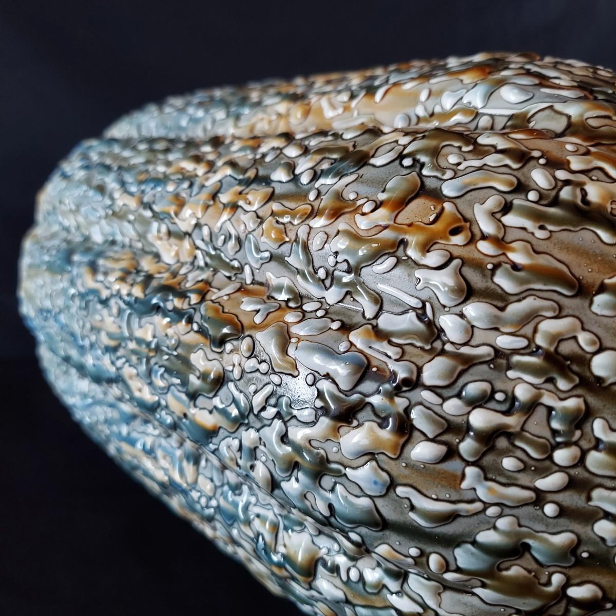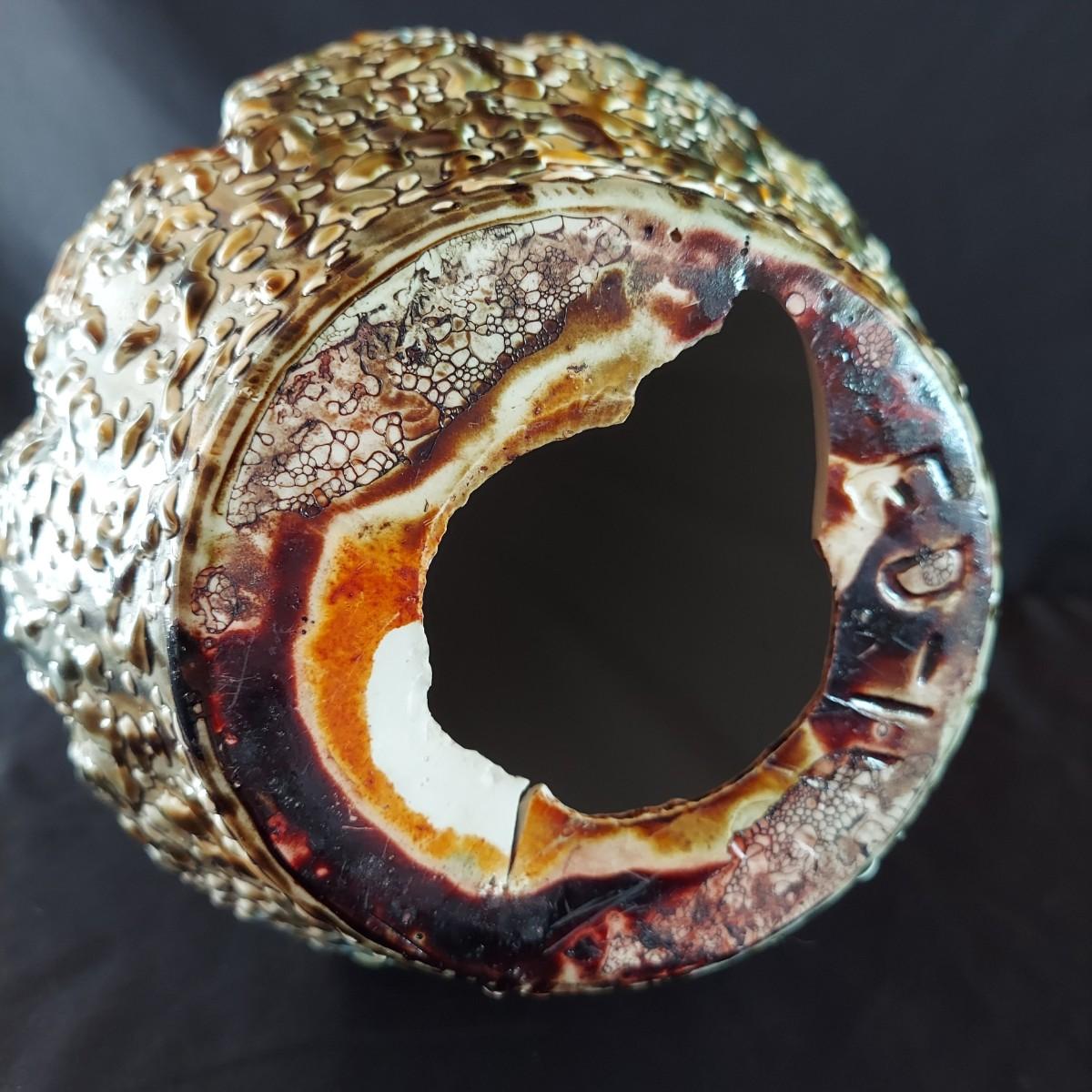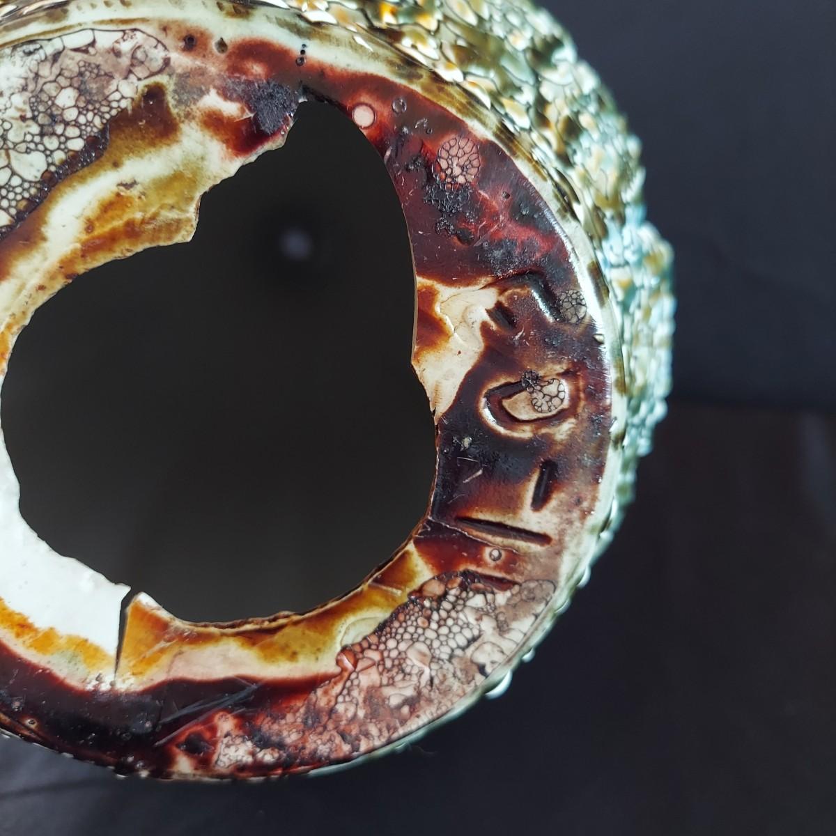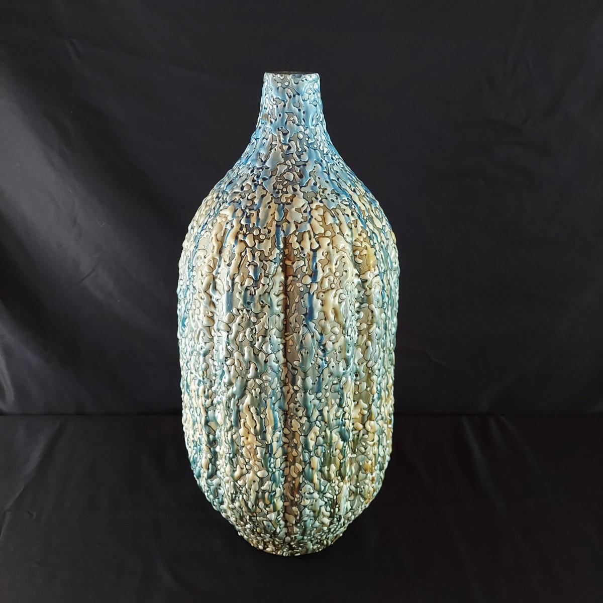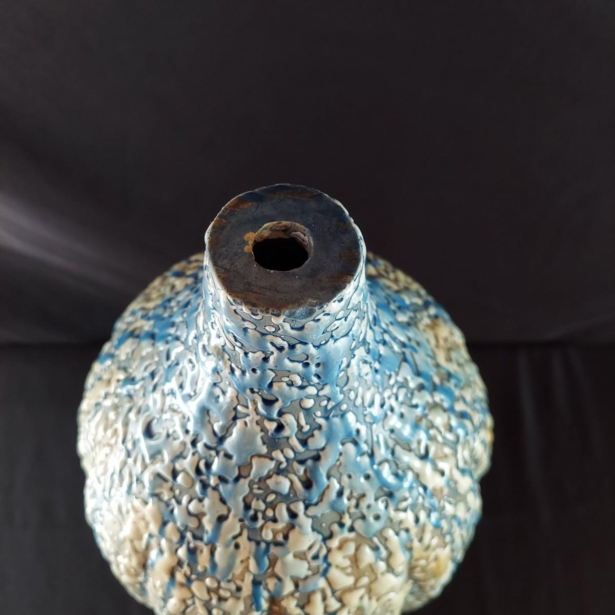 Signed handmade ceramic vase with intentionally lumpy glaze in blue, orange, green and brown giving a bubble texture. Measures approximately 16.5" tall. Piece is stamped by artist. Bottom has been broken but is not visible when piece is standing up. Shipping available.