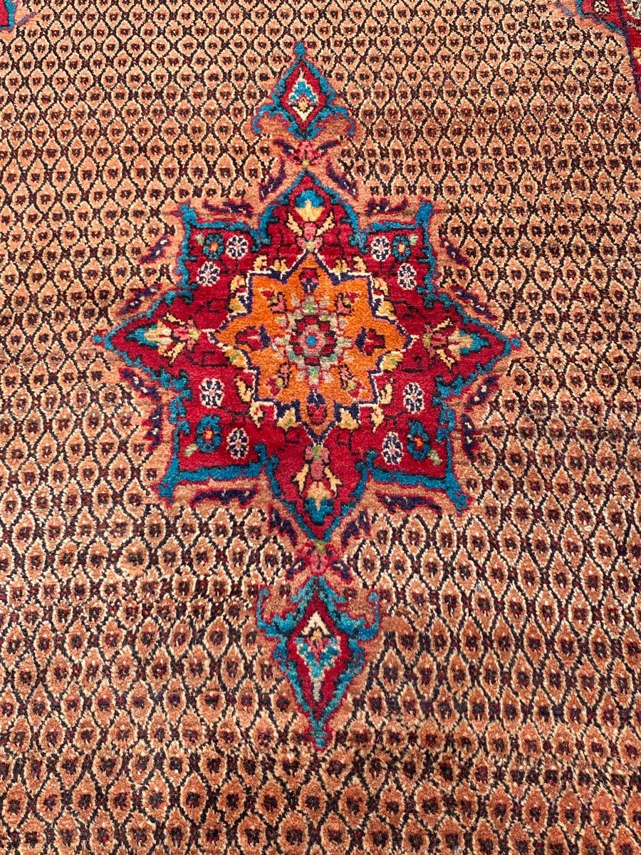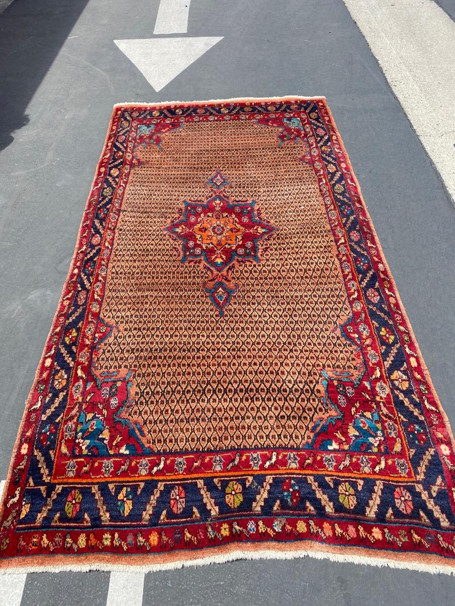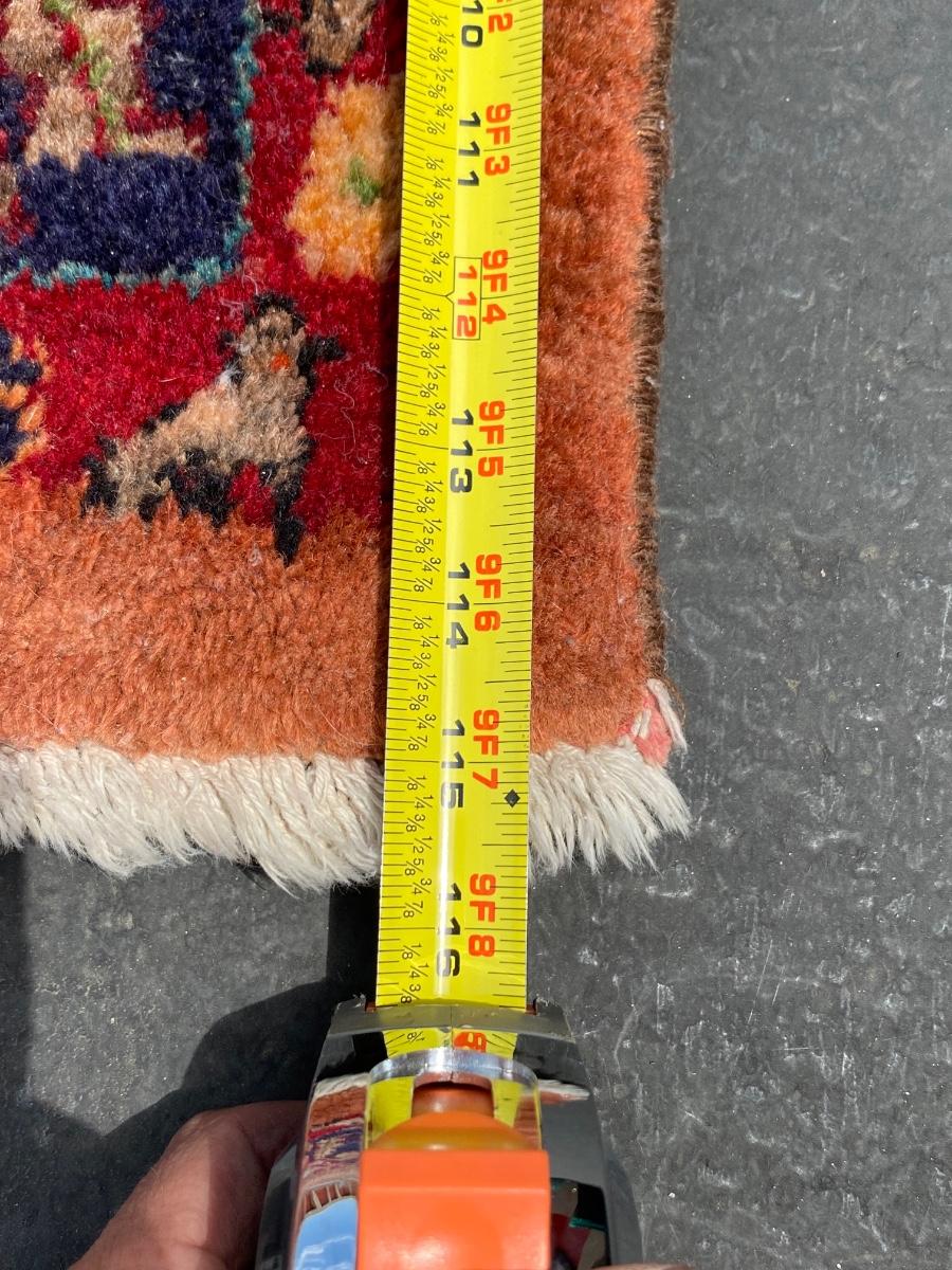 Blue & Orange Wool Area Rug Birds Flower Pattern. In good condition. Simple yet detailed design. About 5'x9.5' size. May need surface cleaned but no major spots or stains.