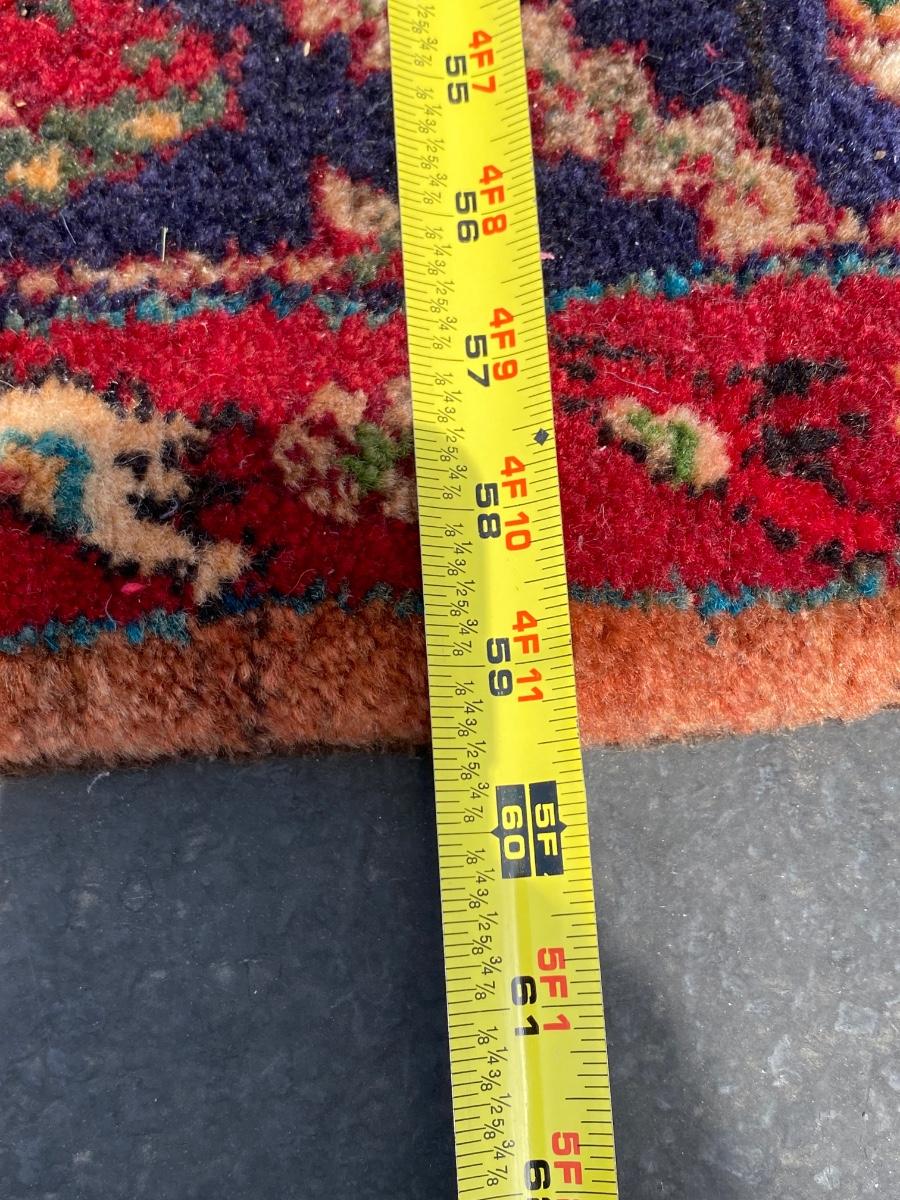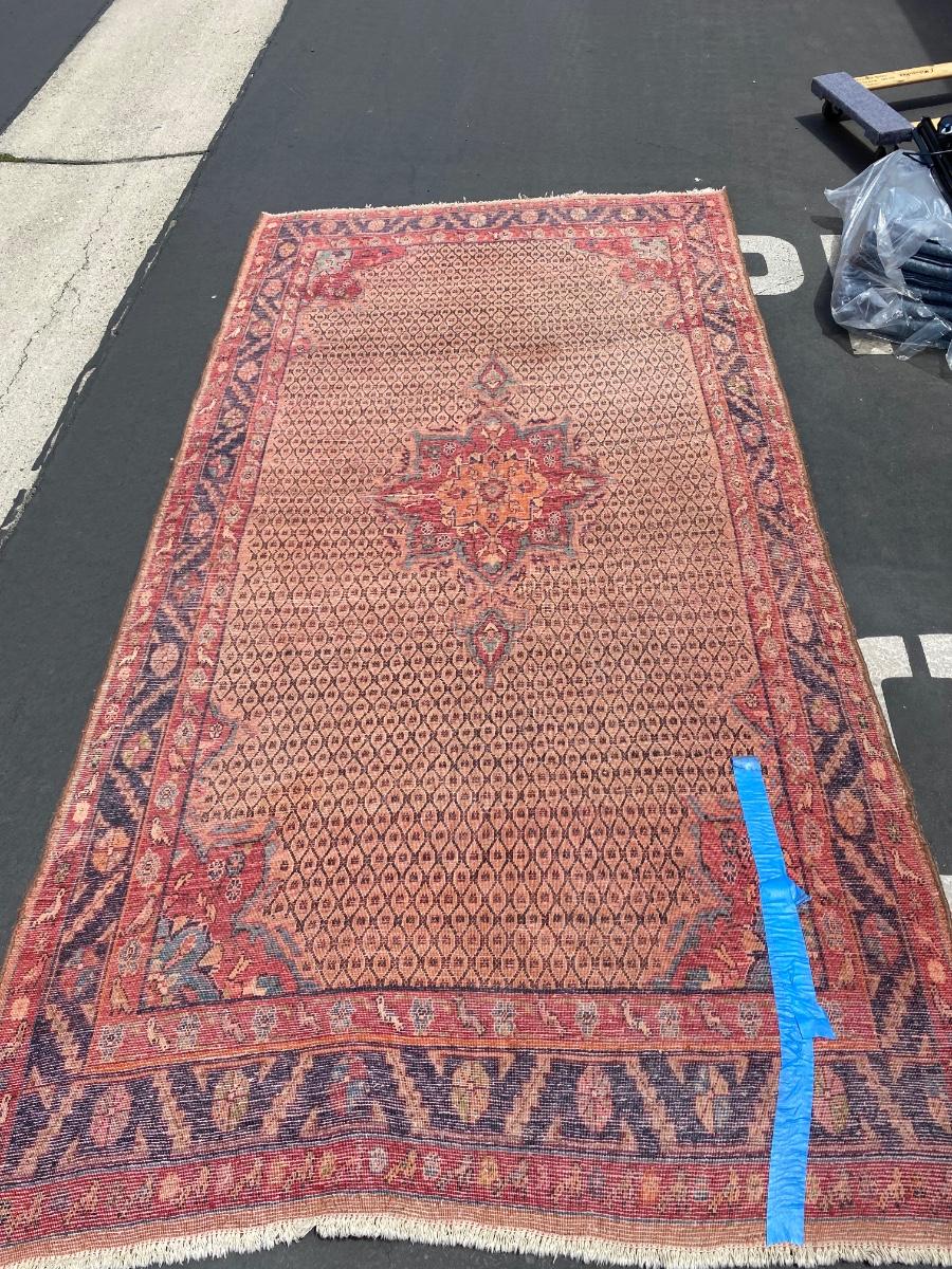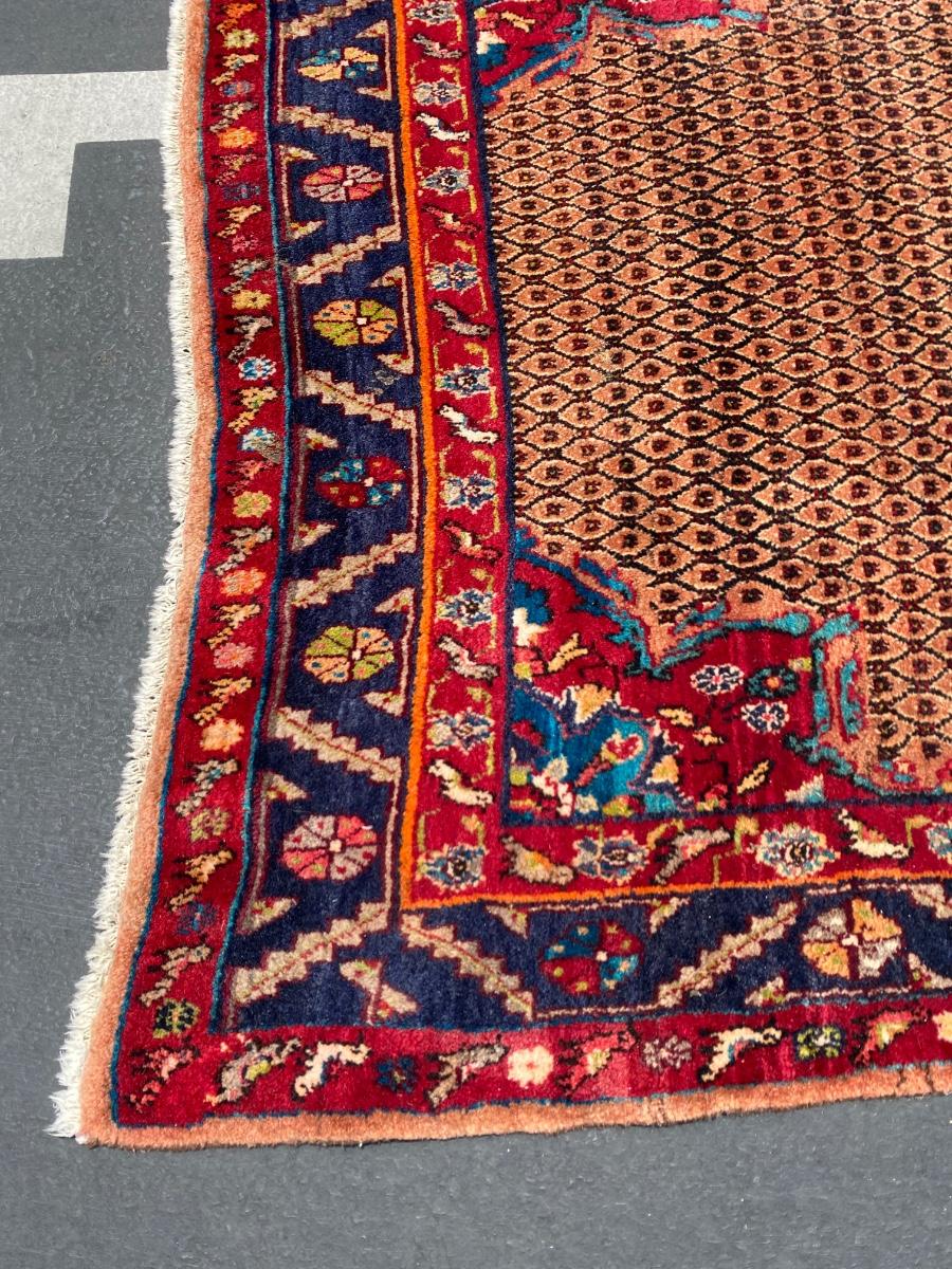 Blue & Orange Wool Area Rug Birds Flower Pattern. In good condition. Simple yet detailed design. About 5'x9.5' size. May need surface cleaned but no major spots or stains.
