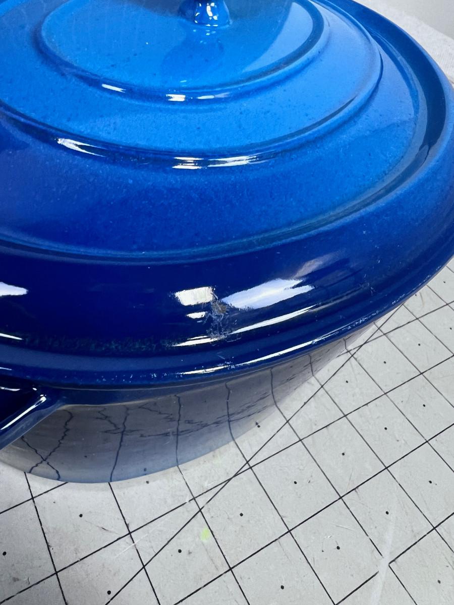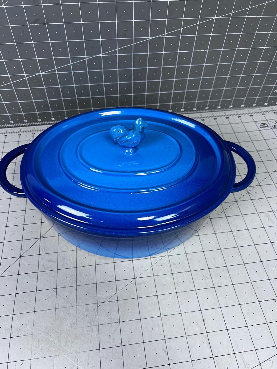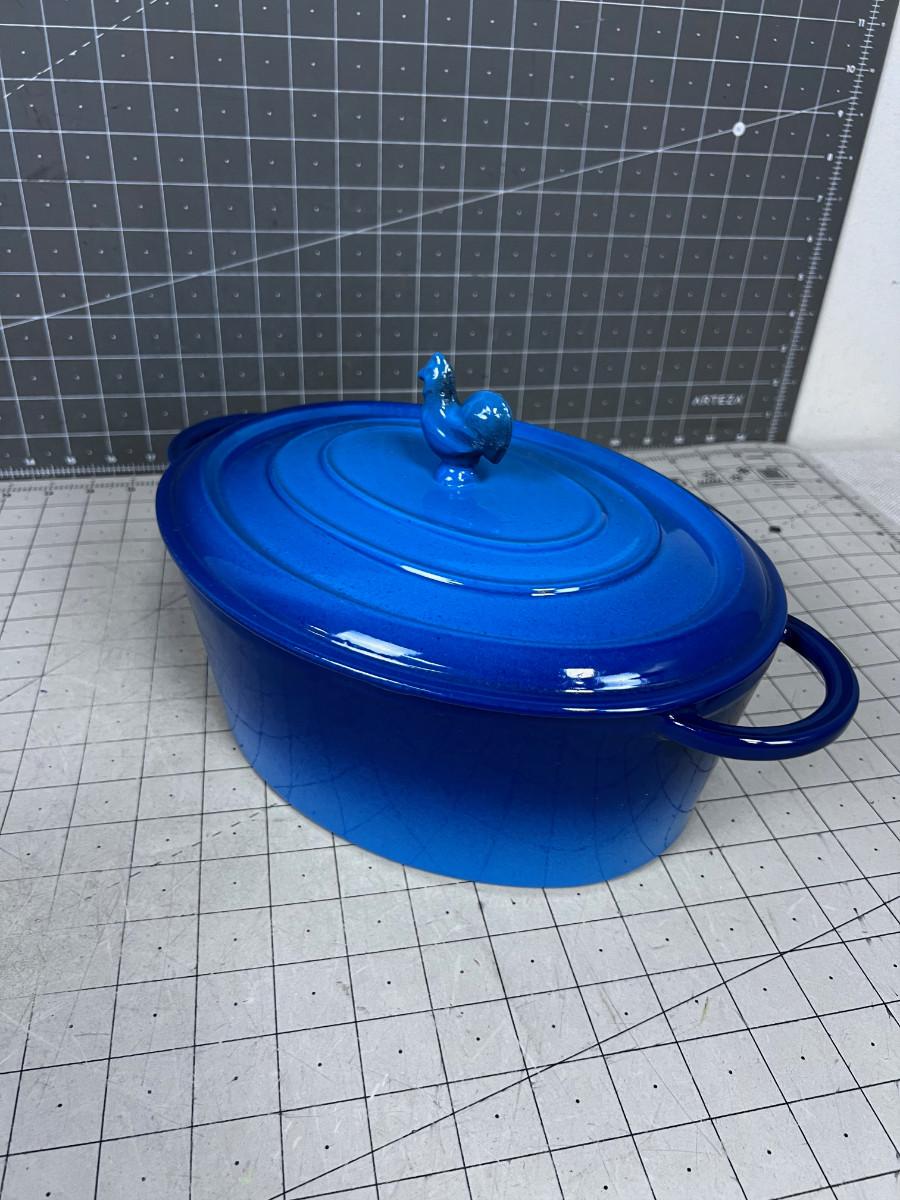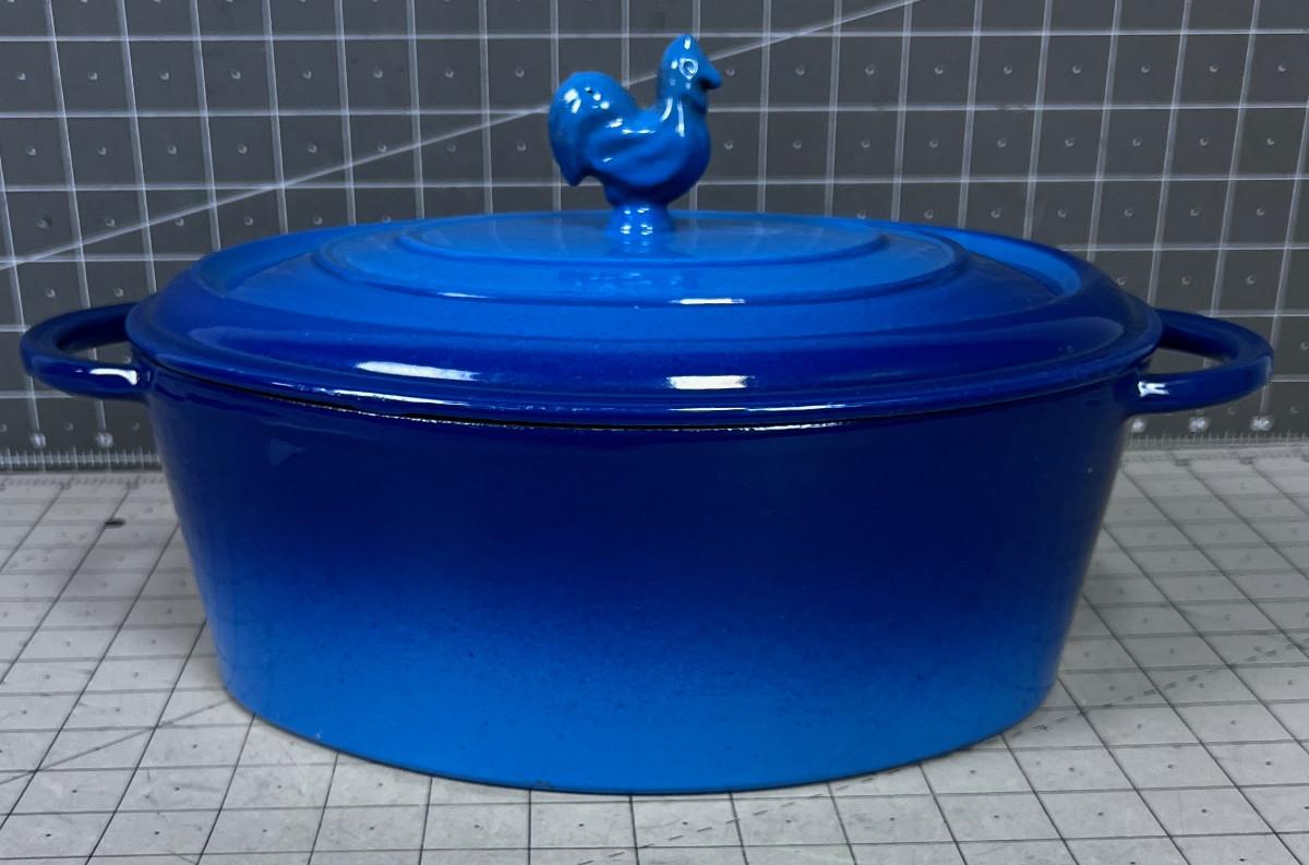 Blue Oval Cast Iron Enamel NEVER USED with ROOSTER HANDLE Pot and Lid