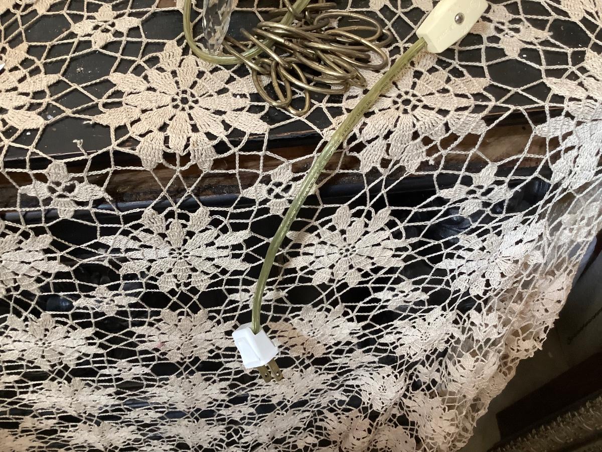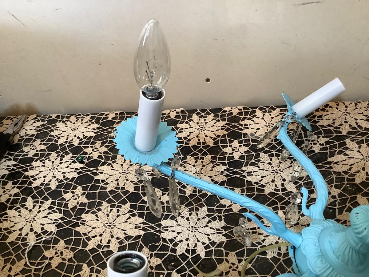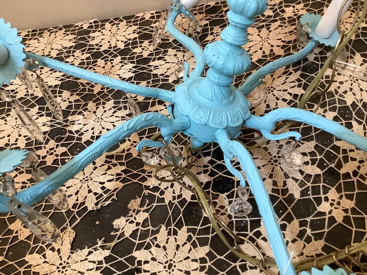 This is a great vintage chandelier that was painted turquoise blue. Has new cord with switch.