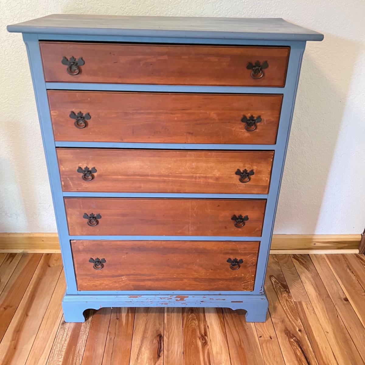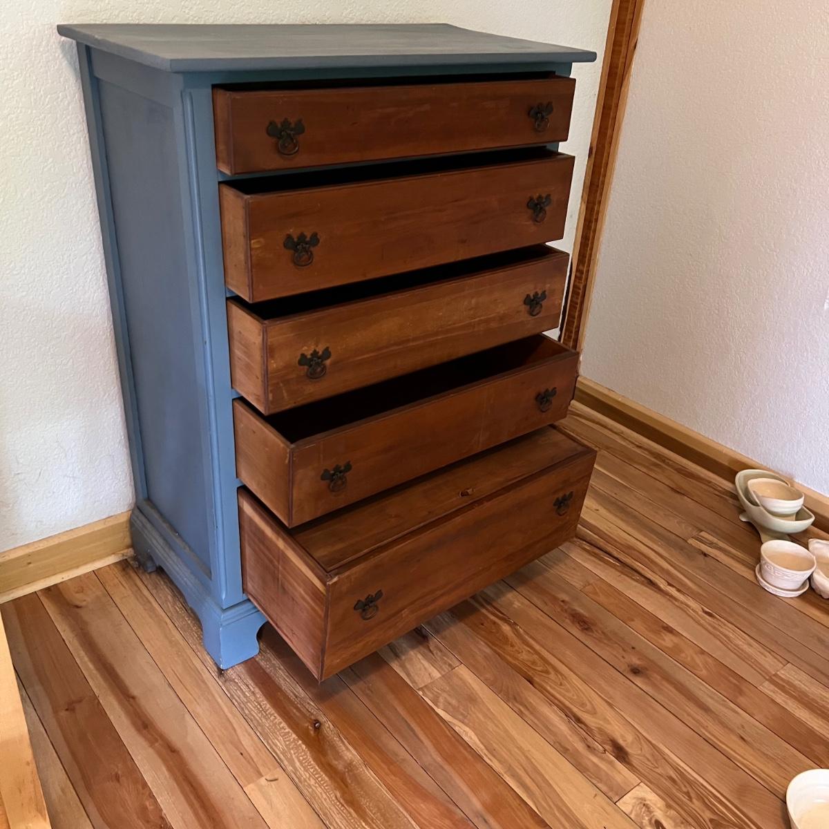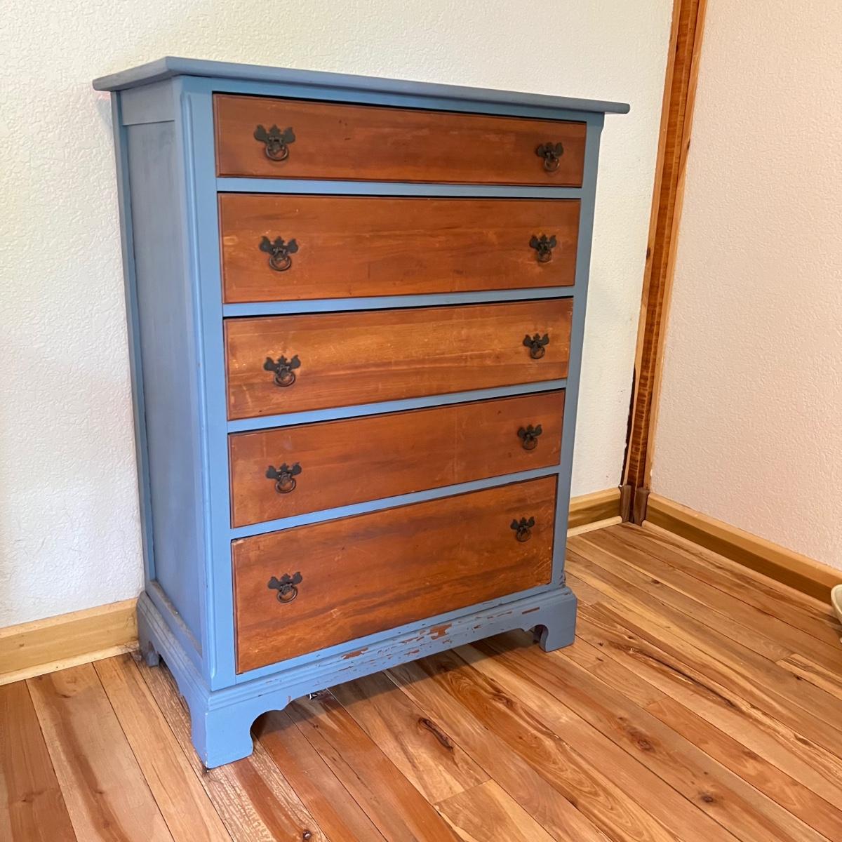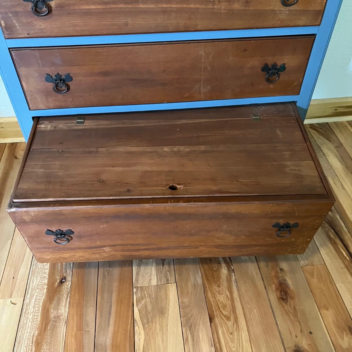 This wood dresser is painted in a Bradford blue colored paint with natural wood drawers with metal pulls. It has five drawers with the fifth (lowest) drawer having a lid. Some marks in the paint on the top surface and on the lower section are shown in images. Measures 34” x 17.5” x 45” H.