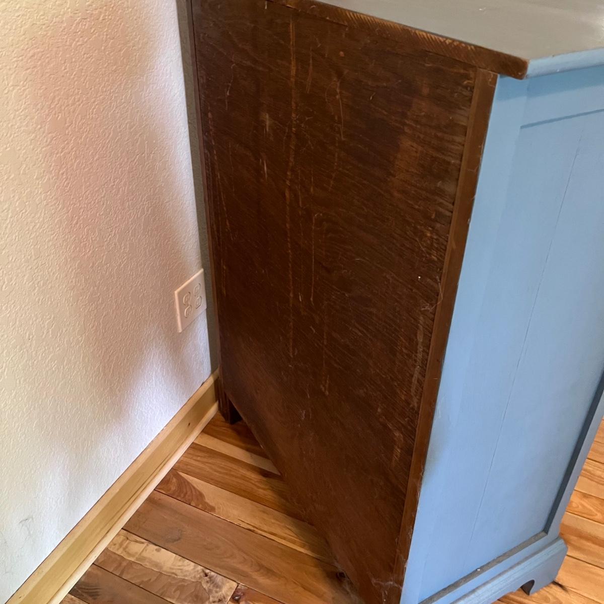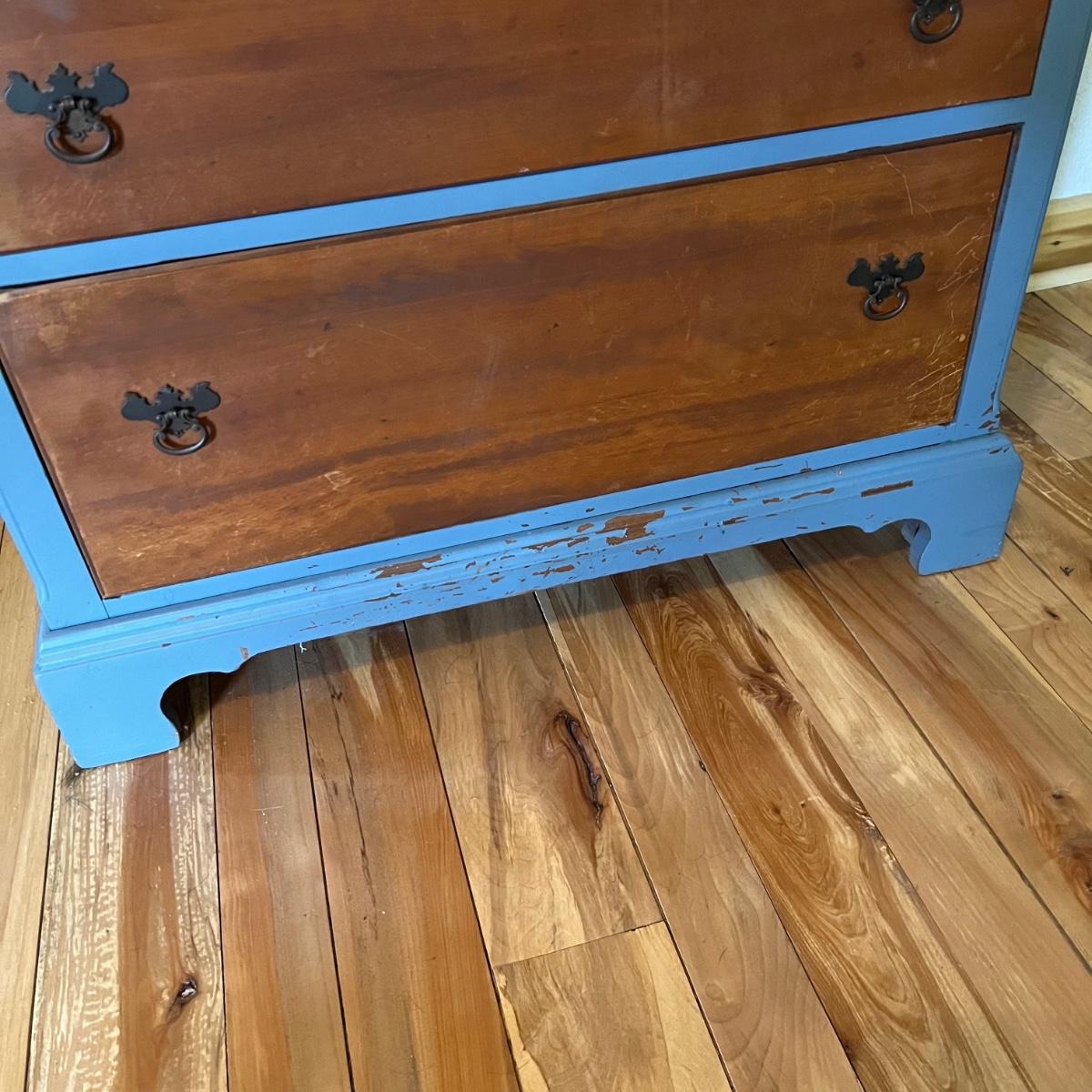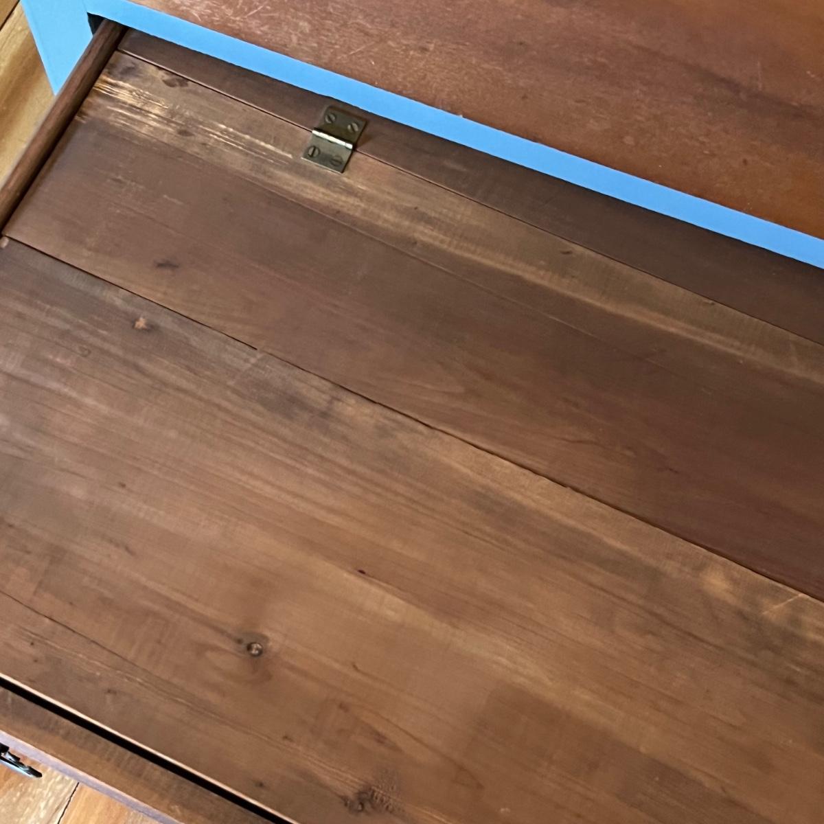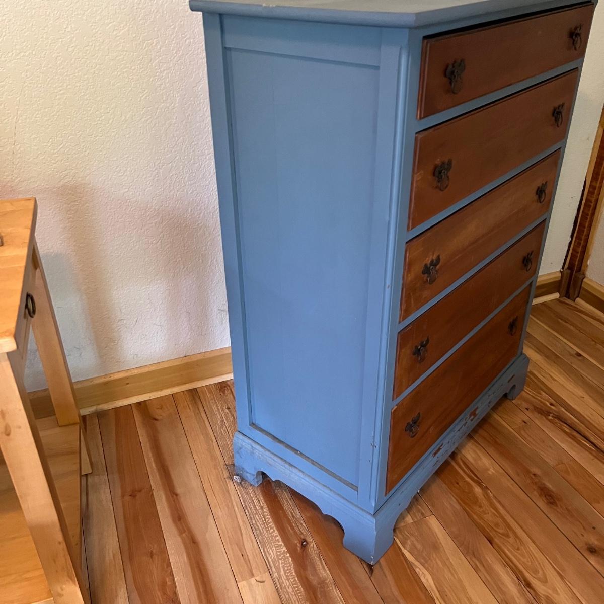 This wood dresser is painted in a Bradford blue colored paint with natural wood drawers with metal pulls. It has five drawers with the fifth (lowest) drawer having a lid. Some marks in the paint on the top surface and on the lower section are shown in images. Measures 34” x 17.5” x 45” H.