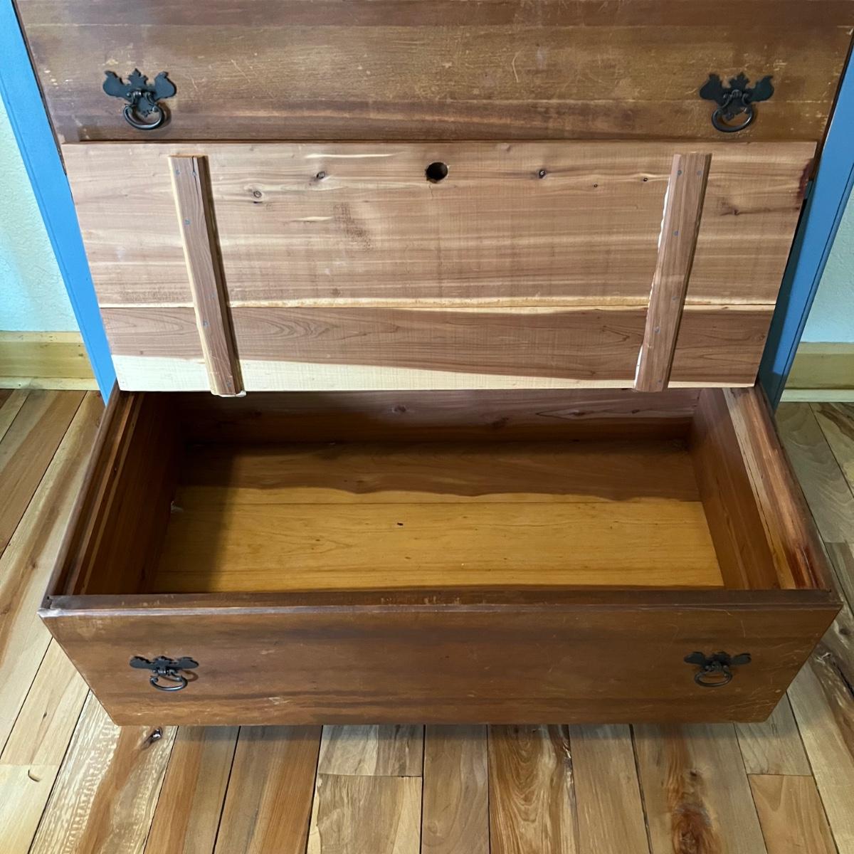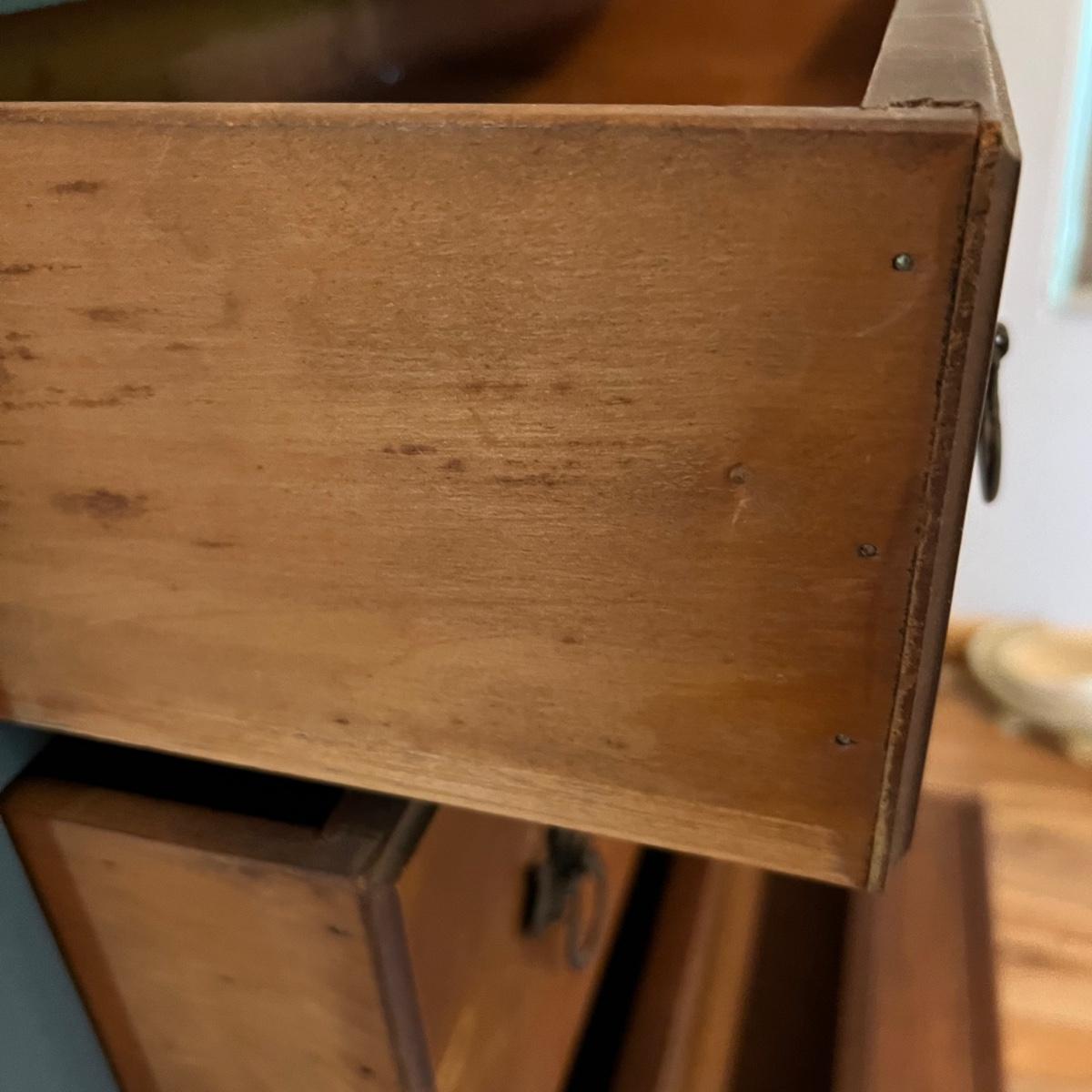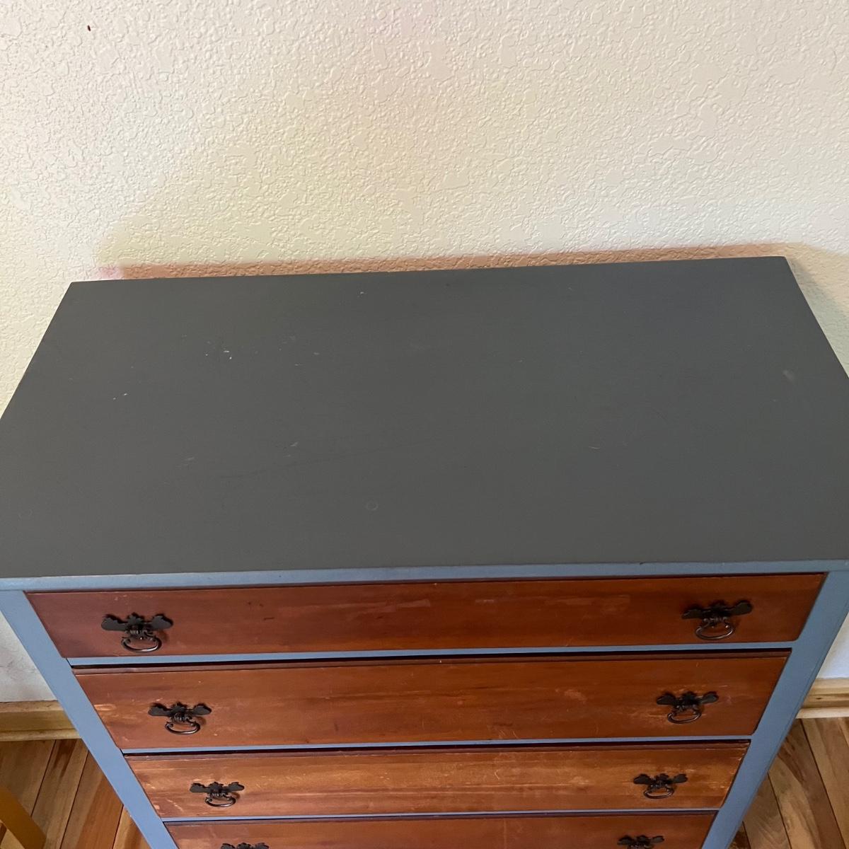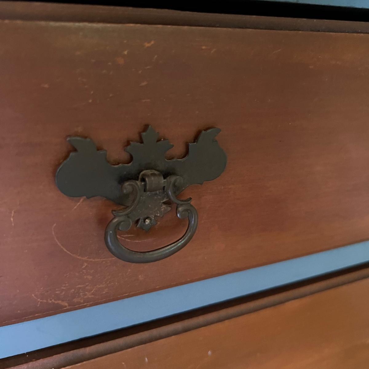 This wood dresser is painted in a Bradford blue colored paint with natural wood drawers with metal pulls. It has five drawers with the fifth (lowest) drawer having a lid. Some marks in the paint on the top surface and on the lower section are shown in images. Measures 34” x 17.5” x 45” H.