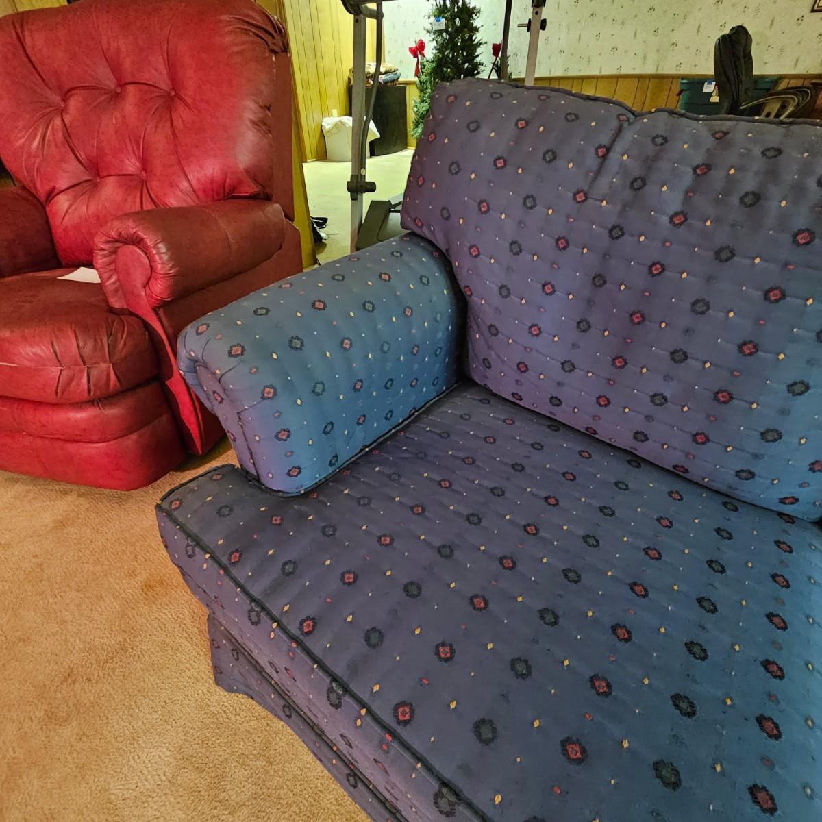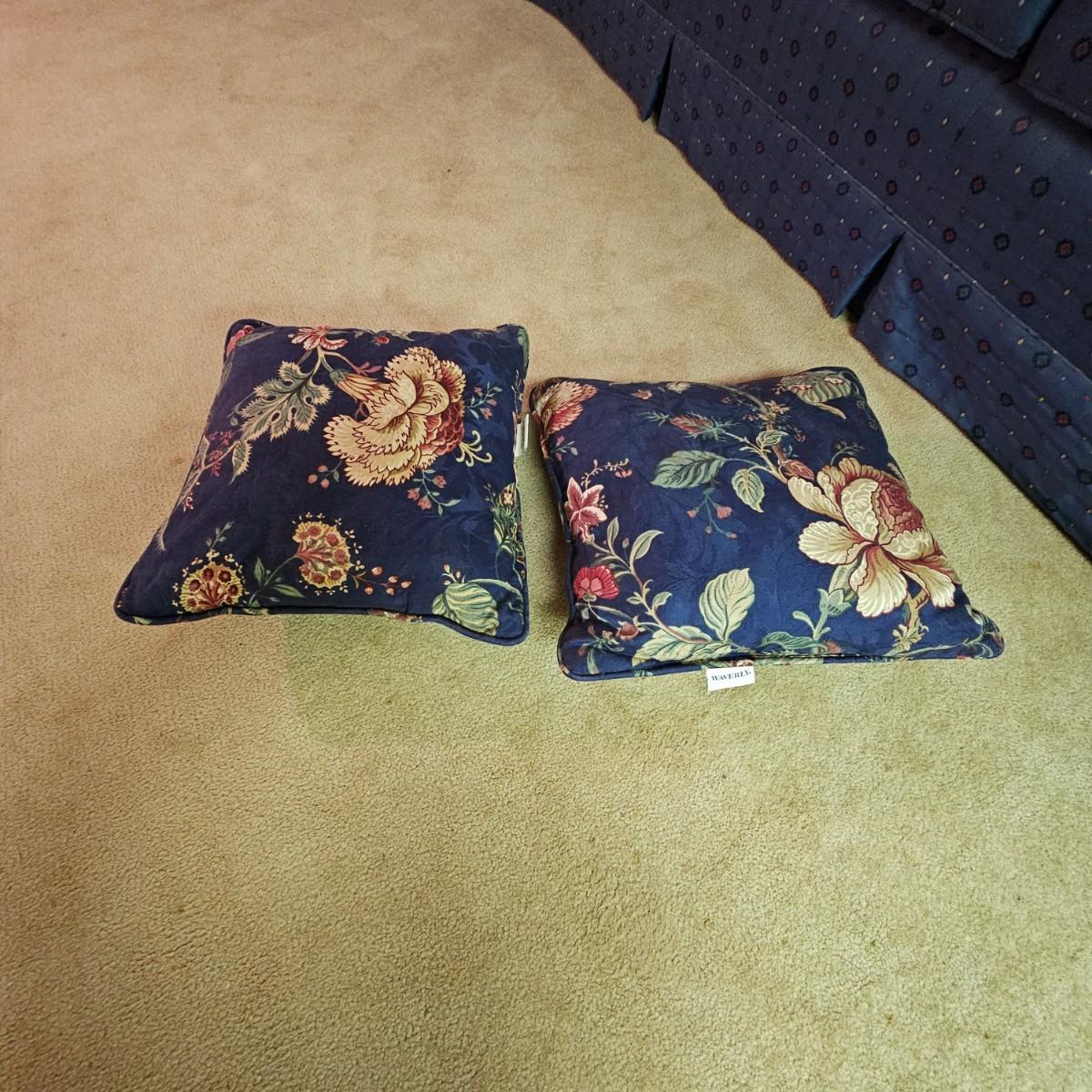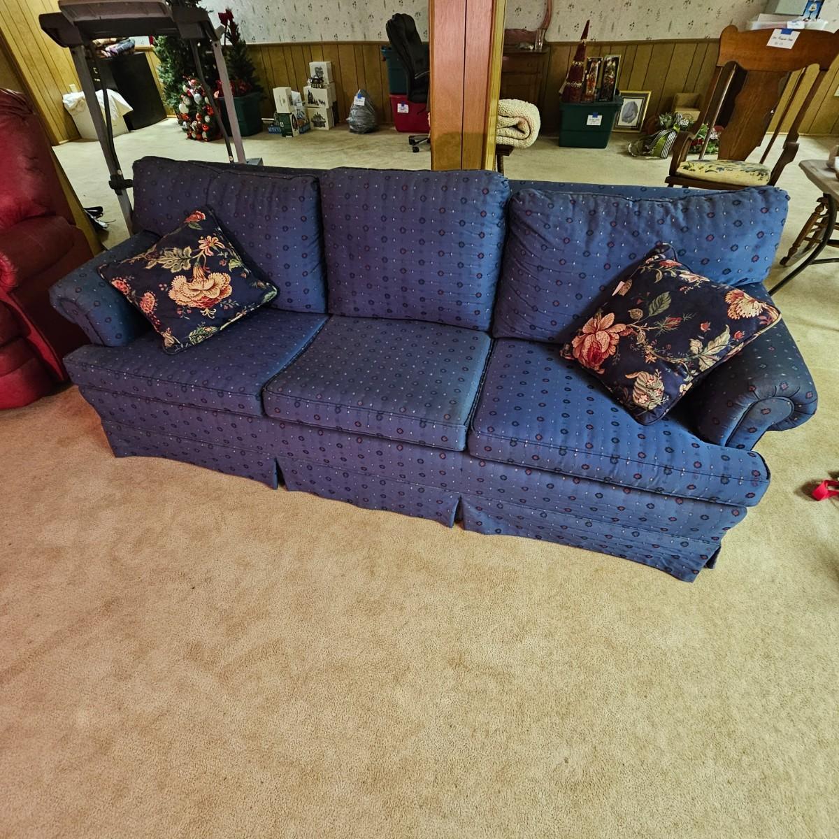 Dark blue three seat couch with two pillows. All cushions removable. Couch appears to have been reupholstered, measures 82" x 34" x 33" H with 17" seat height. Pillows are by Waverly, are 14"Sq. Some light soil on tops of seat cushions and arms, see photos for details. Local pickup only. Winning bidder must bring assistance to help move and load this item due to its weight and/or size.