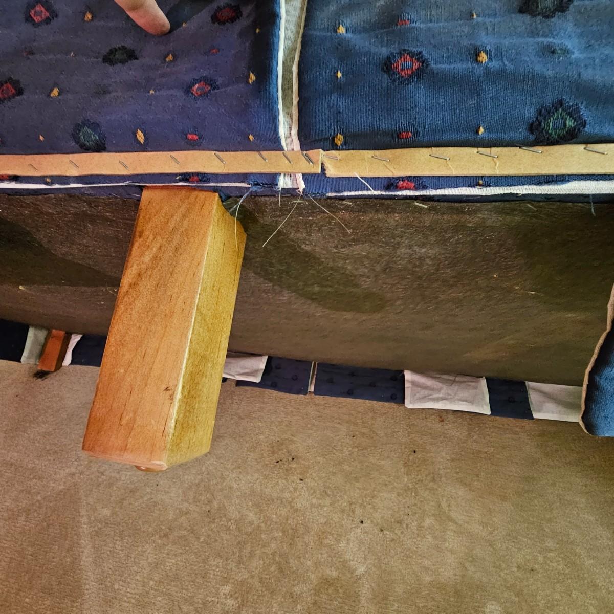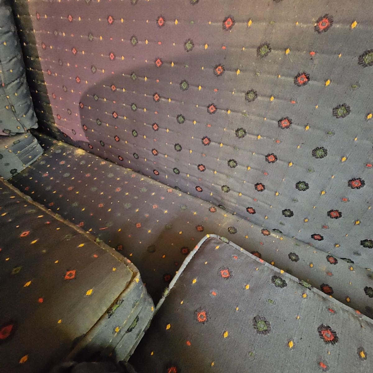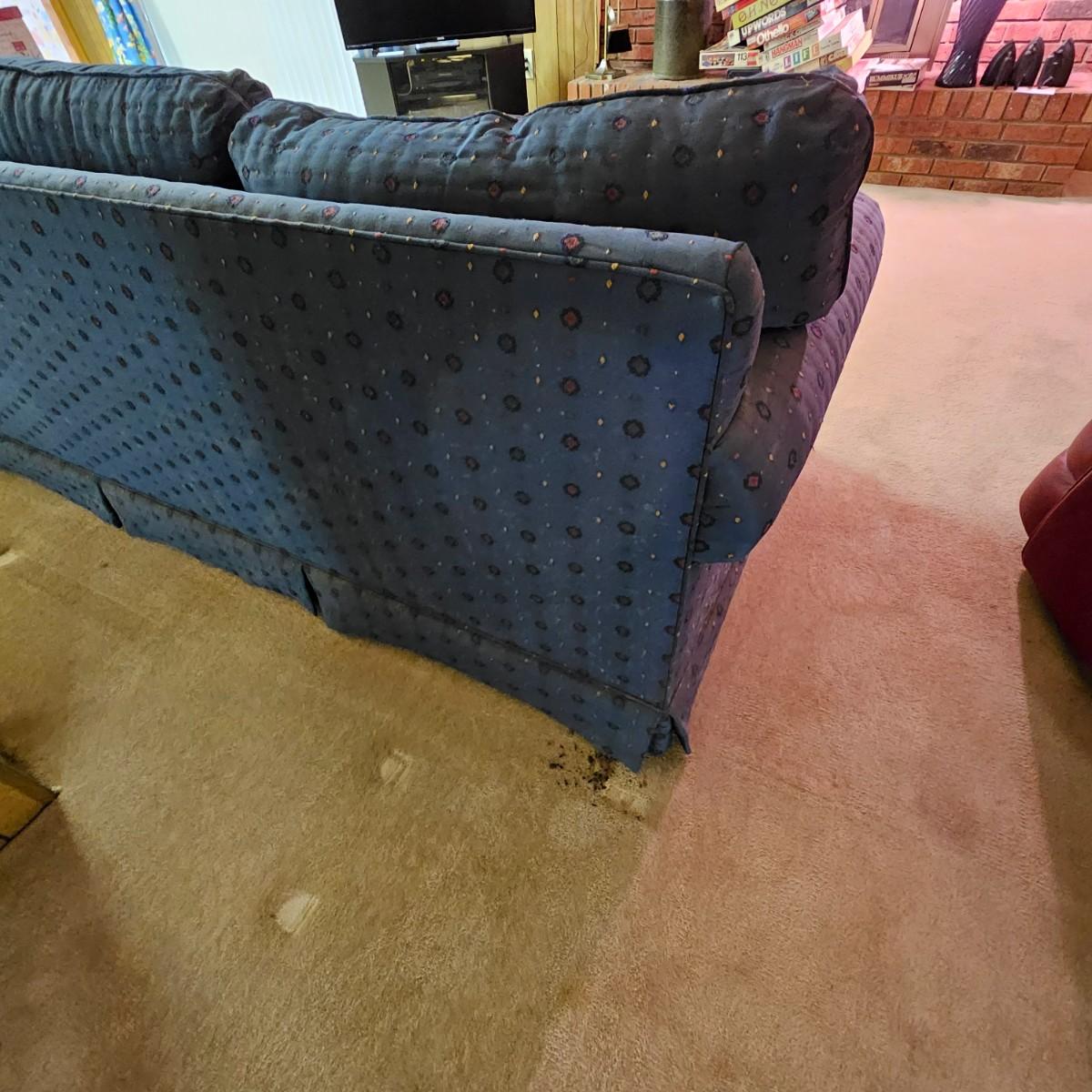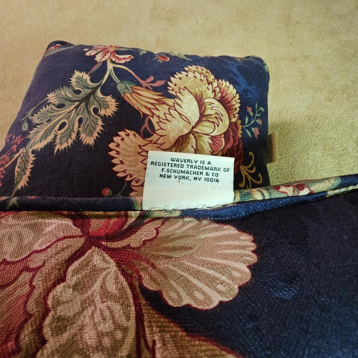 Dark blue three seat couch with two pillows. All cushions removable. Couch appears to have been reupholstered, measures 82" x 34" x 33" H with 17" seat height. Pillows are by Waverly, are 14"Sq. Some light soil on tops of seat cushions and arms, see photos for details. Local pickup only. Winning bidder must bring assistance to help move and load this item due to its weight and/or size.