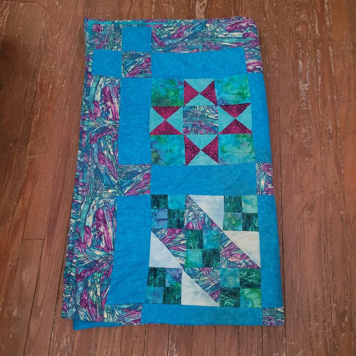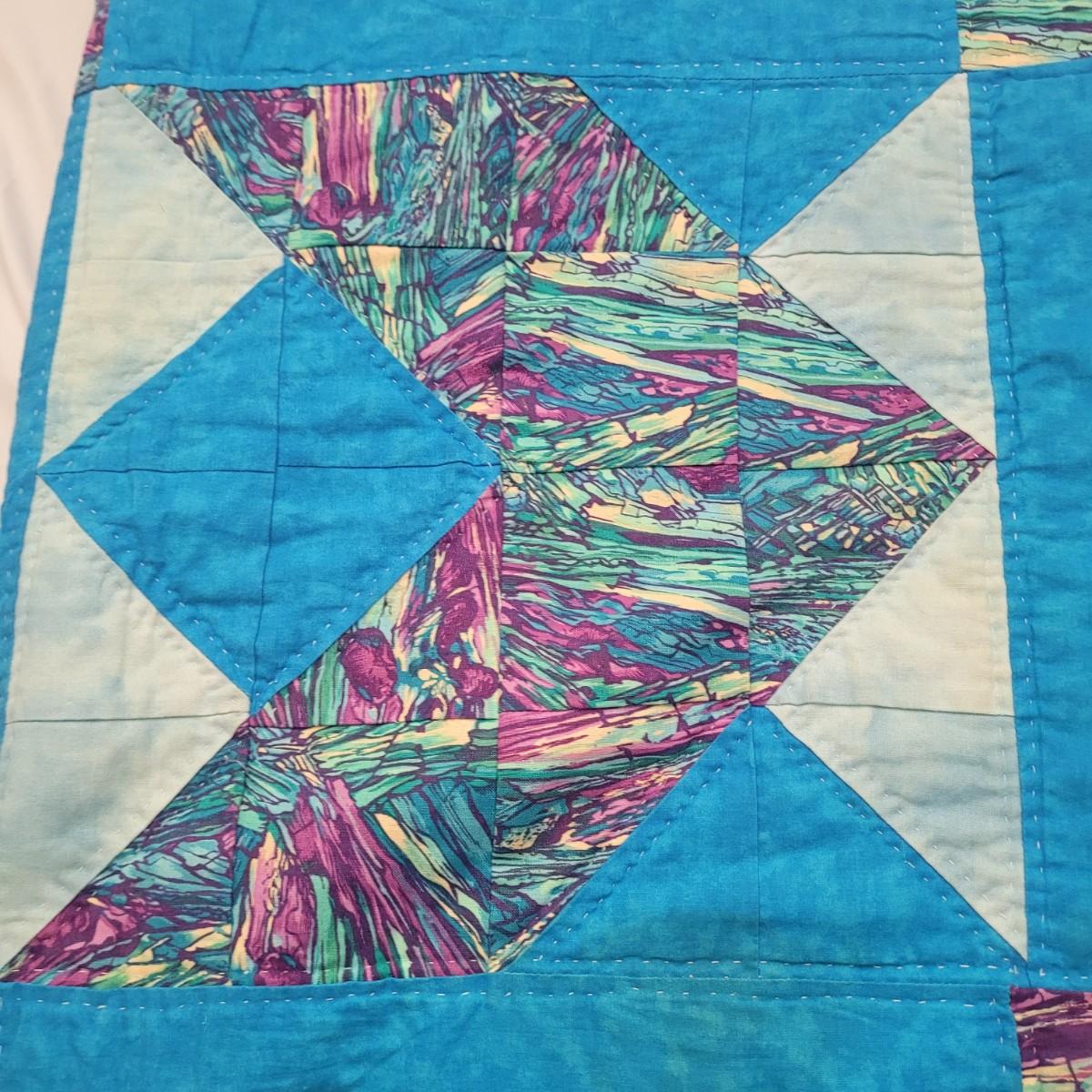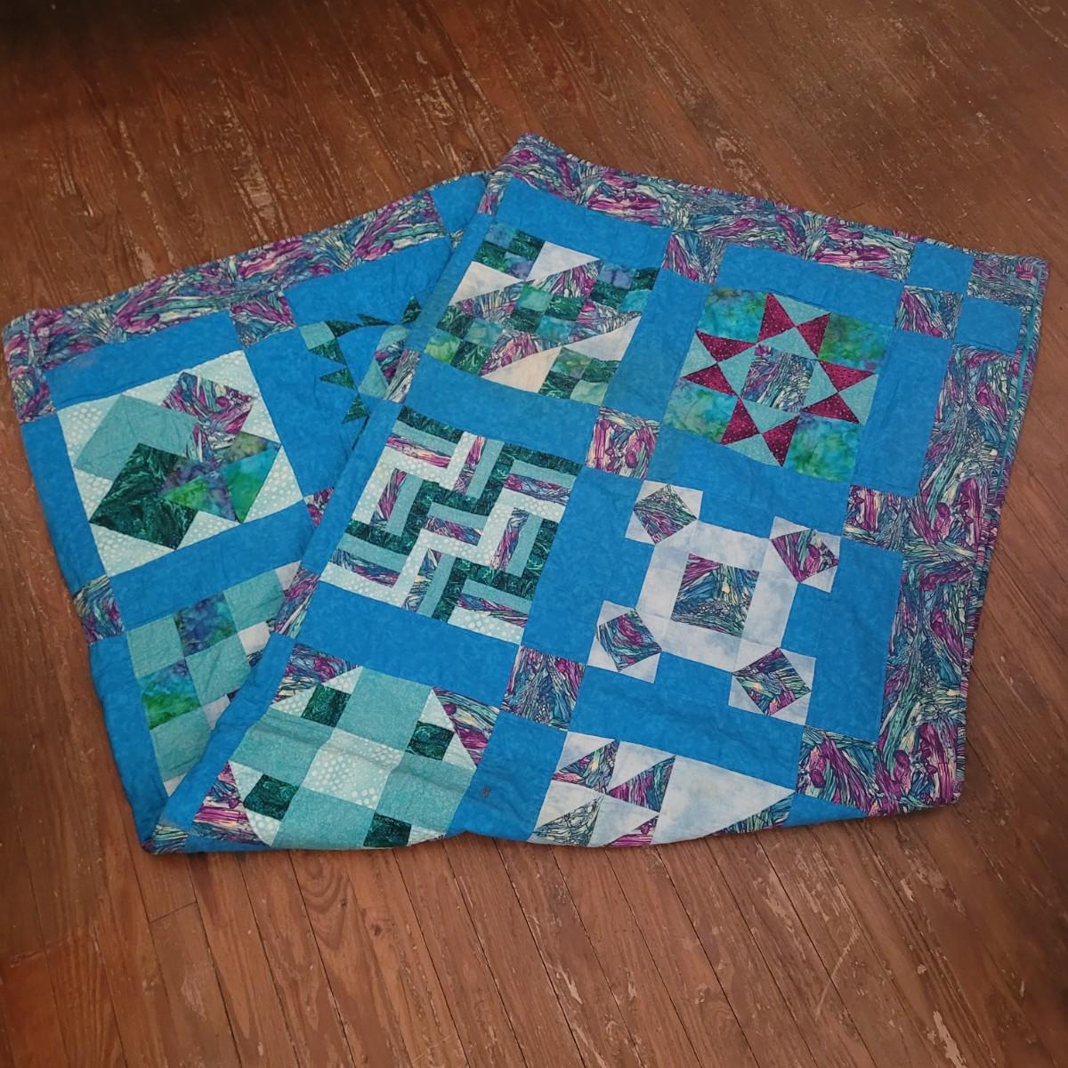 Appears to be a handmade multi-layered quilt. Made from various materials. Does not have a tag or any attached information. Quality stitching all around. No visible rips or tears. Quilt measures 70" x 87".