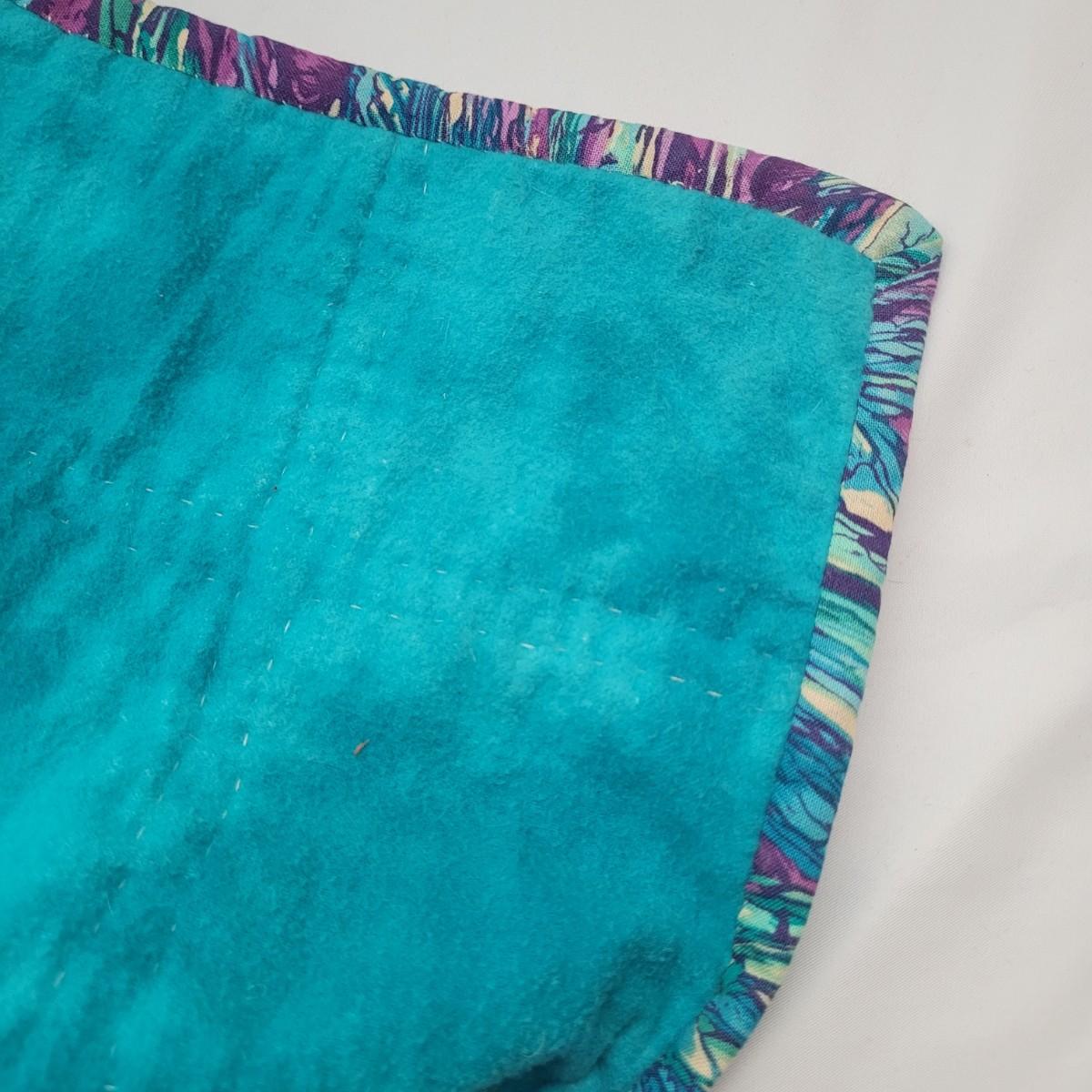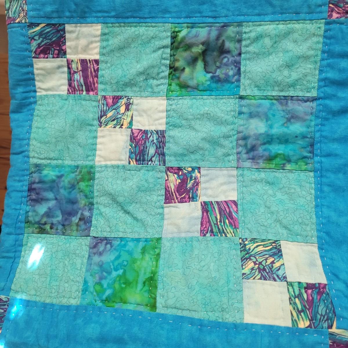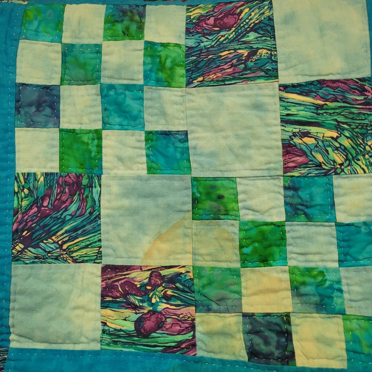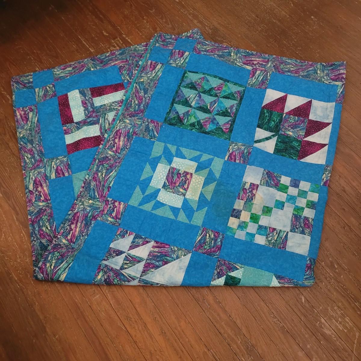Appears to be a handmade multi-layered quilt. Made from various materials. Does not have a tag or any attached information. Quality stitching all around. No visible rips or tears. Quilt measures 70" x 87".