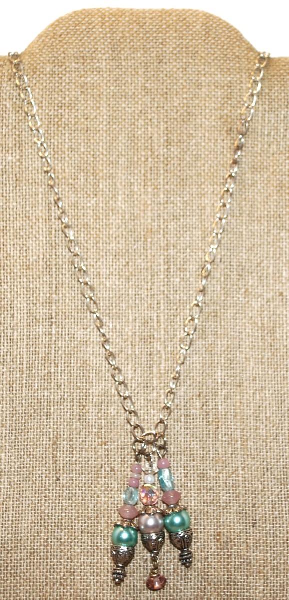 Blue & Pink Dangles Bead on a Silver Tone Necklace Chain 26" L