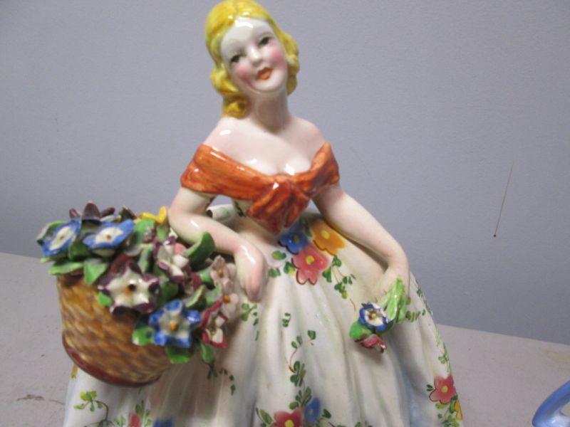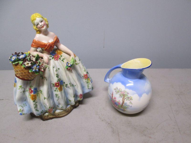 Blue Pitcher - England Falcon ware & Woman Carrying Flower Basket