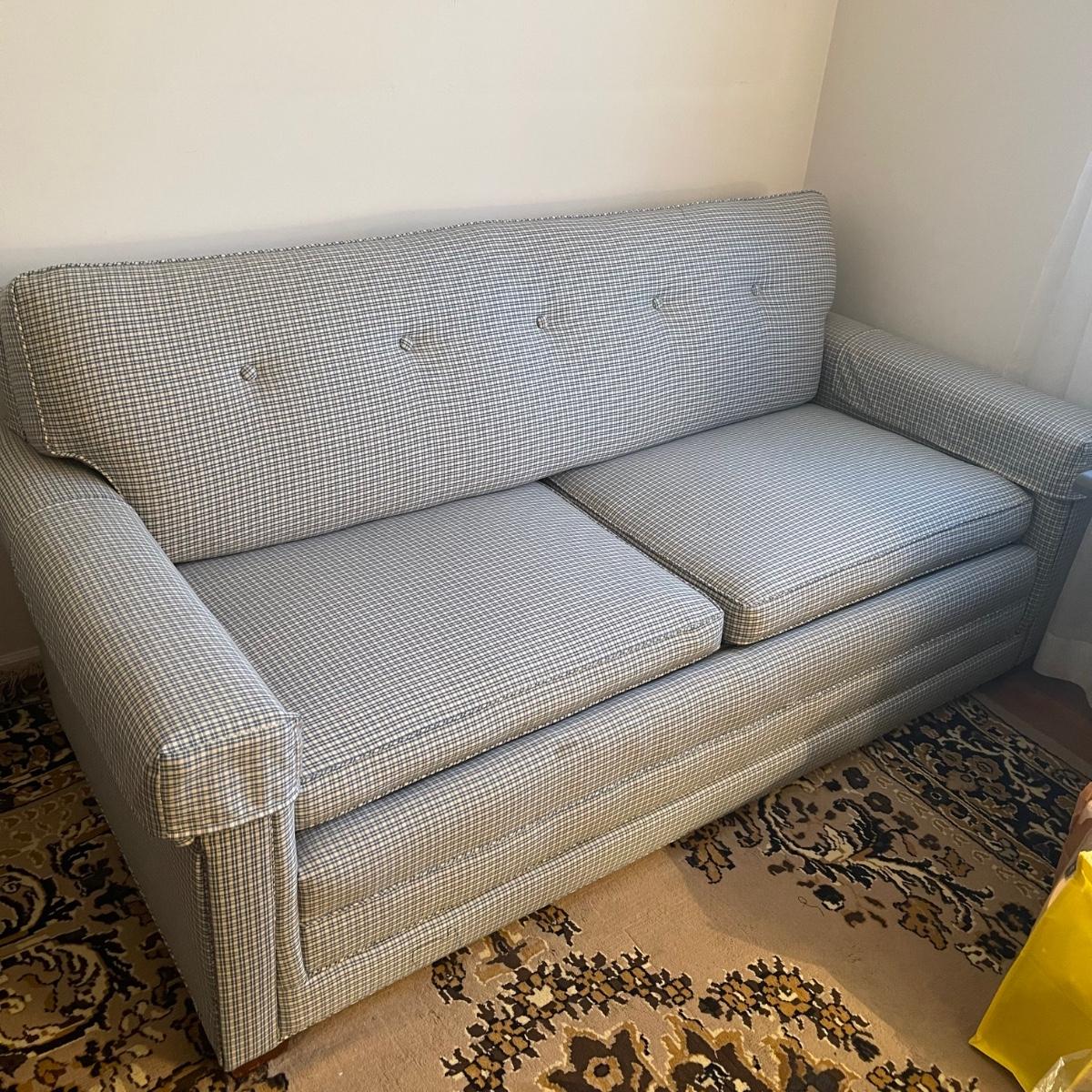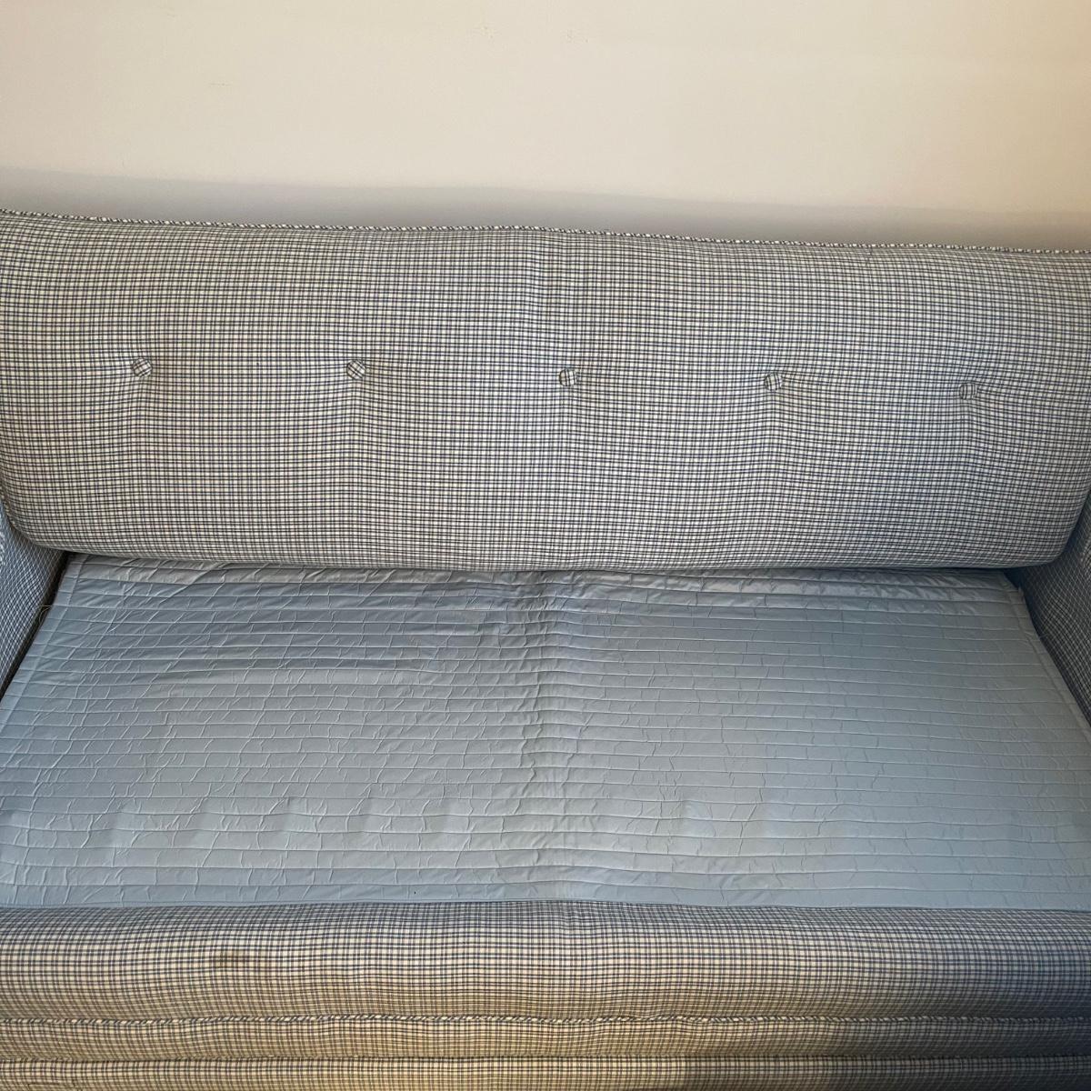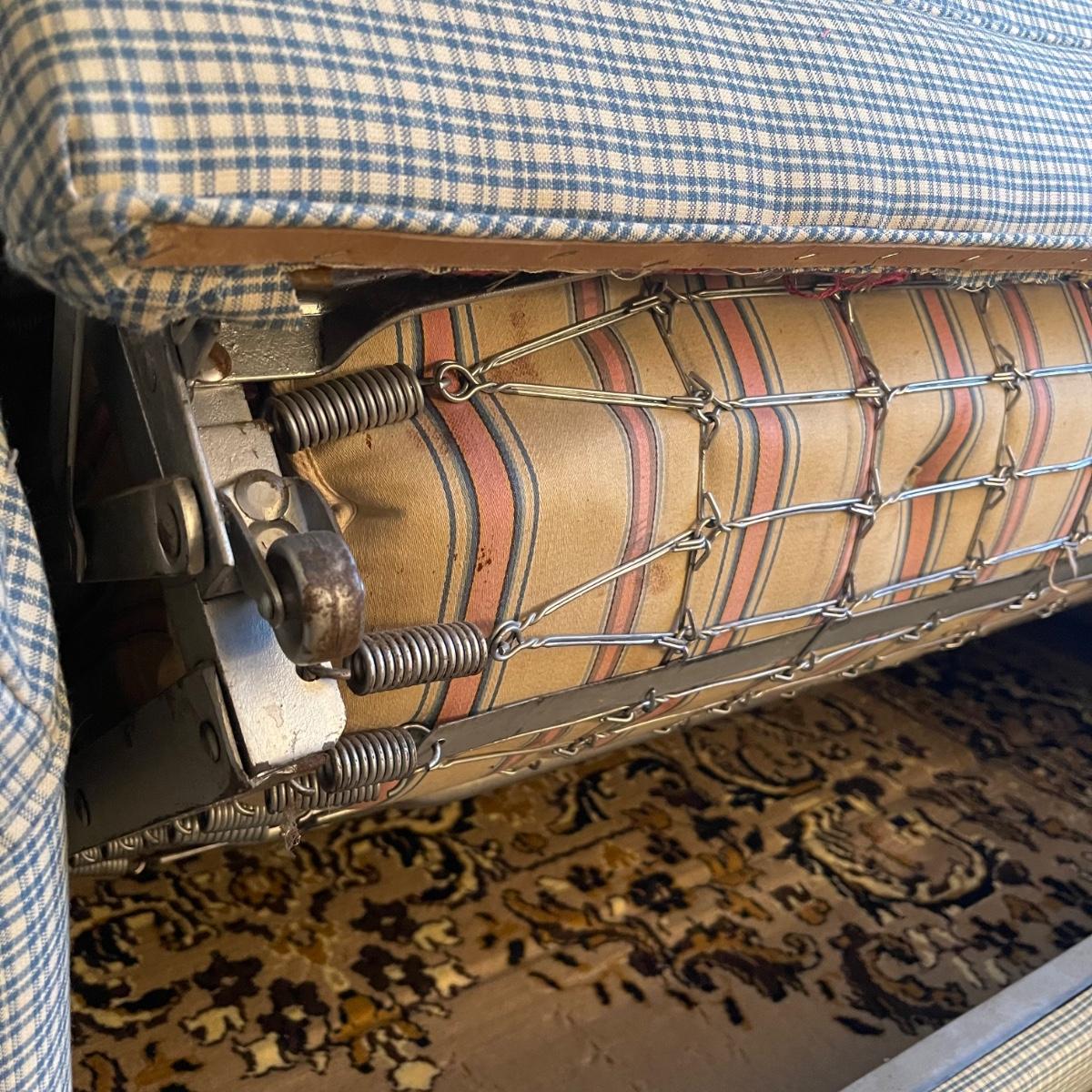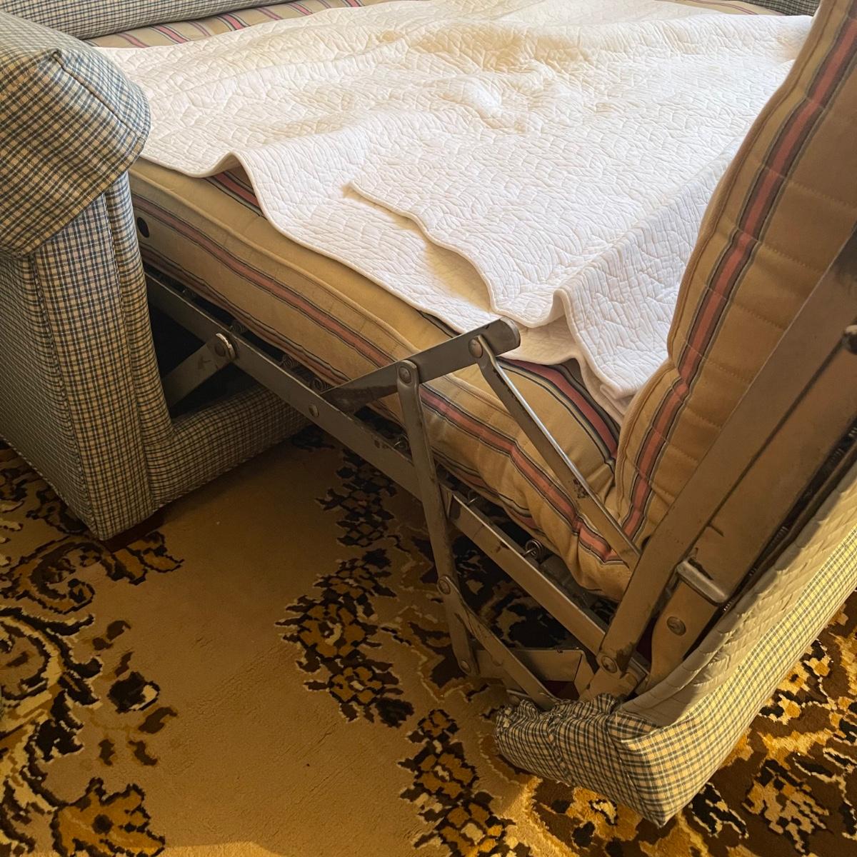 This couch measures 6’ wide x 3’ 2” deep x 2’ 6” tall. It has a full sized pullout bed that has been covered and appears to be in good condition with no visible stains/tears/wear. It pulls out easily. The blue plaid upholstery has a few yellowish stains on the front but aren’t too noticeable.