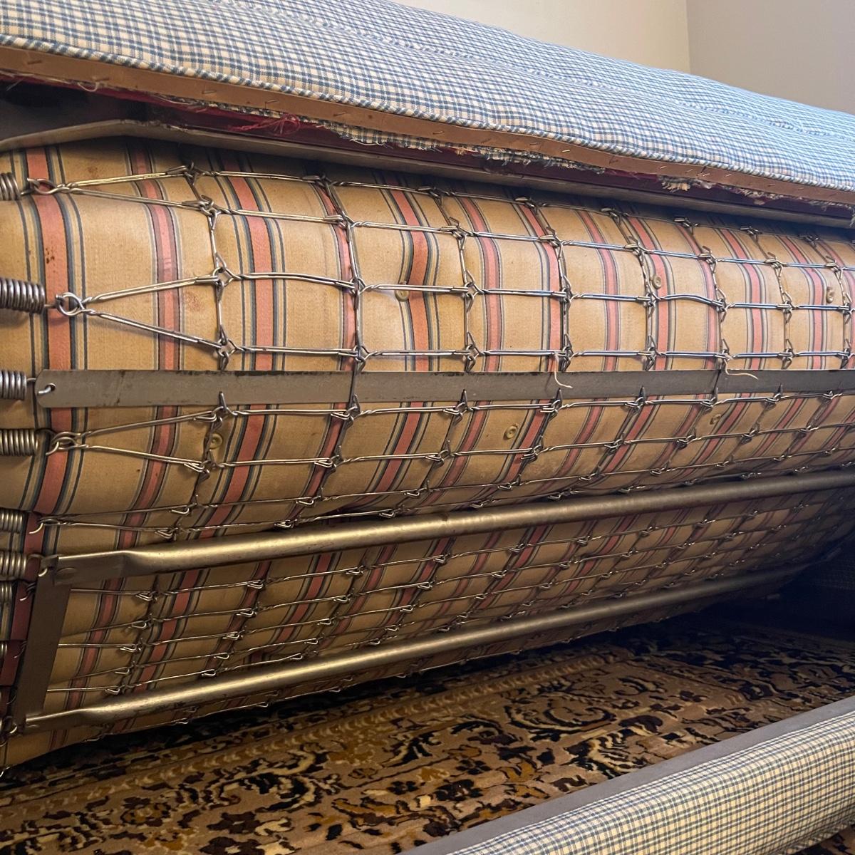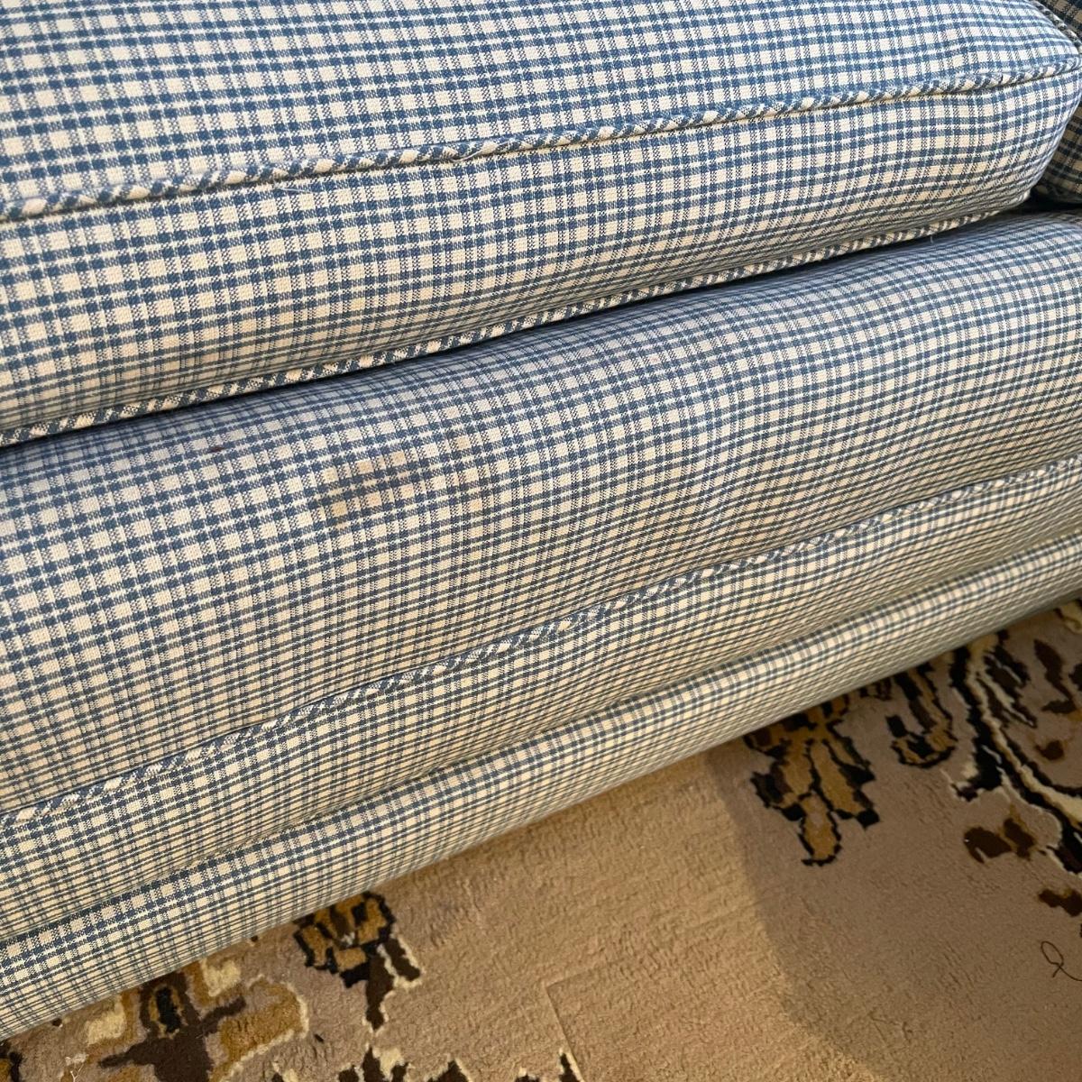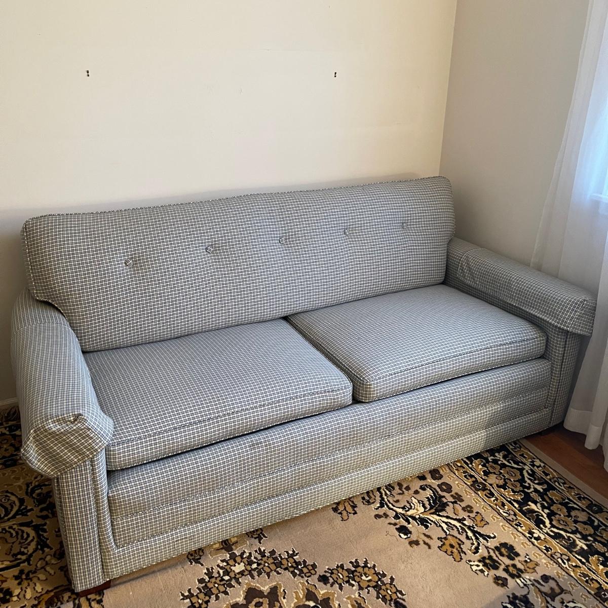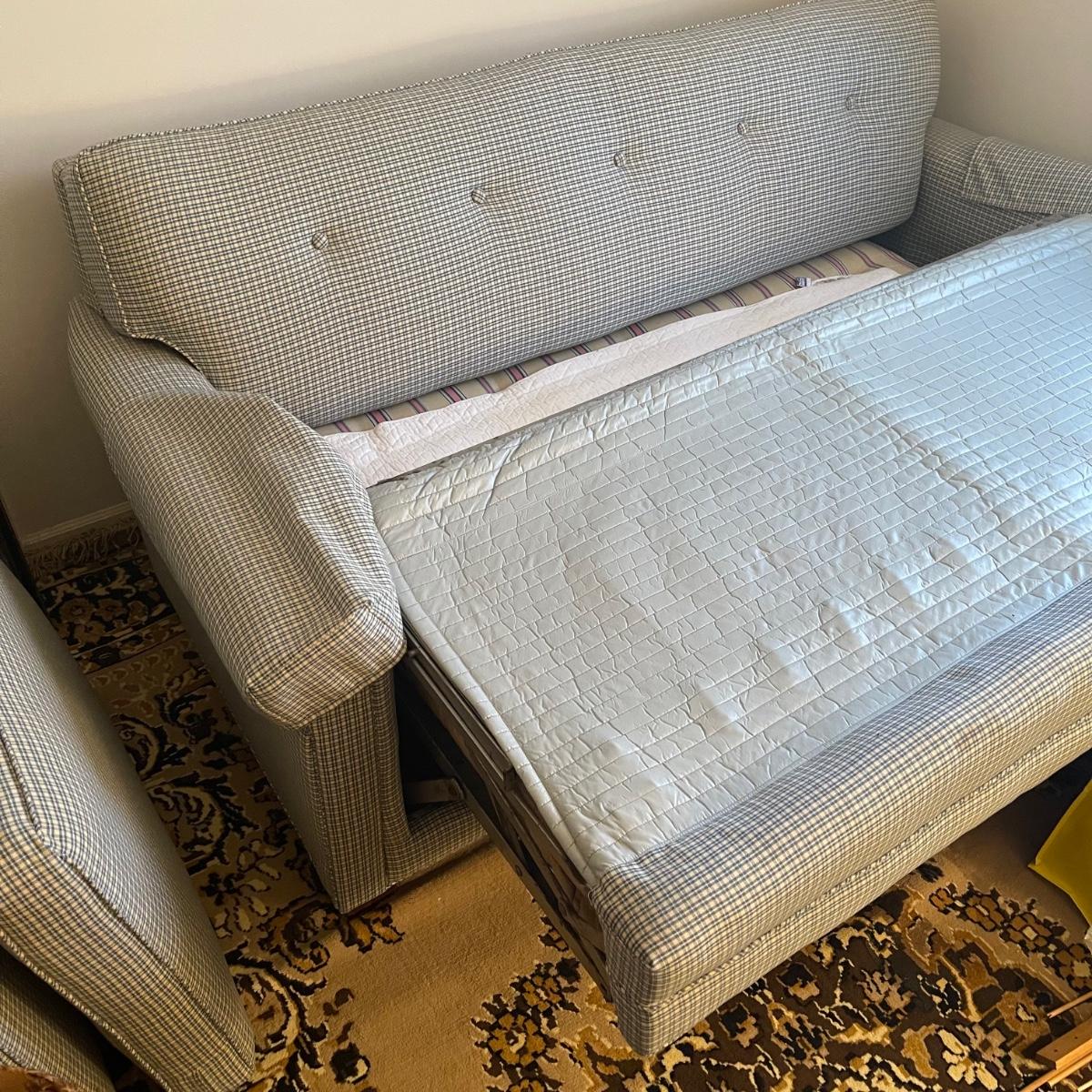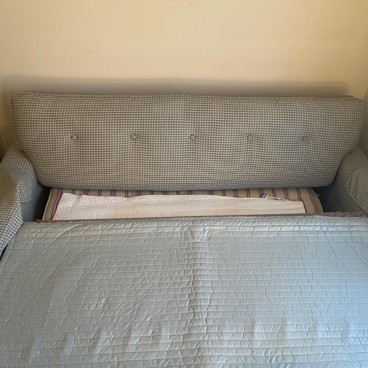 This couch measures 6’ wide x 3’ 2” deep x 2’ 6” tall. It has a full sized pullout bed that has been covered and appears to be in good condition with no visible stains/tears/wear. It pulls out easily. The blue plaid upholstery has a few yellowish stains on the front but aren’t too noticeable.