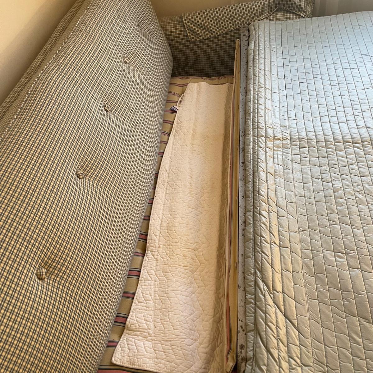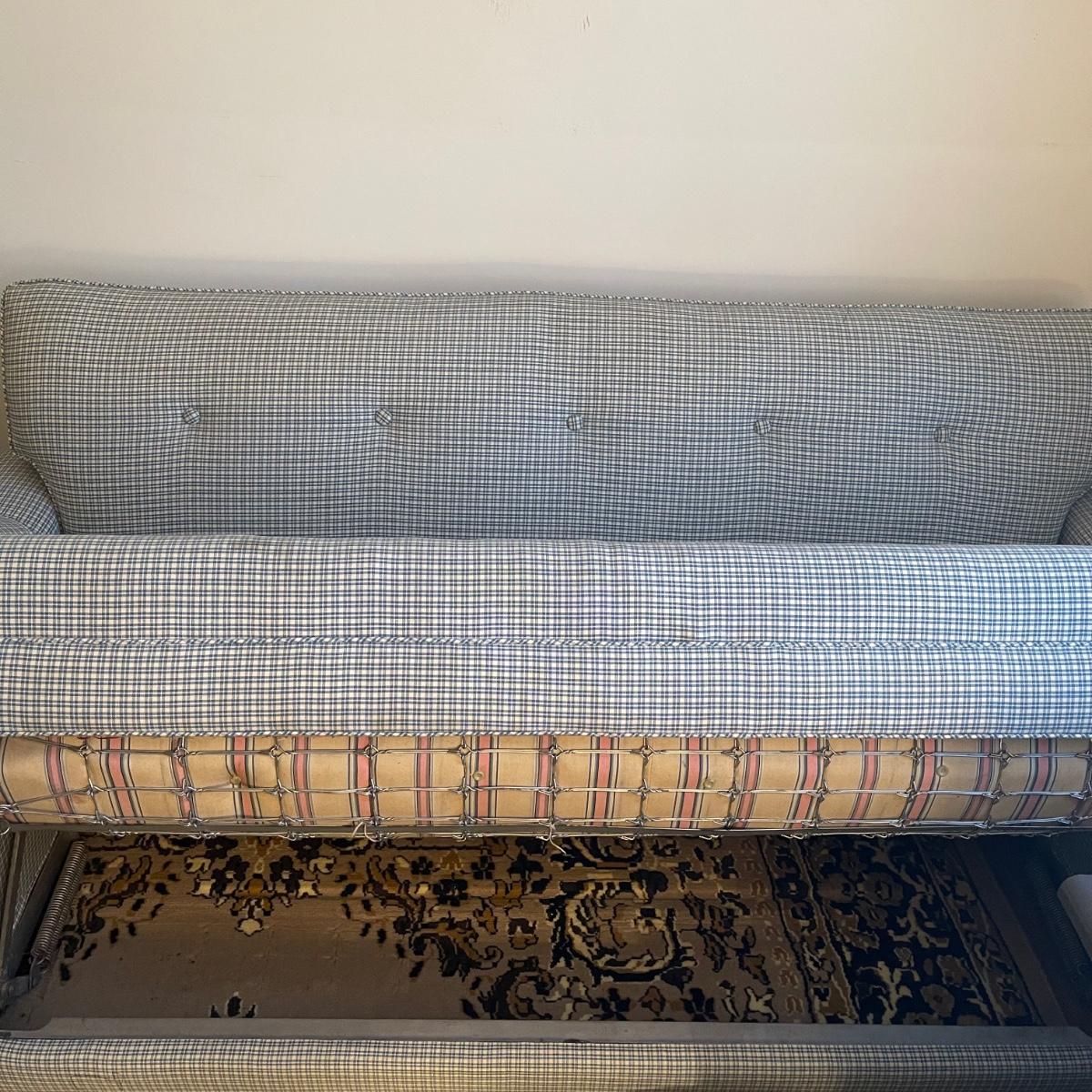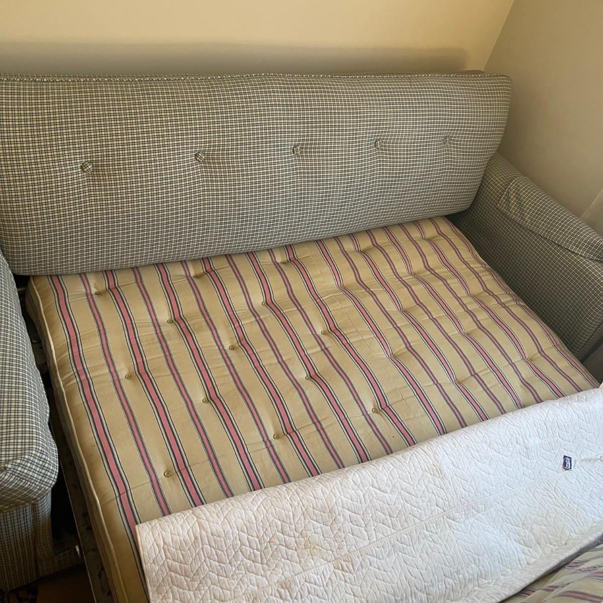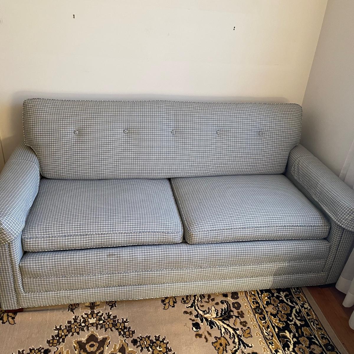 This couch measures 6’ wide x 3’ 2” deep x 2’ 6” tall. It has a full sized pullout bed that has been covered and appears to be in good condition with no visible stains/tears/wear. It pulls out easily. The blue plaid upholstery has a few yellowish stains on the front but aren’t too noticeable.