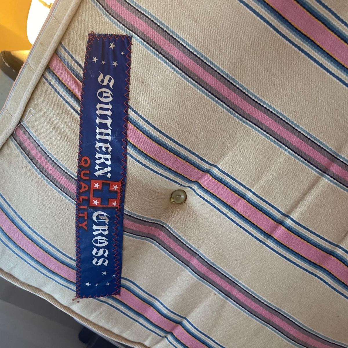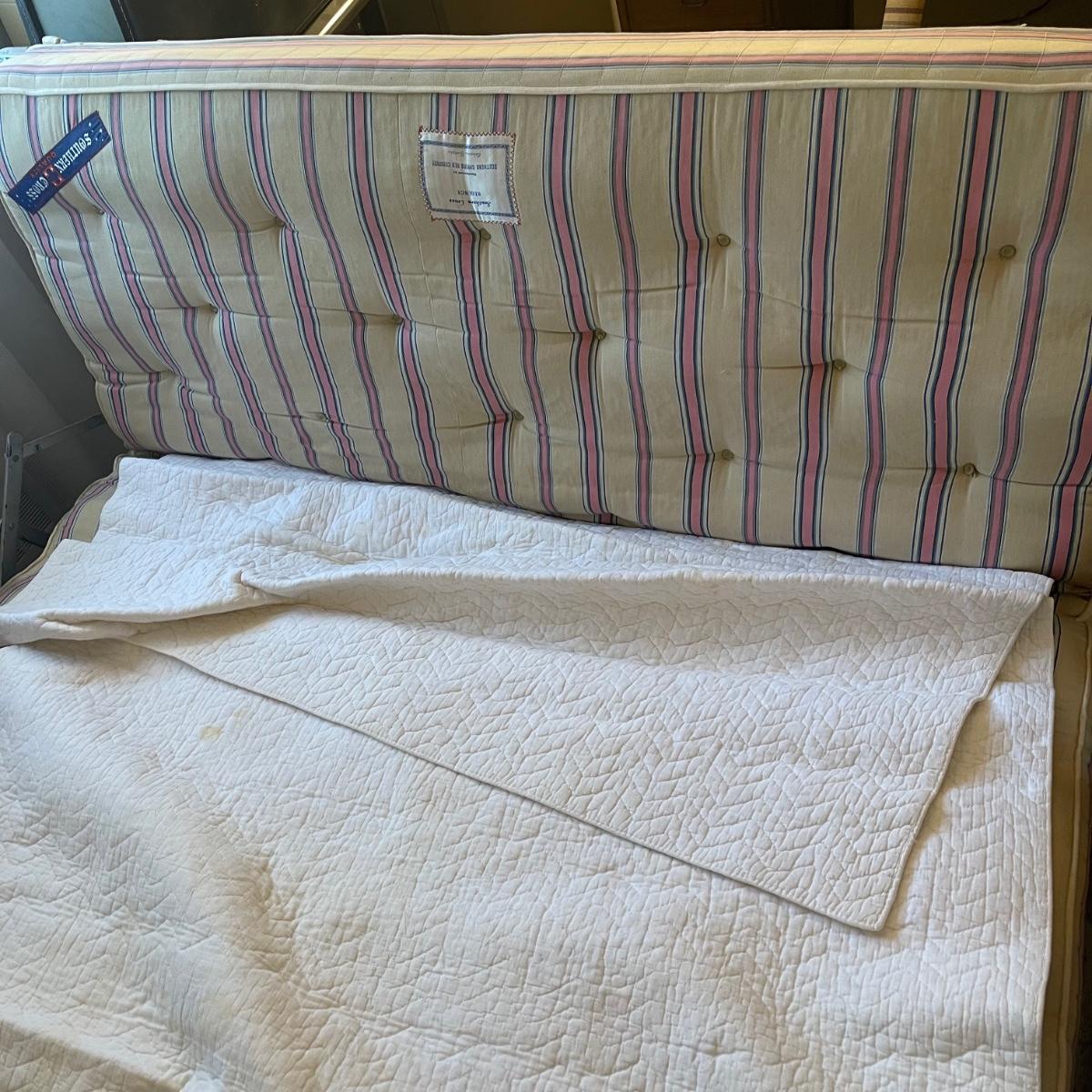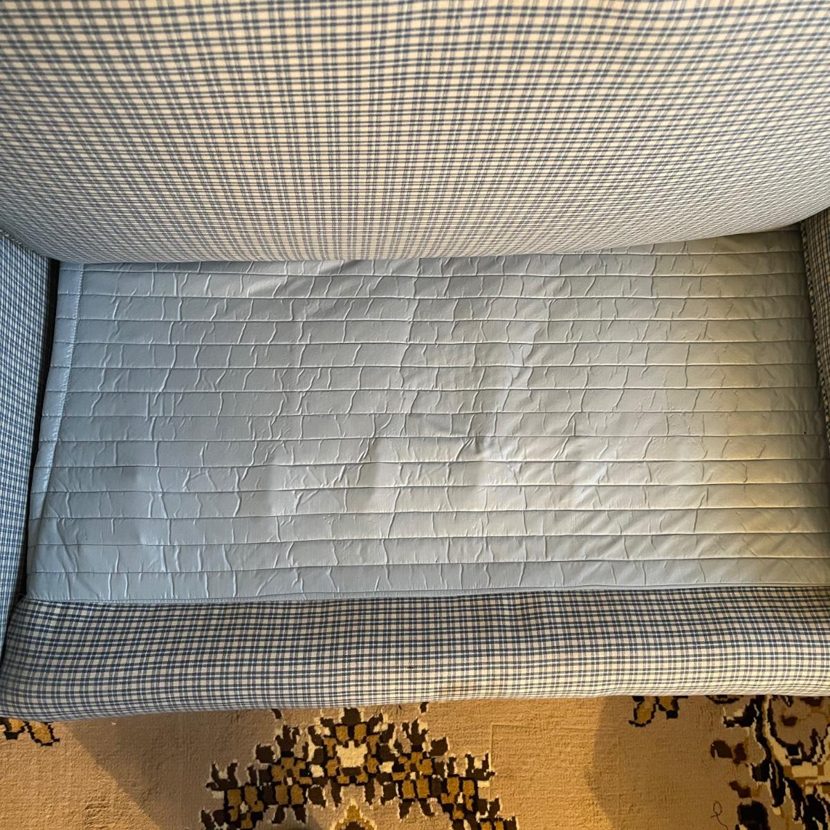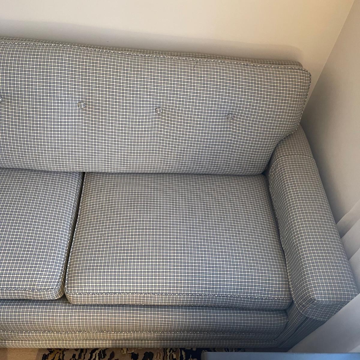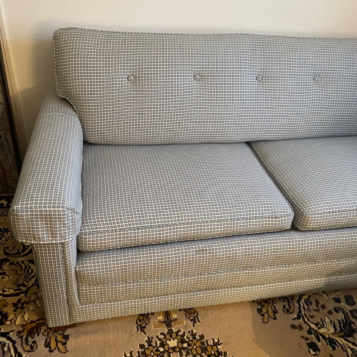 This couch measures 6’ wide x 3’ 2” deep x 2’ 6” tall. It has a full sized pullout bed that has been covered and appears to be in good condition with no visible stains/tears/wear. It pulls out easily. The blue plaid upholstery has a few yellowish stains on the front but aren’t too noticeable.