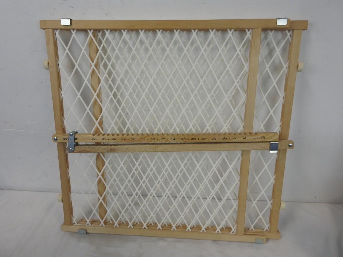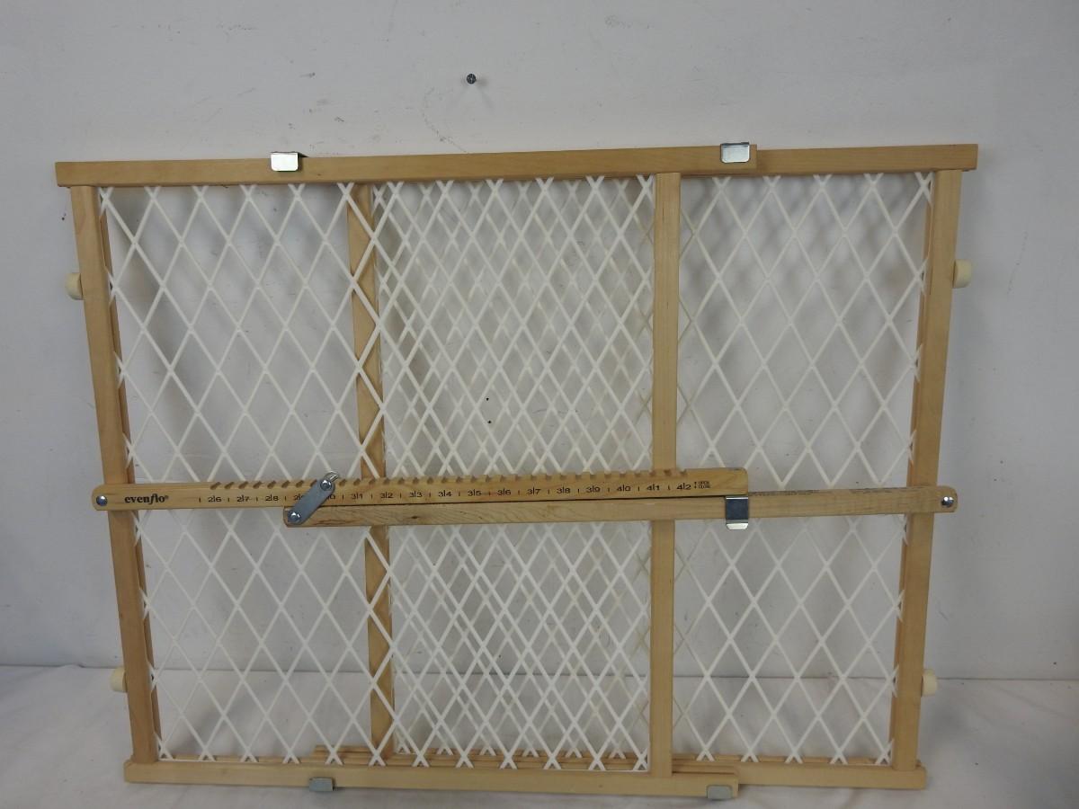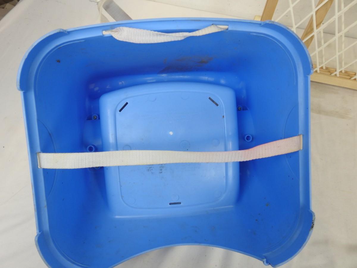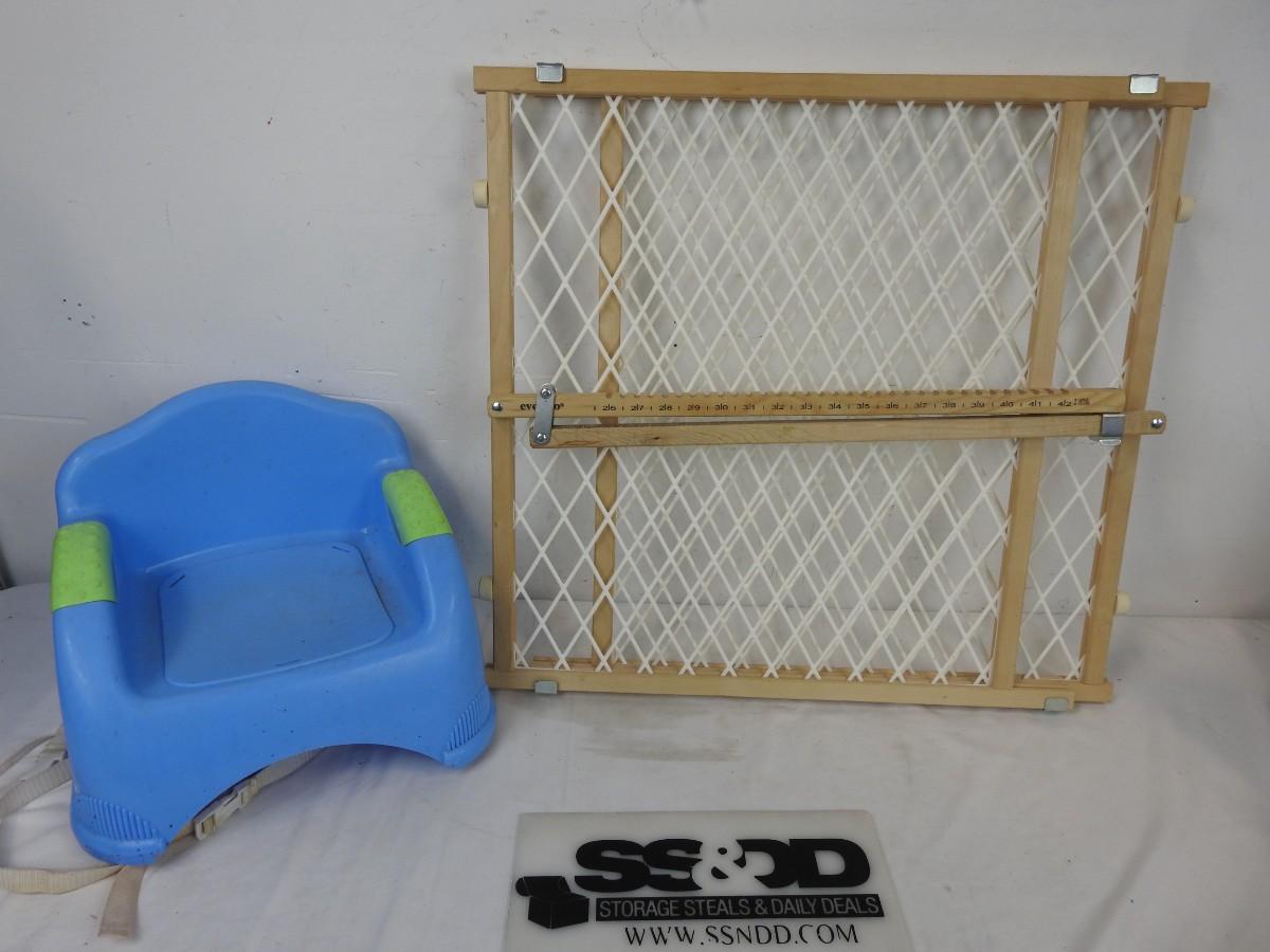 Blue Plastic Booster Seat and Wooden Pet Gate