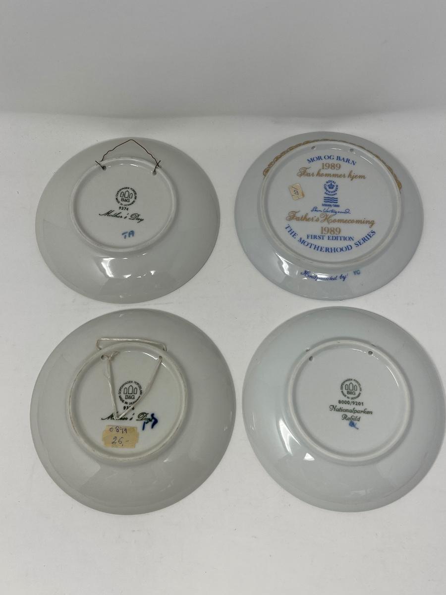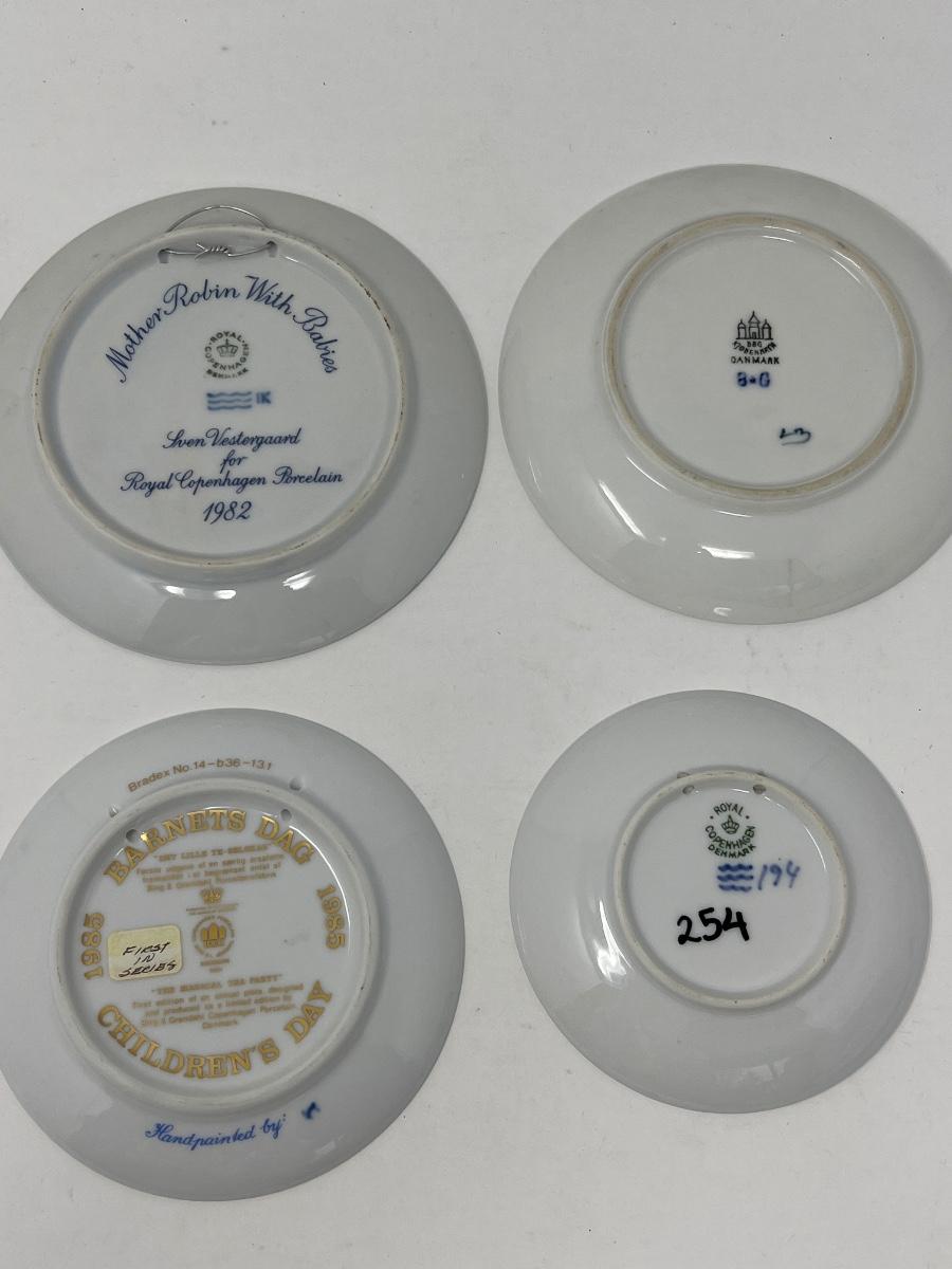11 blue and white Denmark and Holland porcelain plates/plaques. Range from 4.5” to 7” round. See pictures for information about each plate..