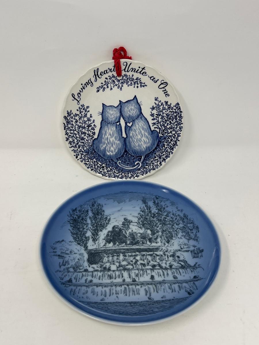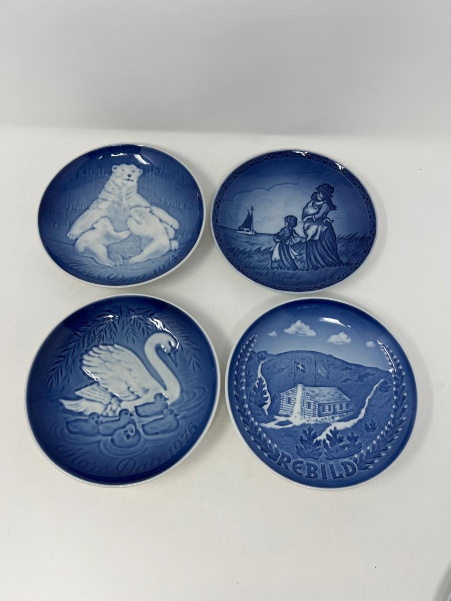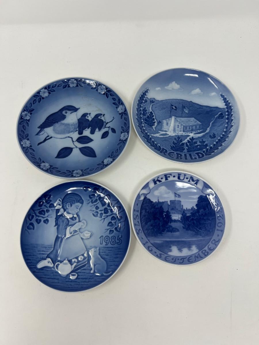 11 blue and white Denmark and Holland porcelain plates/plaques. Range from 4.5” to 7” round. See pictures for information about each plate..