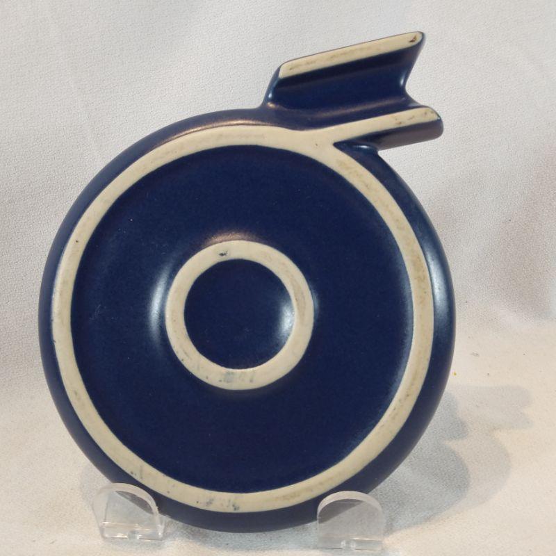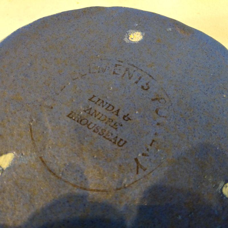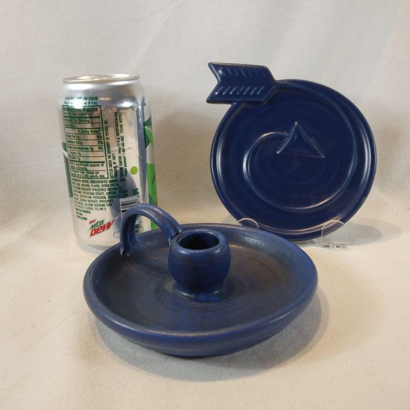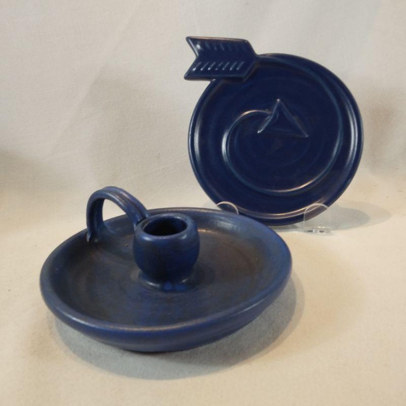 This offering is for two very nice pieces of deep royal blue pottery. A matte glazed nappy candlestick holder, marked on bottom with a nearly illegible stamp - ?? Pottery - Linda and Andre Brousseau. It is 5 1/4-inches in diameter. The arrow trivet is unmarked - but very cool indeed. It is 6 1/4-inches X 5-inches.